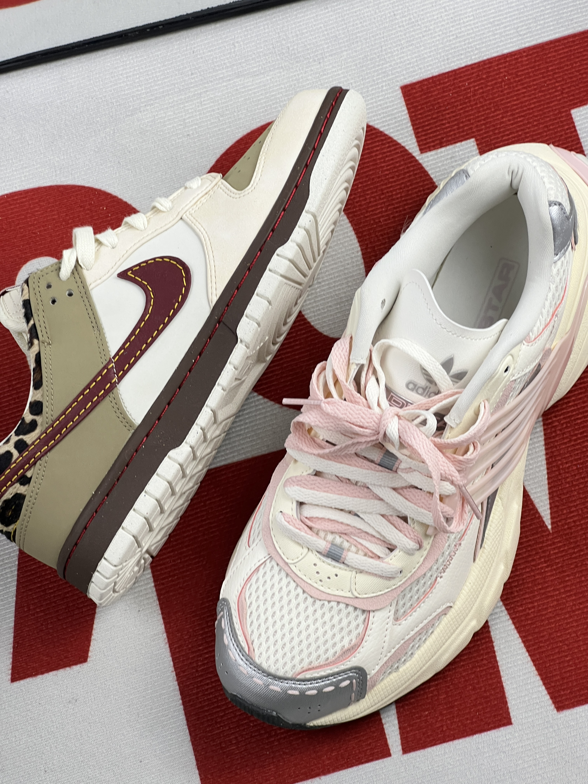 左边这双Nike Dunk Low Retro,低帮板鞋型,脚感是板鞋里偏舒服的那种,不会硬得硌脚。配色里的豹纹细节很酷,也不突兀,秋冬季节穿正合适,搭日常的裤子不挑风格,穿了小半个月,鞋面没太显脏,打理起来不麻烦。 右边的adidas ADISTAR XLG,是偏轻的老爹鞋,鞋身透气网布夏天穿没那么闷脚,鞋底的防滑纹路日常走湿路也稳。鞋型看着厚但不压个子,配宽松裤型刚好。 这两双价格都没超预...