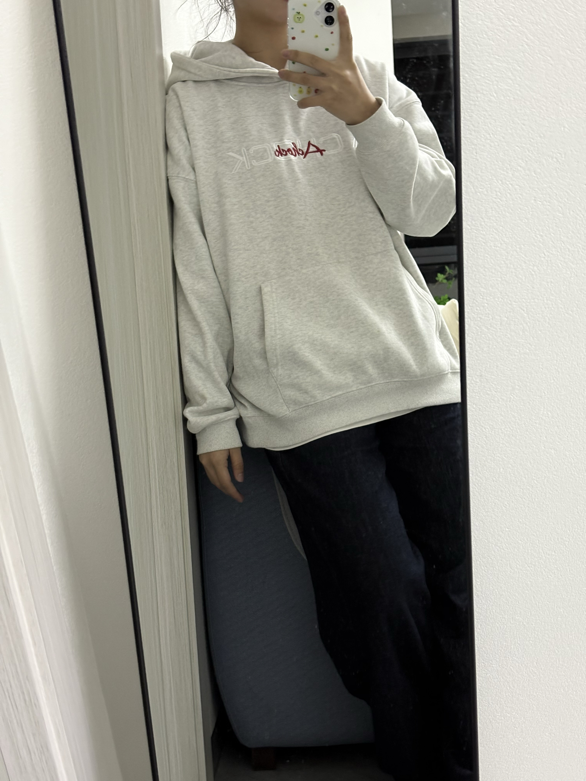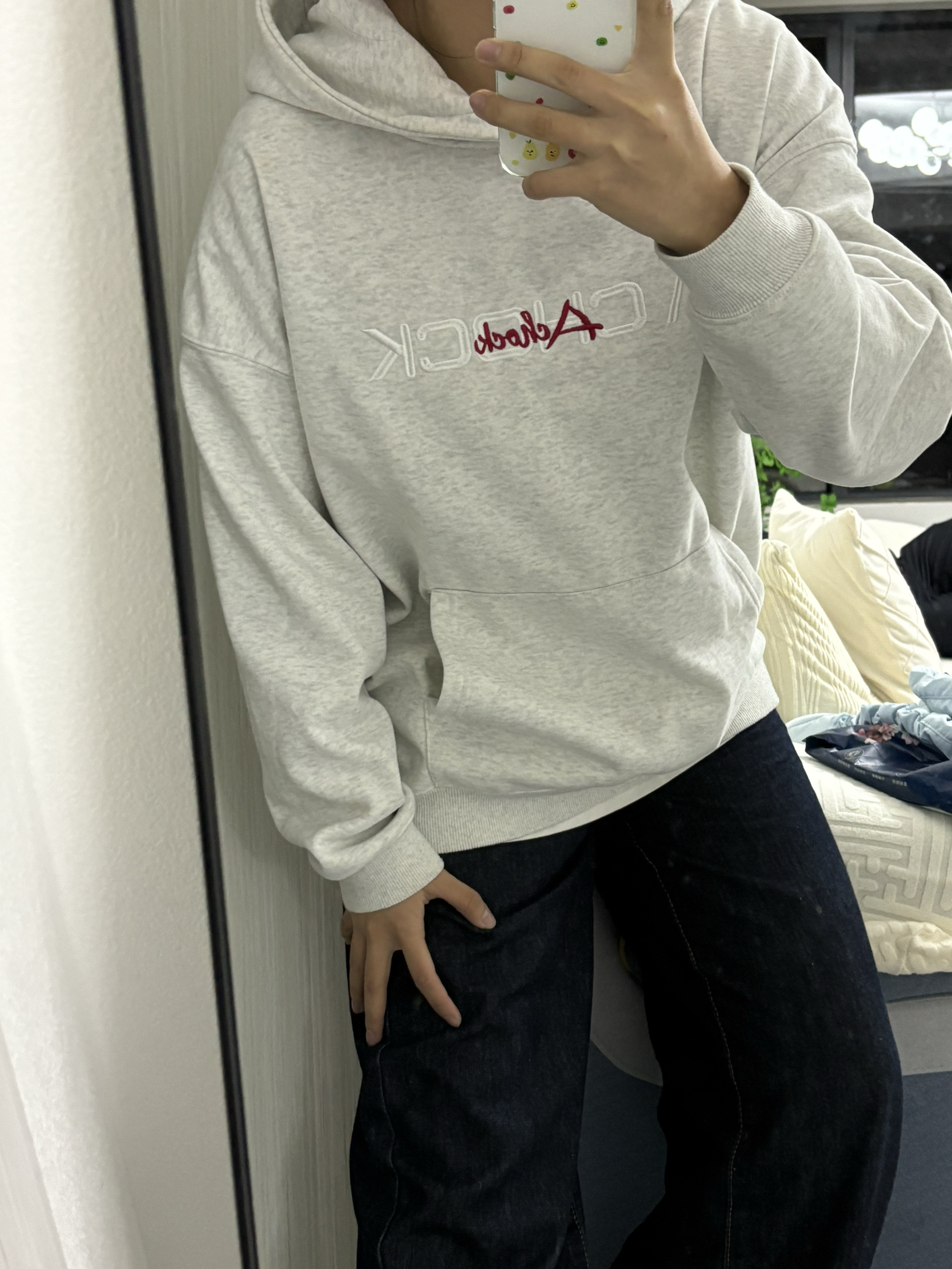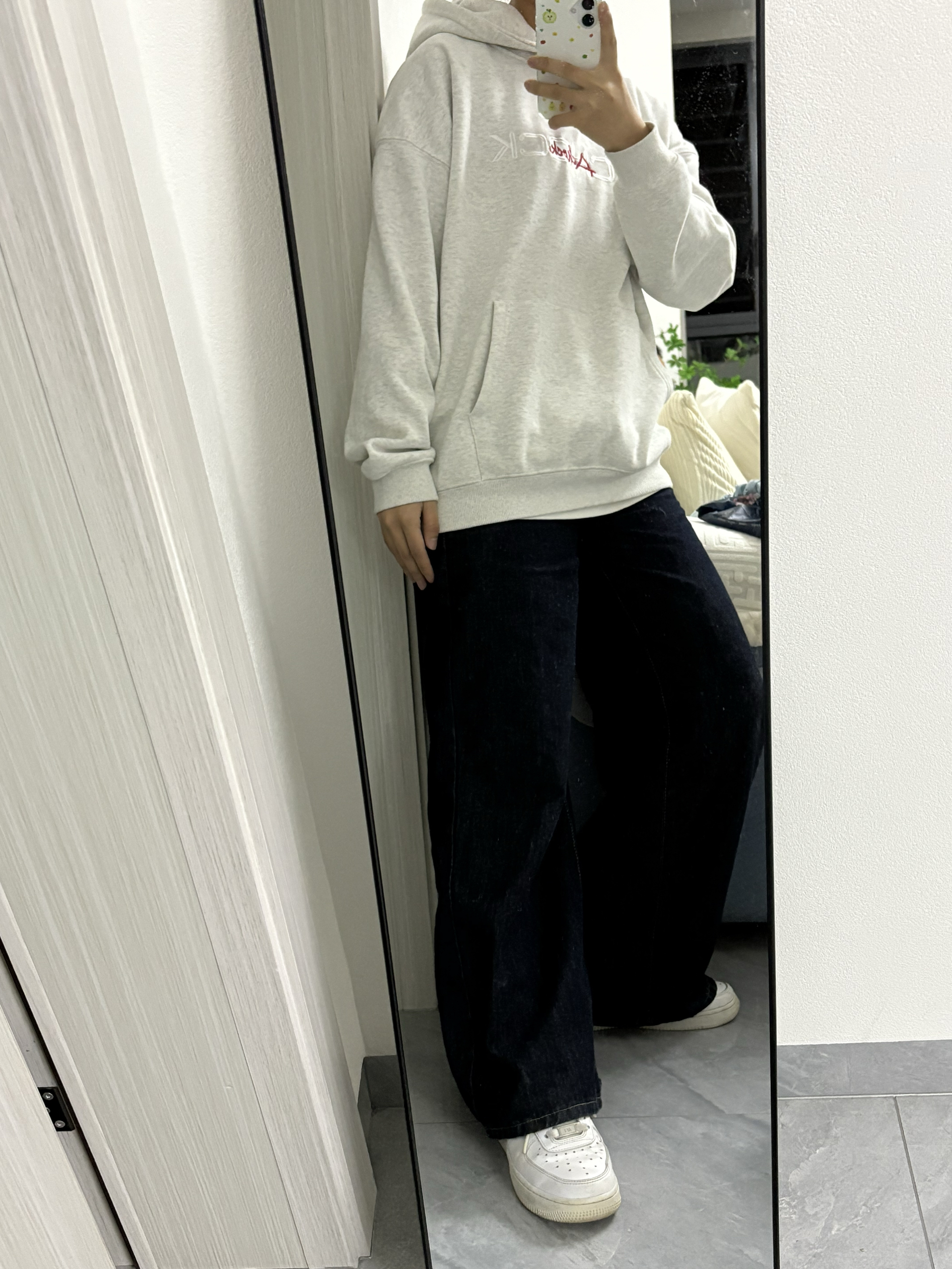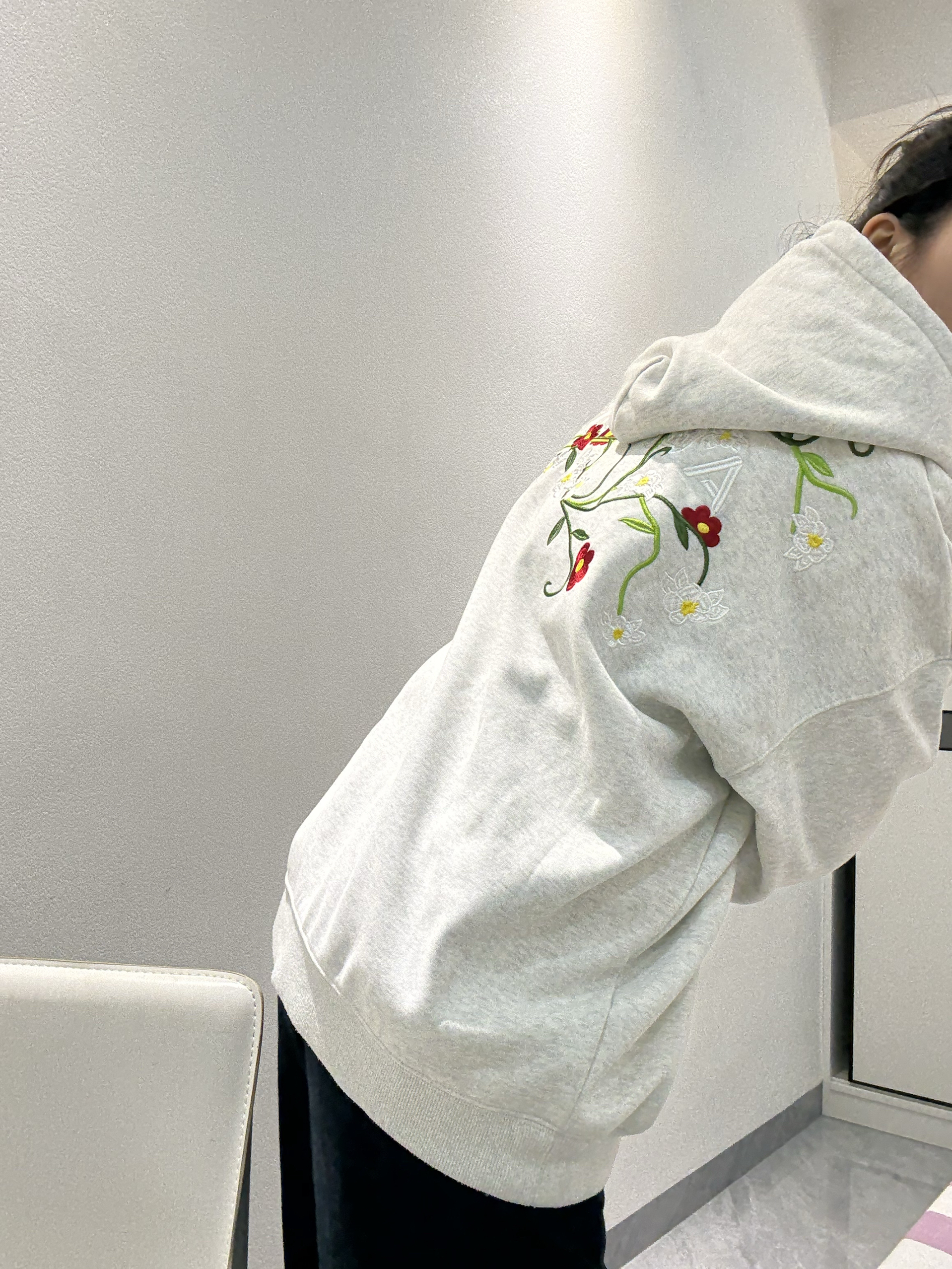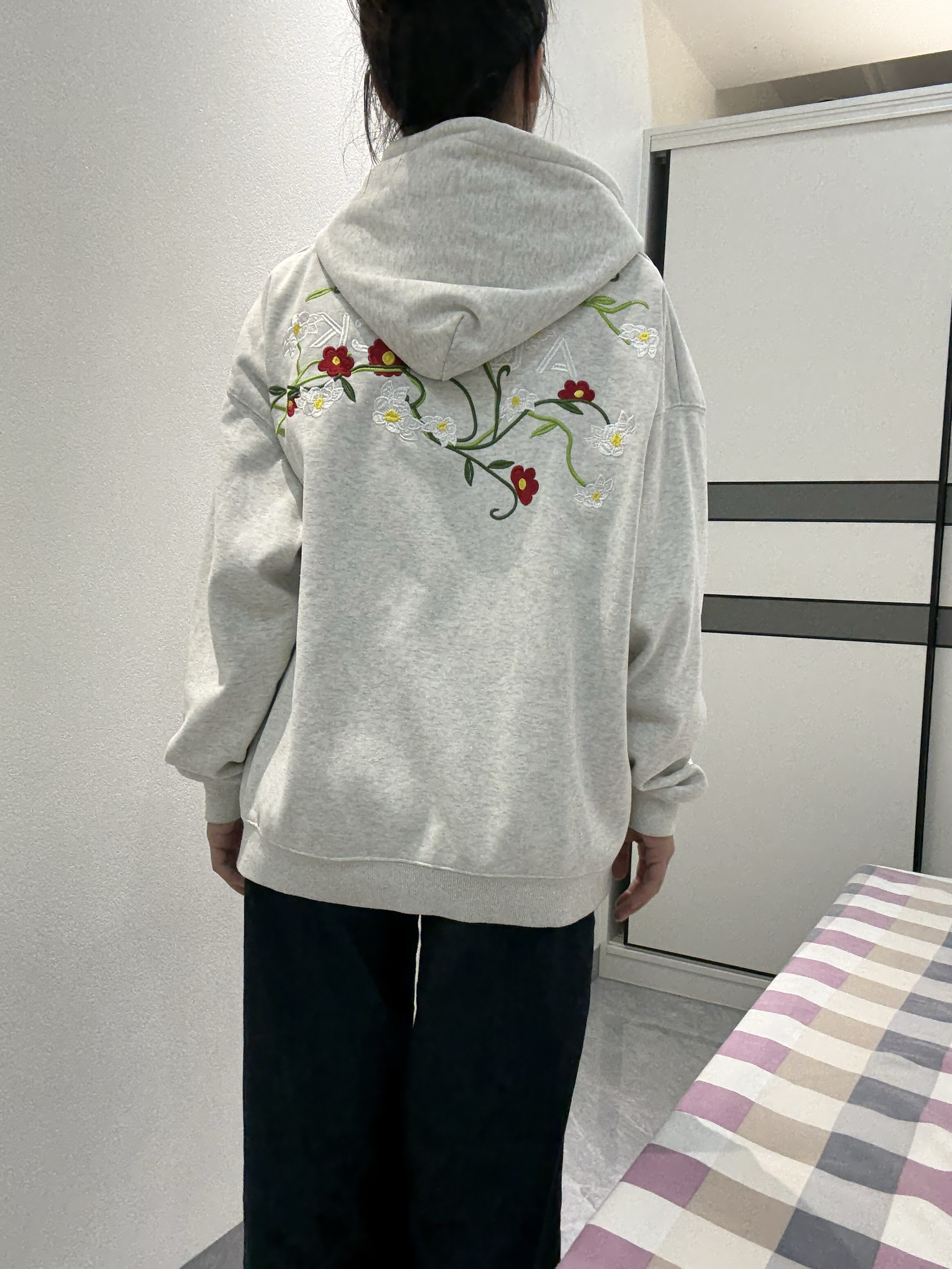家人们快来看!A chock这件连帽卫衣真的绝绝子!前面字母刺绣简约又有格调,后背的花卉刺绣直接杀疯了,细节控狂喜! 搭配深色阔腿牛仔裤和白色板鞋,休闲随性还显高级,日常出街这么穿,舒服又有范儿,咱就是说一整个被这慵懒美式风拿捏住了!