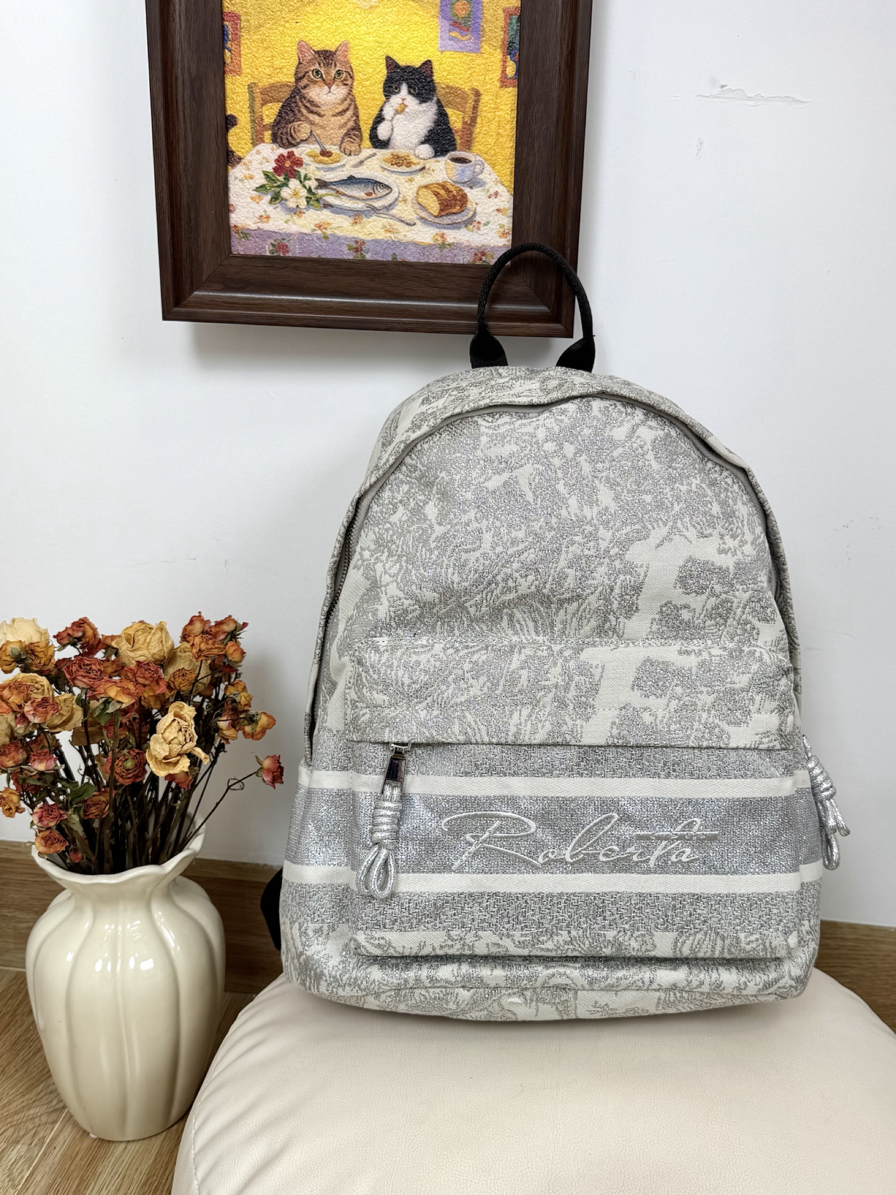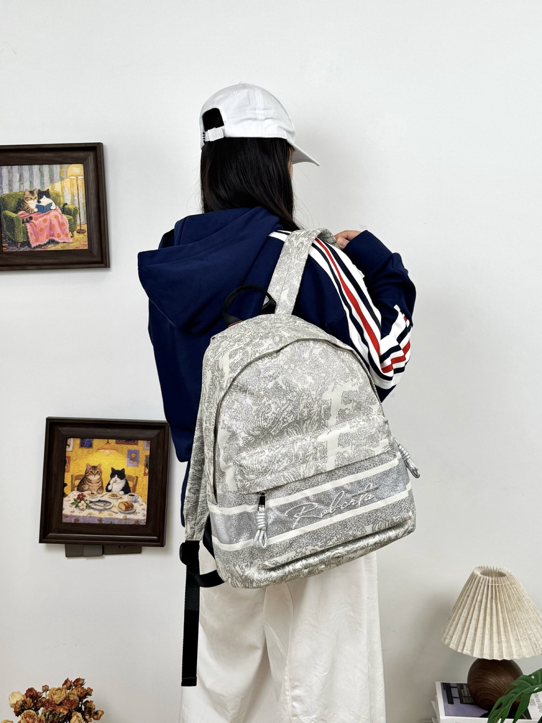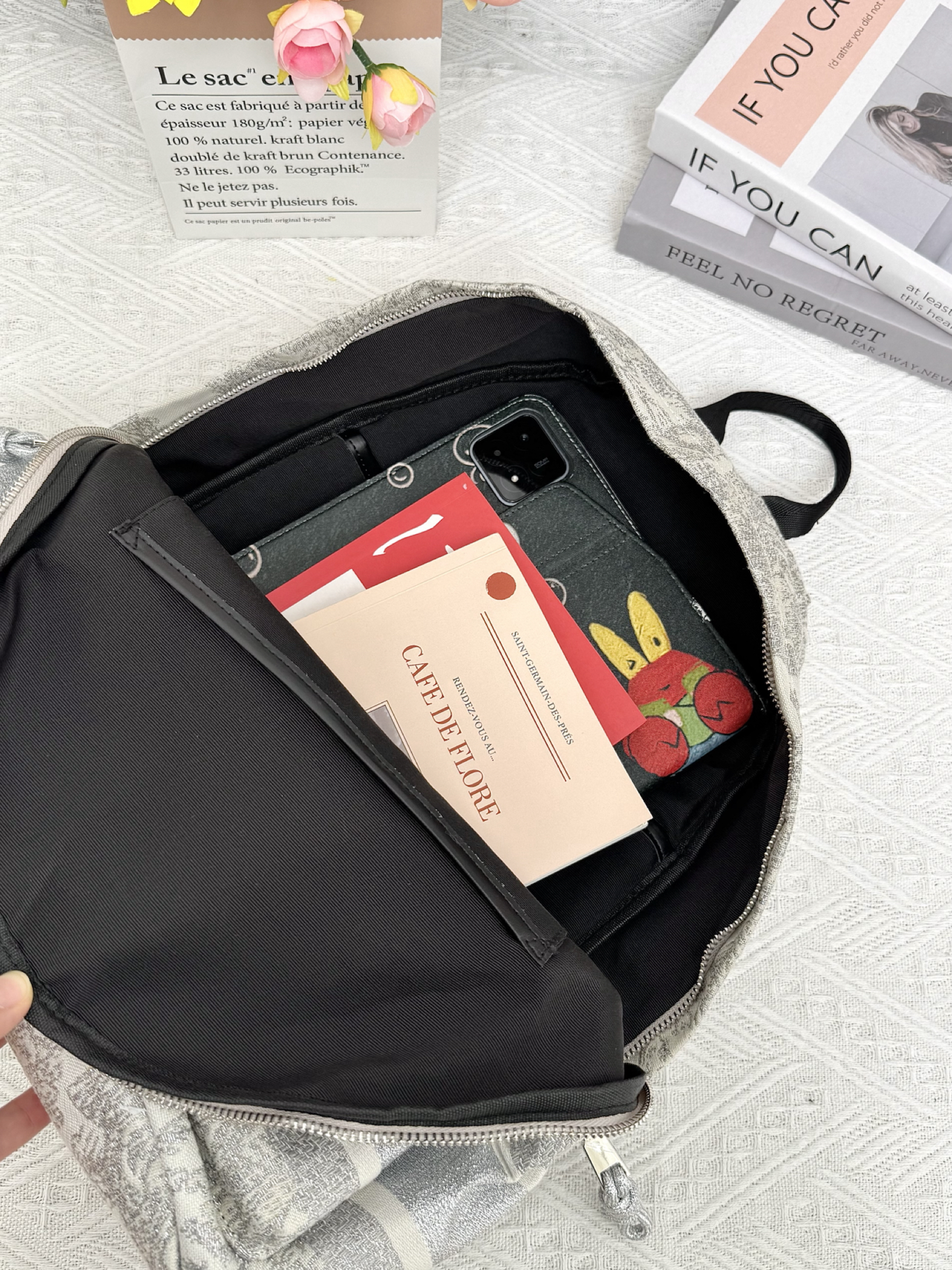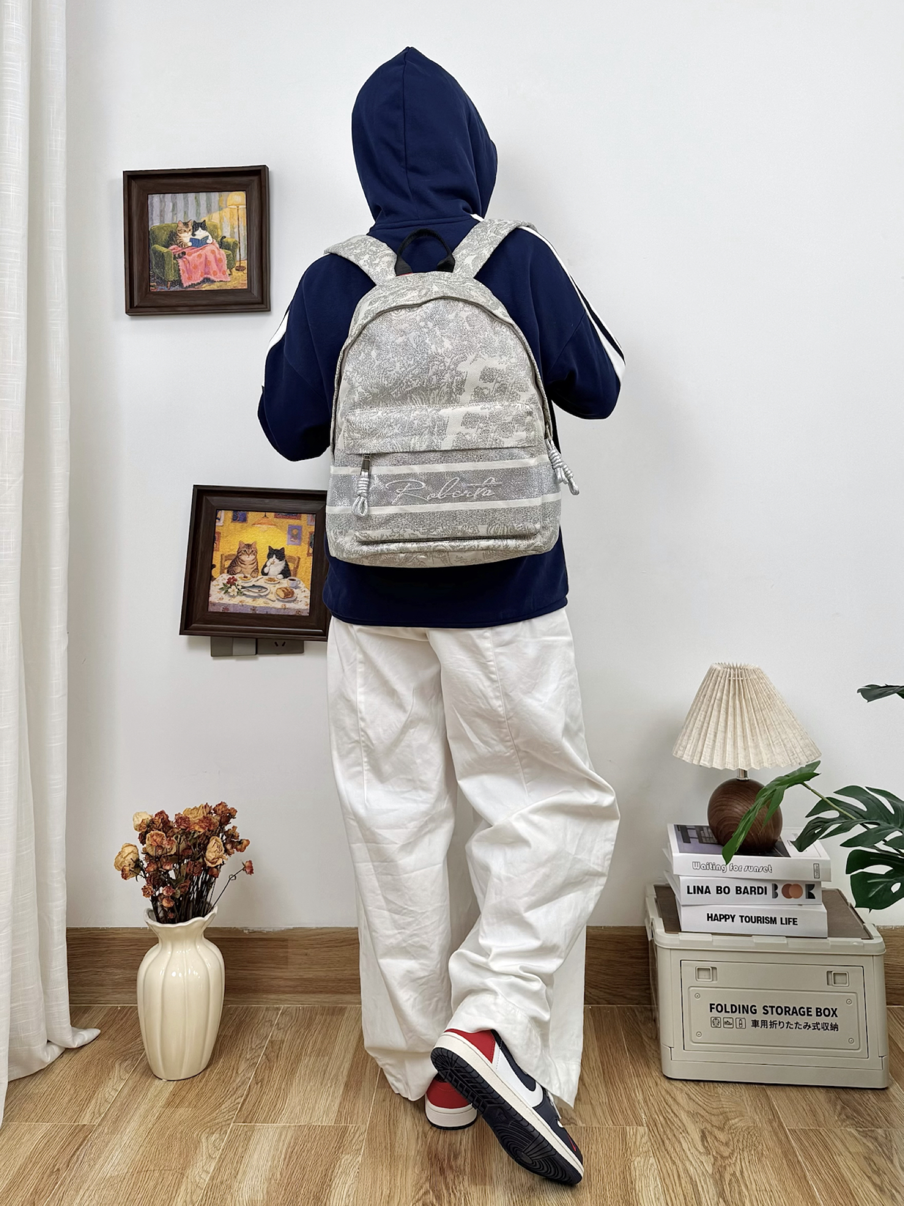 hin吸睛日常就爱这种少年感满满的潮搭~ 今日这套运动风look太有学院时髦范儿啦✨ 藏蓝条纹连帽卫衣 + 白色阔腿裤 活力又随性 👟 出街主打清爽少年感 搭配 #诺贝达Roberta di Camerino 这款米白提花双肩包 复古提花设计绝绝子 与今日穿搭适配度满分🌷 包包容量很可 装下笔记本、潮玩小物、随身零食完全无压力 颜值与实用性双在线🧏🏻♀️ 这种少年感满满的搭配 日常出街背它既出片...