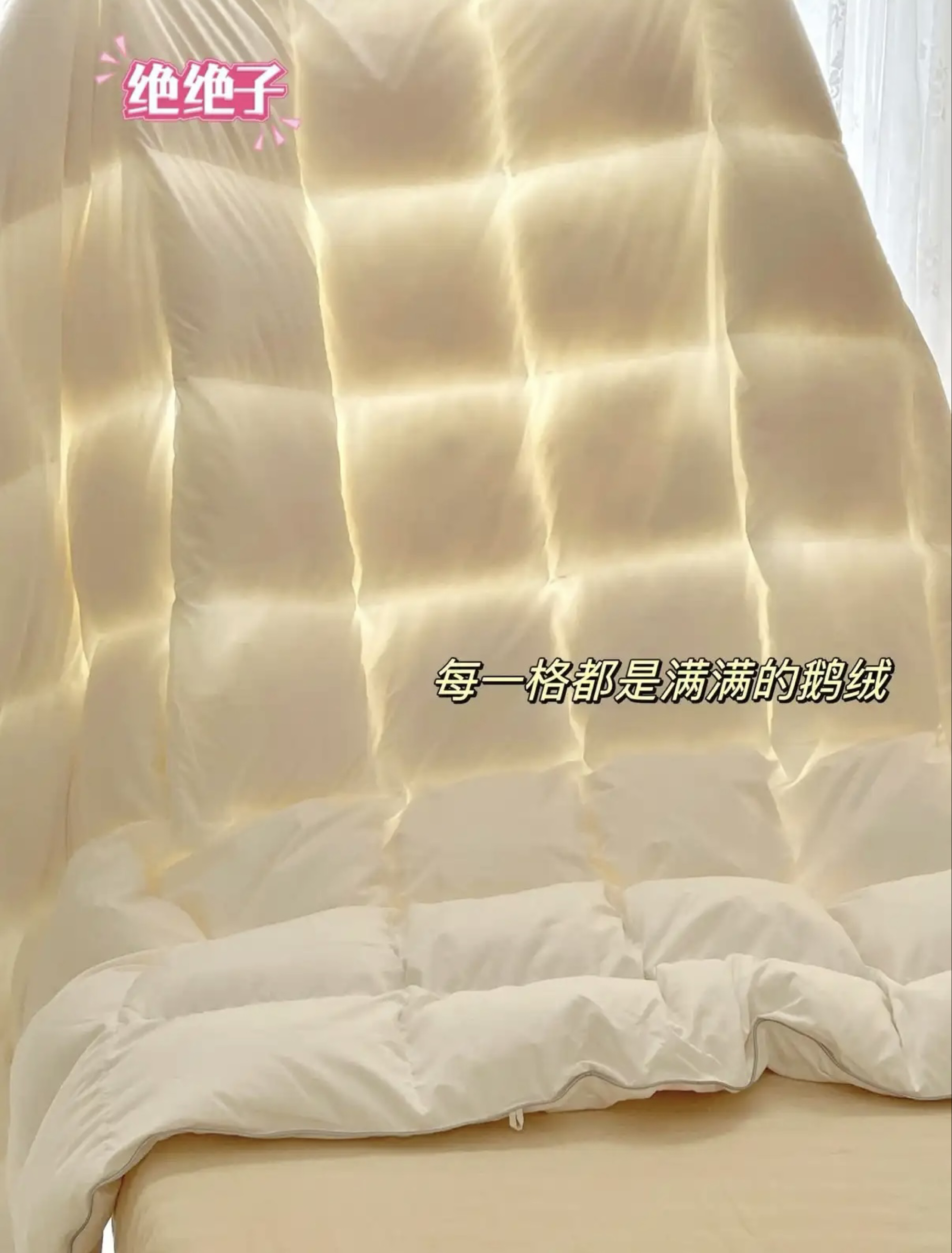 对床品和被子的选择一直有自己的执拗一方面喜欢皮肤与床品大面积的接触一方面也希望被子在保暖的同时是轻薄舒适的这个秋天解锁了鹅绒被我宣布请把我和鹅绒被原地锁死-刚开始拿到被子会比正常来说扁一些睡个几十分钟鹅绒感受到了体温变得蓬松被芯里的格子一个个鼓囊囊的整个被子就嘭起来啦完全没有传统被子的厚重感-大湖南突然升降10多度的反常气温它也能搞定95%的含绒量保暖的同时也没有传统被子的闷湿大朵的鹅绒透气棒棒哒...