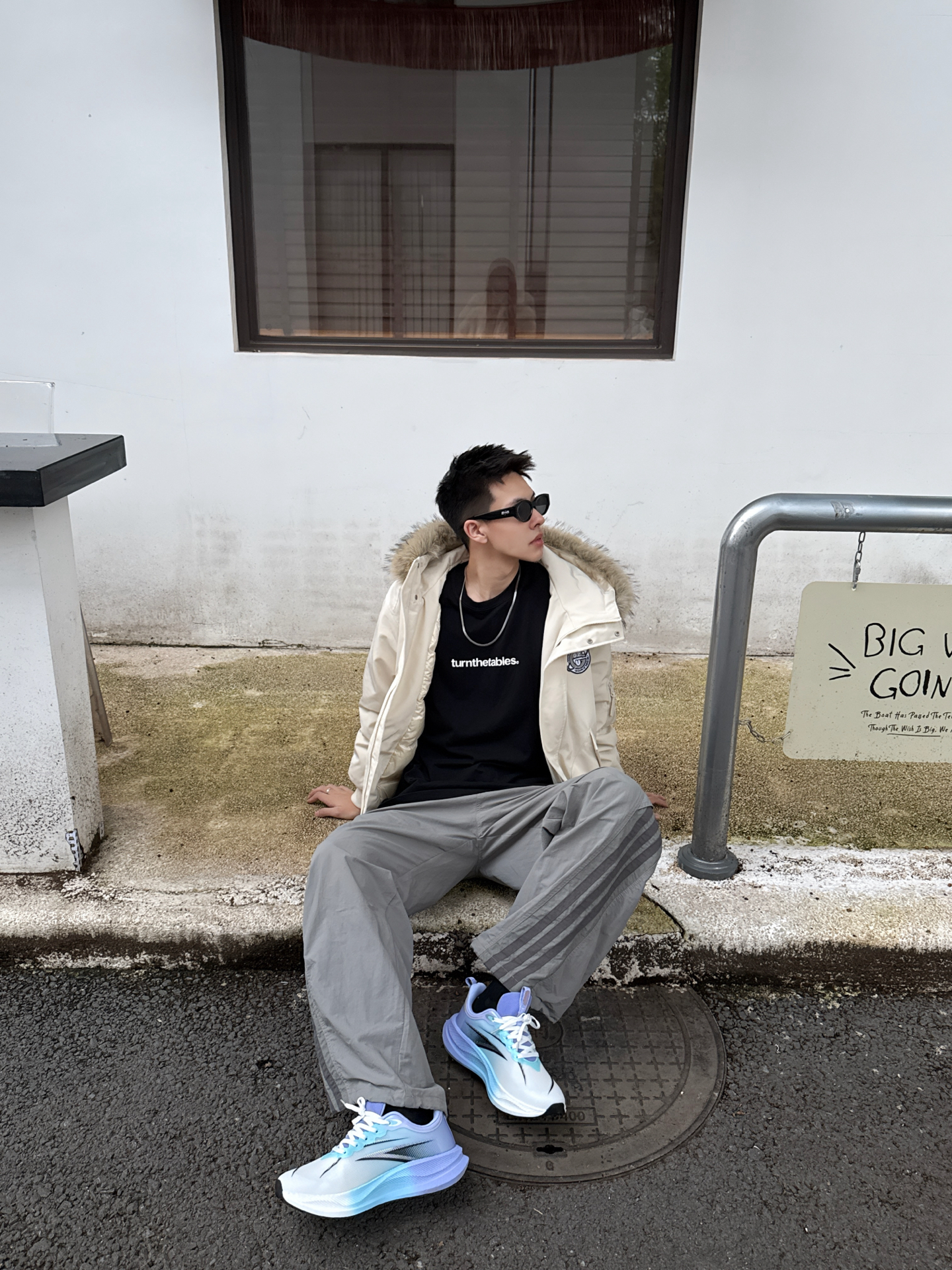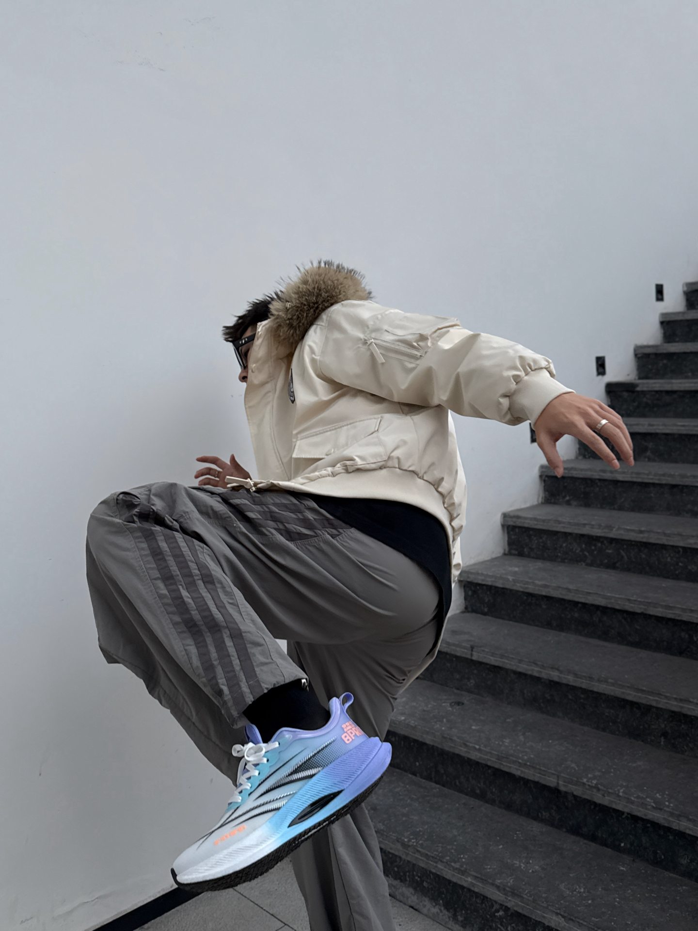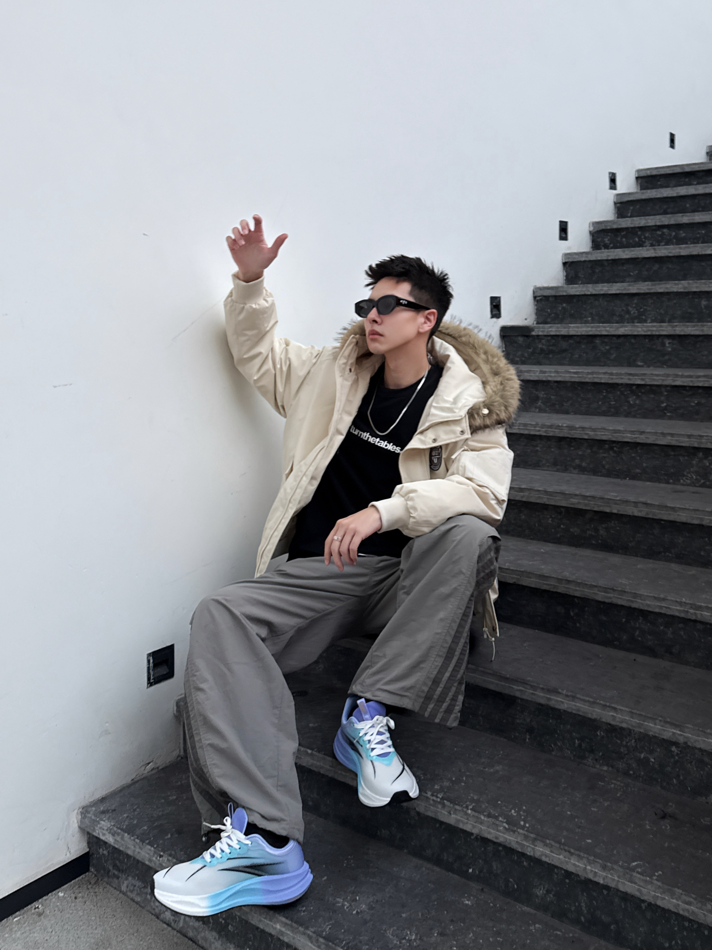 家人们快看👀 这套穿搭真的把高级感和舒适度焊死了! 米白色毛领外套保暖又洋气,内搭黑T简单又有细节~ 灰色阔腿裤的条纹设计绝绝子,裤型宽松到走路带风💨 重点是这双 #Stateof Stars 蓝白渐变的运动鞋👟,配色也太戳我了,上脚轻到像没穿一样,日常出街或者运动穿都很可! 戴个墨镜🕶️,随性往那儿一坐就很有范儿~ 喜欢小众风格的兄弟,这套闭眼穿不踩雷!🔥 #stateofstars #S...