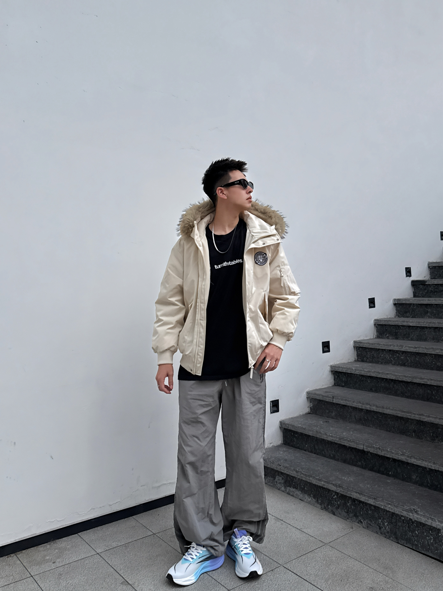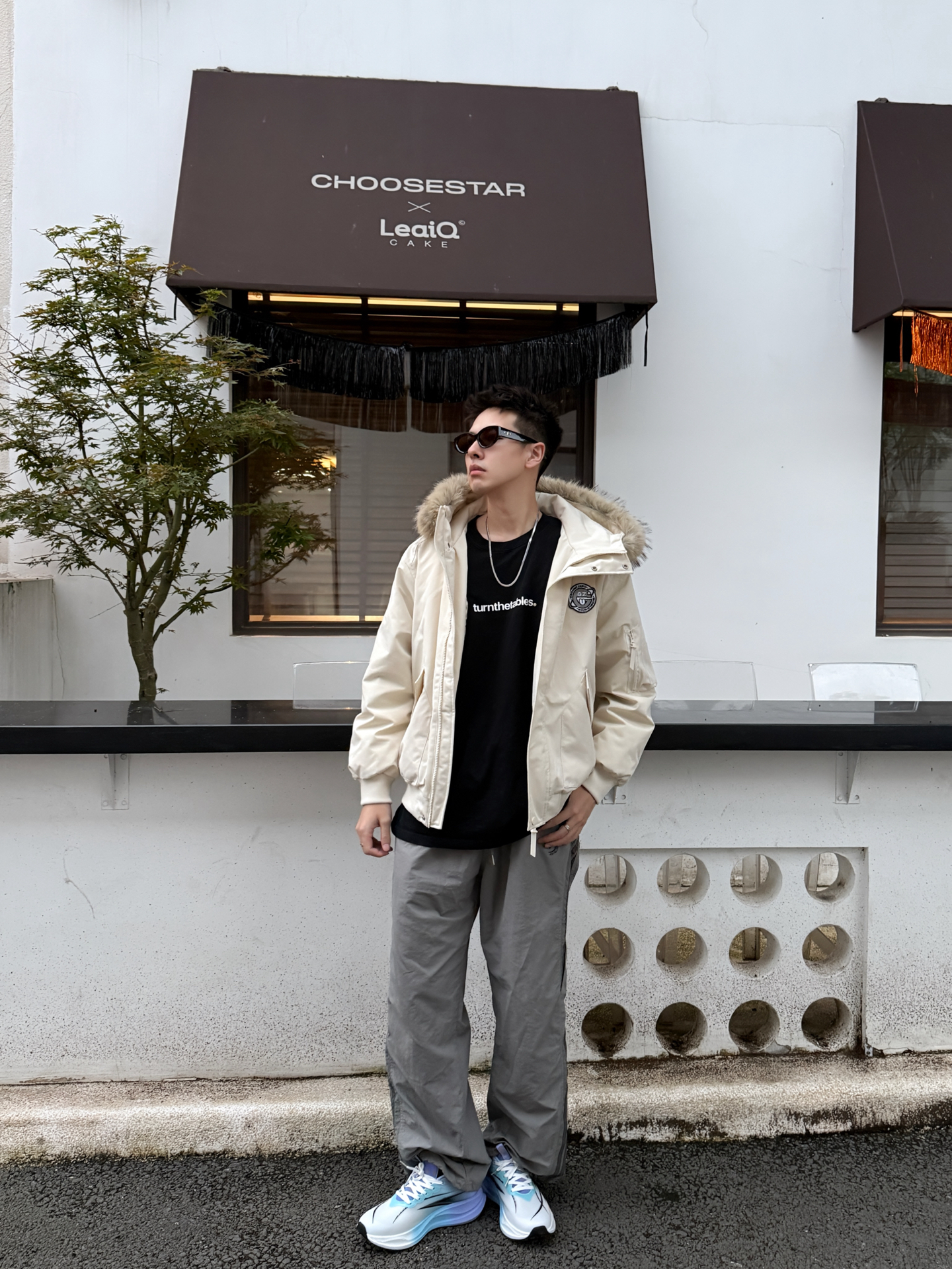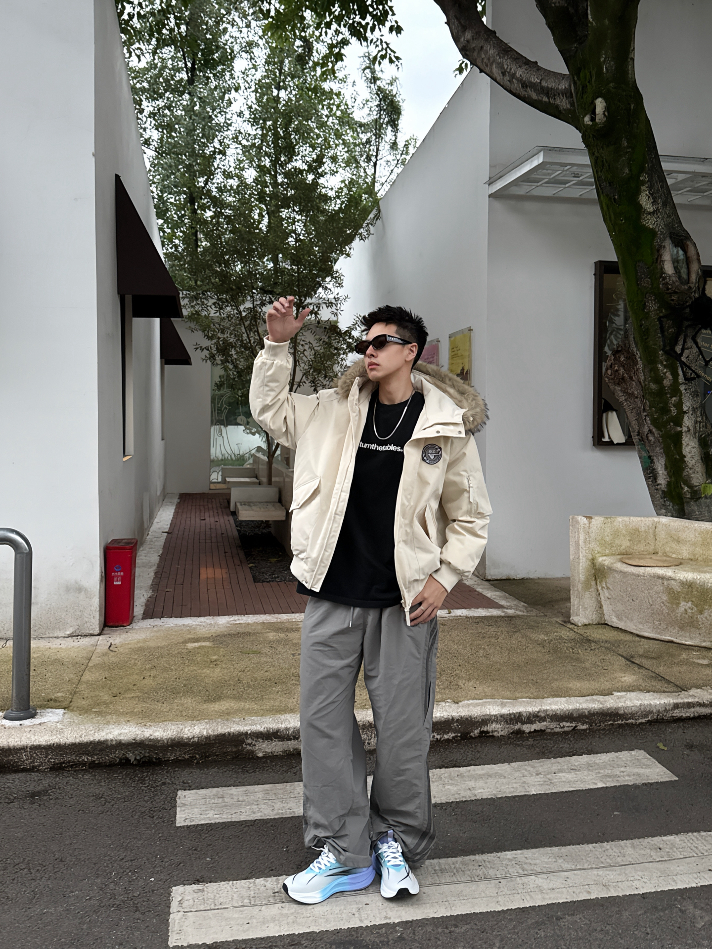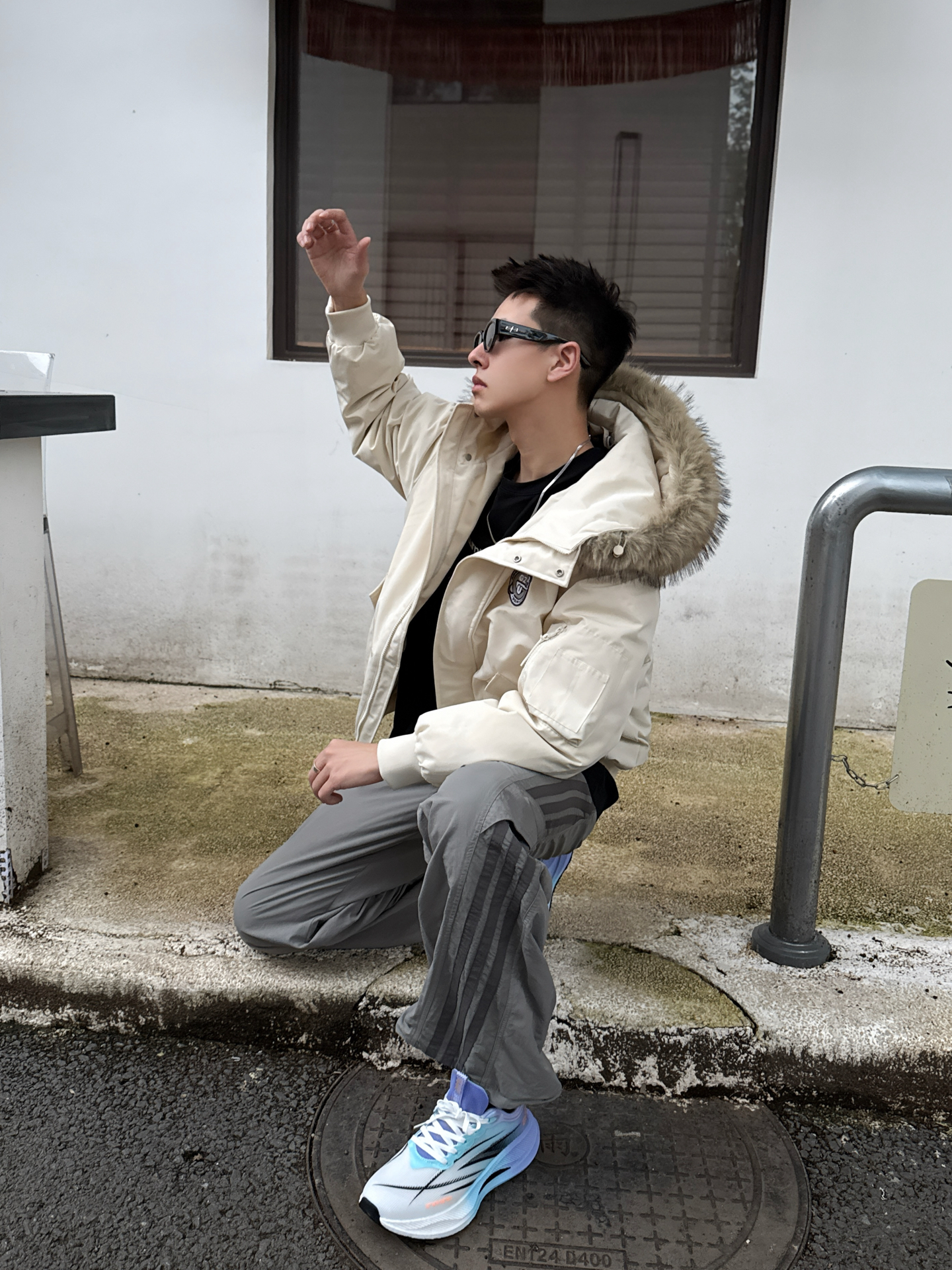 家人们快看👀 这套穿搭真的把高级感和舒适度焊死了! 米白色毛领外套保暖又洋气,内搭黑T简单又有细节~ 灰色阔腿裤的条纹设计绝绝子,裤型宽松到走路带风💨 重点是这双 #Stateof Stars 蓝白渐变的运动鞋👟,配色也太戳我了,上脚轻到像没穿一样,日常出街或者运动穿都很可! 戴个墨镜🕶️,随性往那儿一坐就很有范儿~ 喜欢小众风格的兄弟,这套闭眼穿不踩雷!🔥 #stateofstars #S...