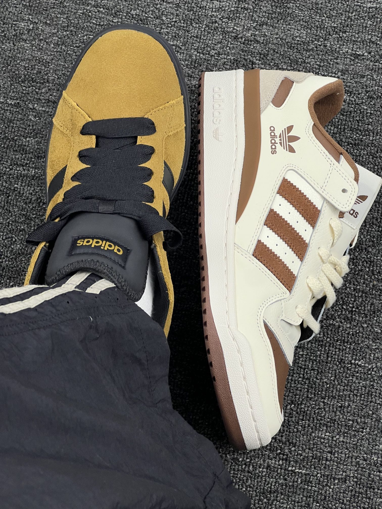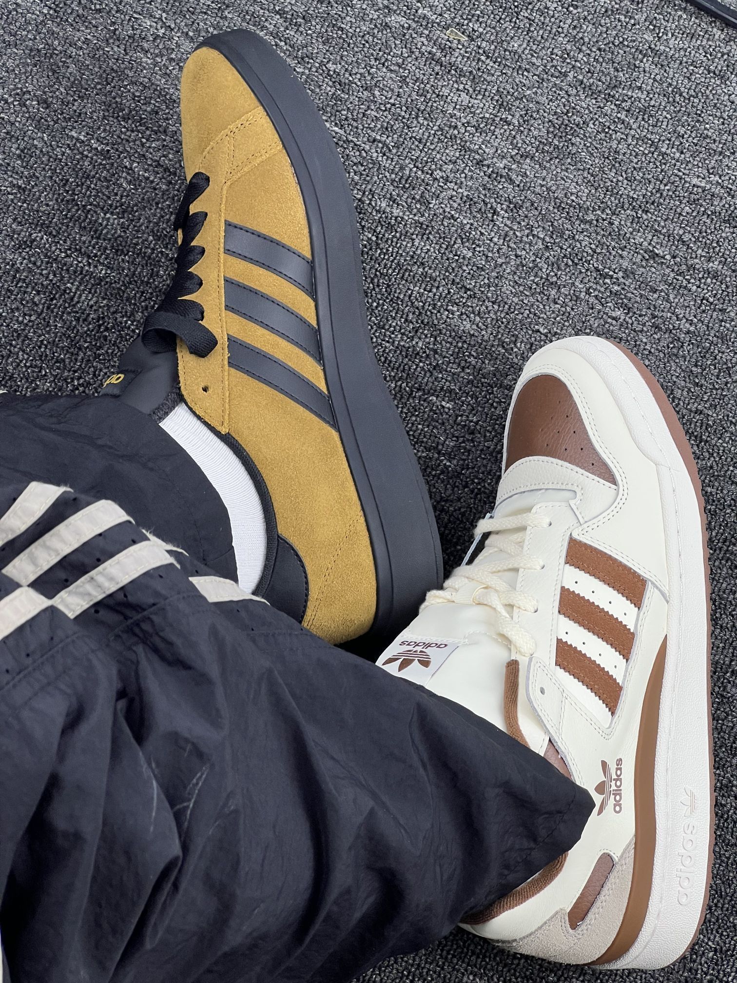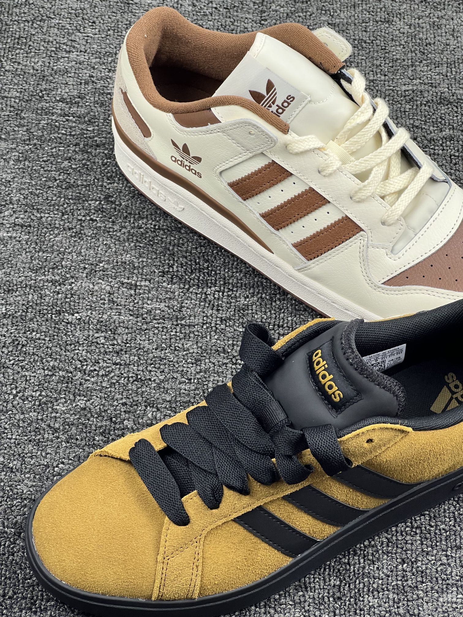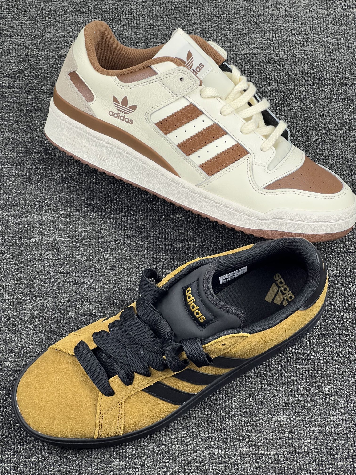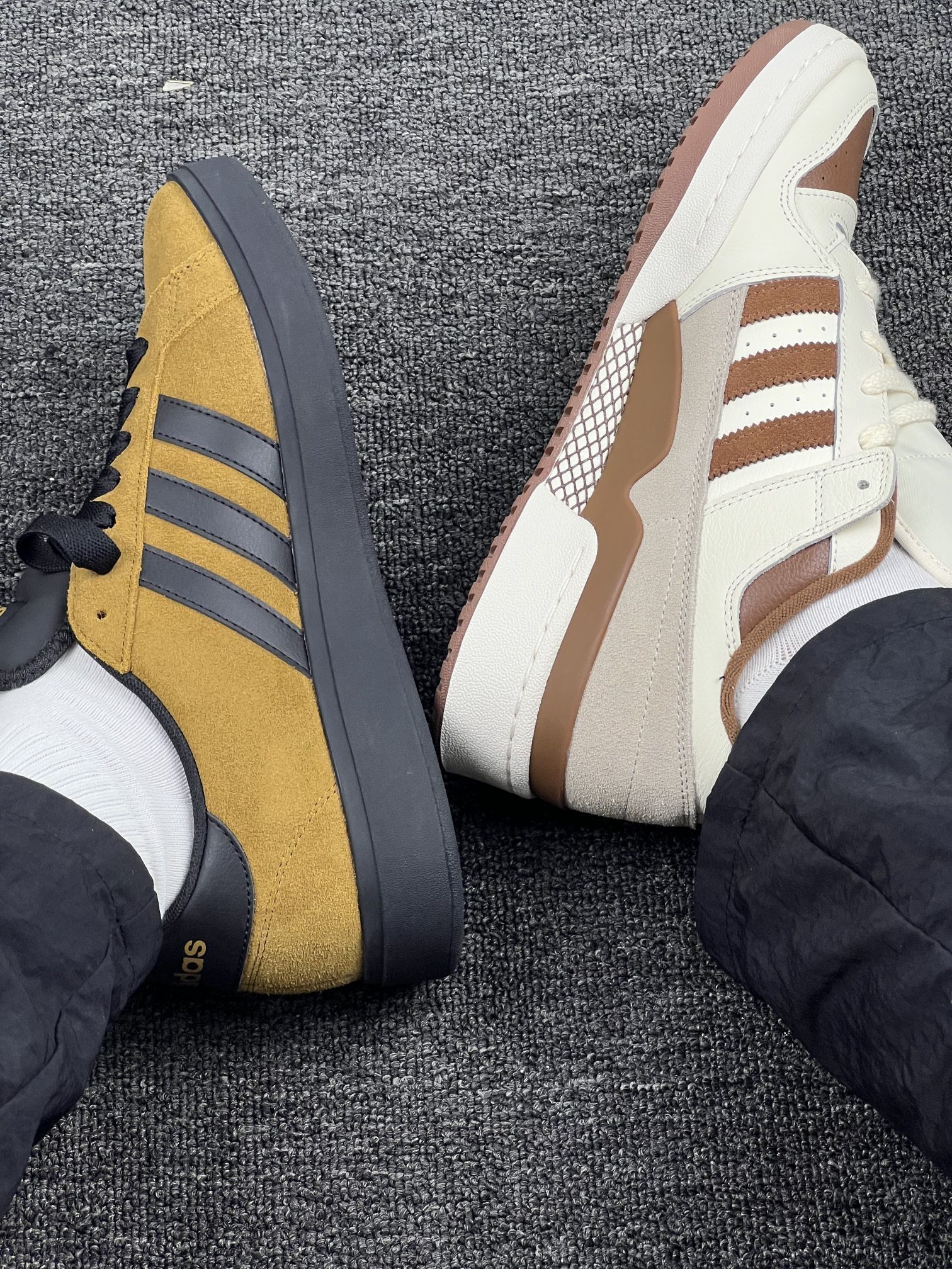 入手这两双阿迪鞋有一阵了,来聊聊真实感受。 先说白棕那双,皮质看着挺有质感,搭配起来也百搭,日常通勤穿很合适。但有个小问题,刚穿那几天,鞋帮有点磨脚踝,得穿厚点的袜子才舒服😔。 再说说黄黑这双,翻毛皮材质摸着很有手感,配色也比较特别。不过它不太耐脏,稍微沾点灰就看得很明显,打理起来得费点心思🤨。 两双鞋的舒适度都还行,长时间走路不会太累,但也没到特别惊艳的地步。总之,要是你喜欢它们的颜...