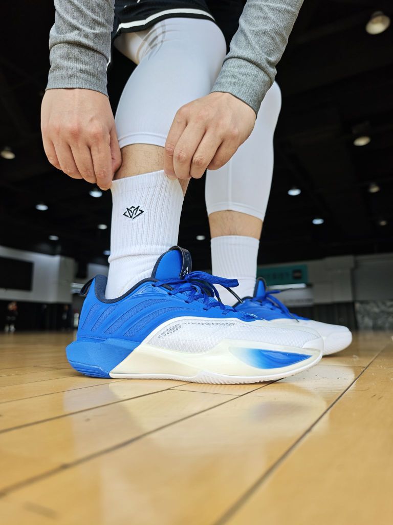 黑白脉冲条顺着脚踝线条走,配DVD4很帅,热身时裤脚一撩,速度感直接拉满——这颜值往野球局一站,连对手都问链接✨。 打满第四节快攻突破,脚背那块一直是凉的,网纱透气是真顶;急停变向时脚底板像粘在鞋里,加厚纹的抓力够稳;抢板落地那下,脚踝的缓冲能卸不少震感。打完40分钟袜口还贴得死死的,支撑和回弹都没垮,这体验直接把“打球刚需”焊死了🏀