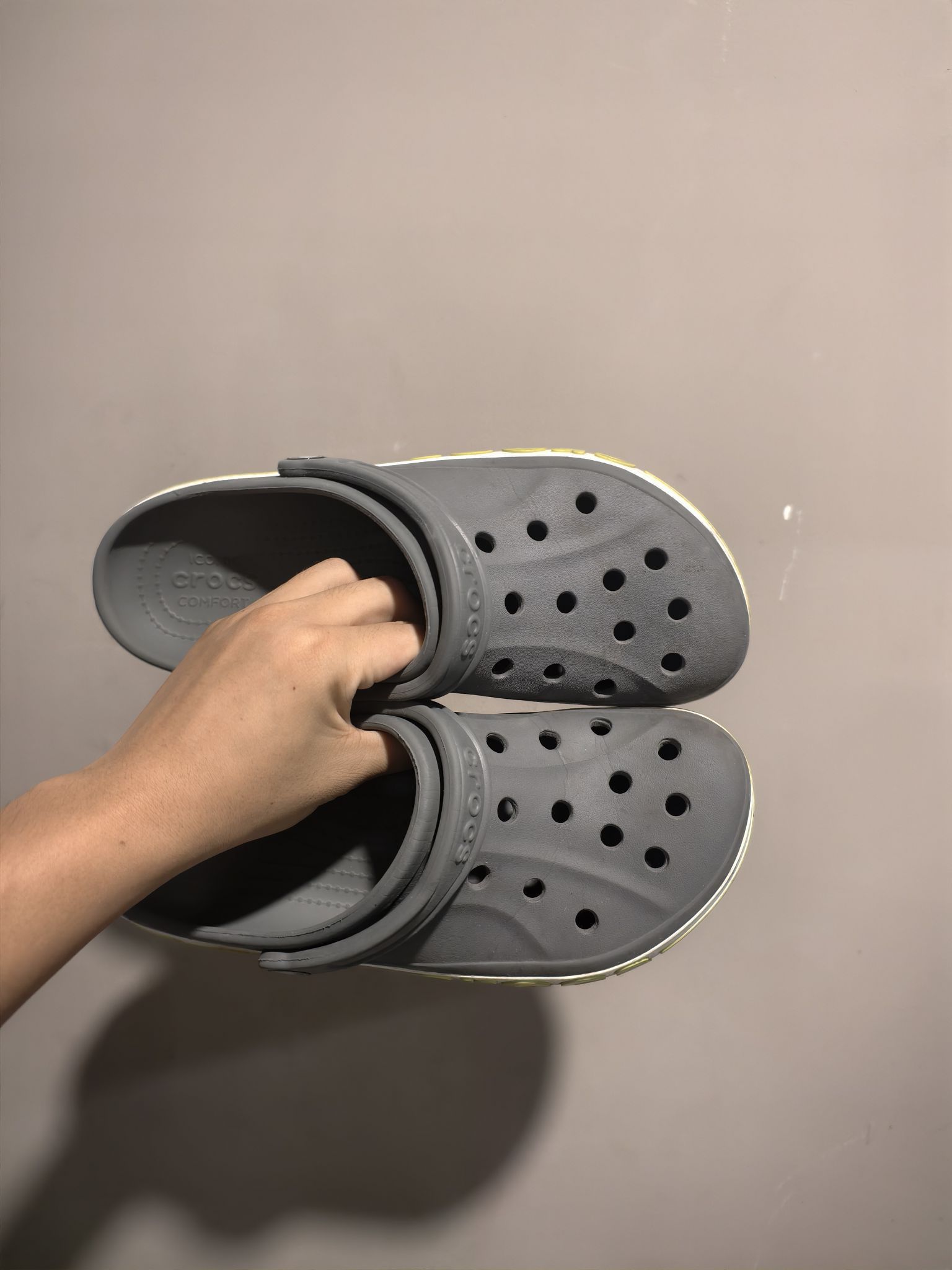 这款洞洞鞋真的很好看,灰绿配色十分百搭,鞋身透气,穿着舒服,而且很耐磨,本人穿了一段时间了都没有什么磨损,尺码方面也是选择正常尺码即可身高|体重: