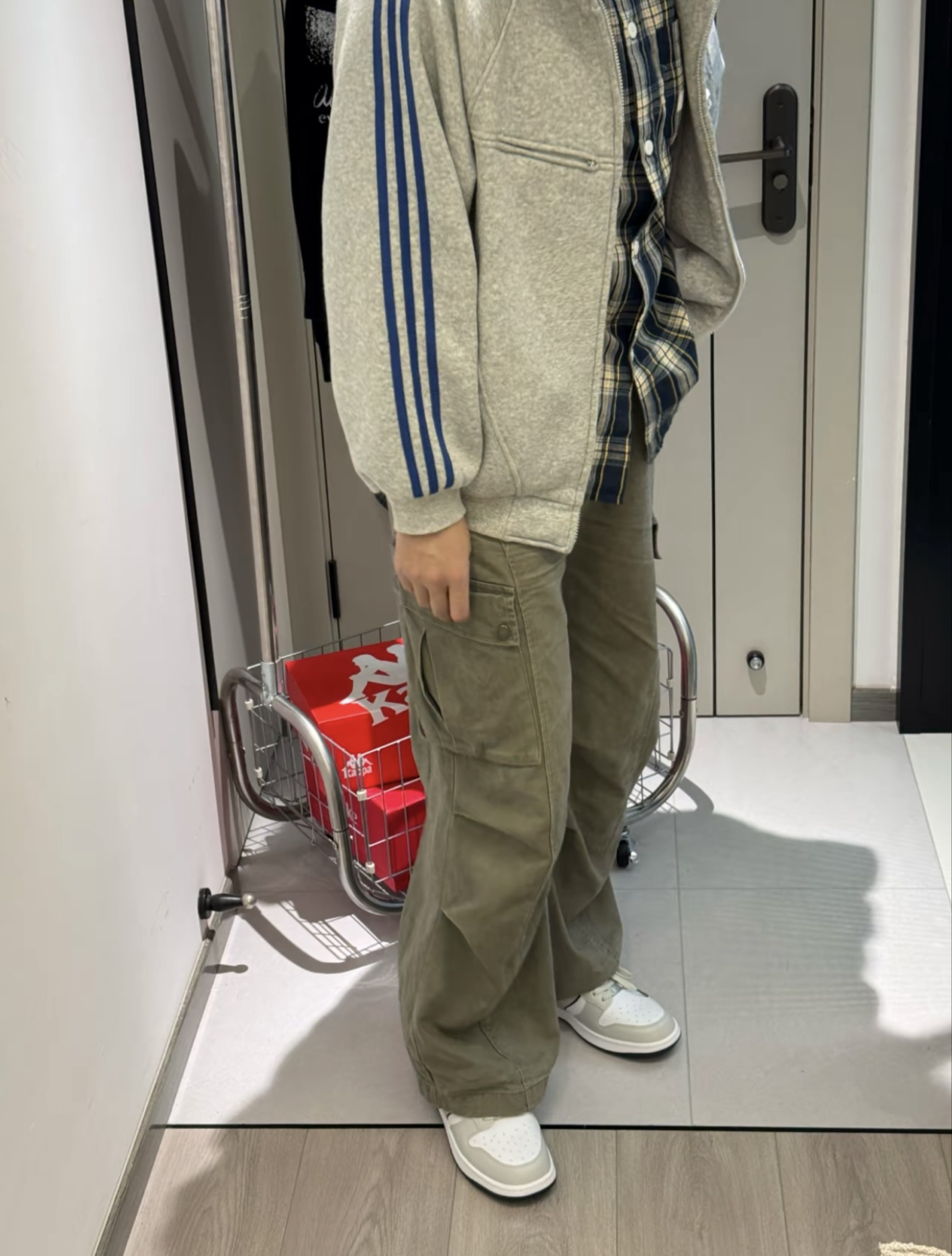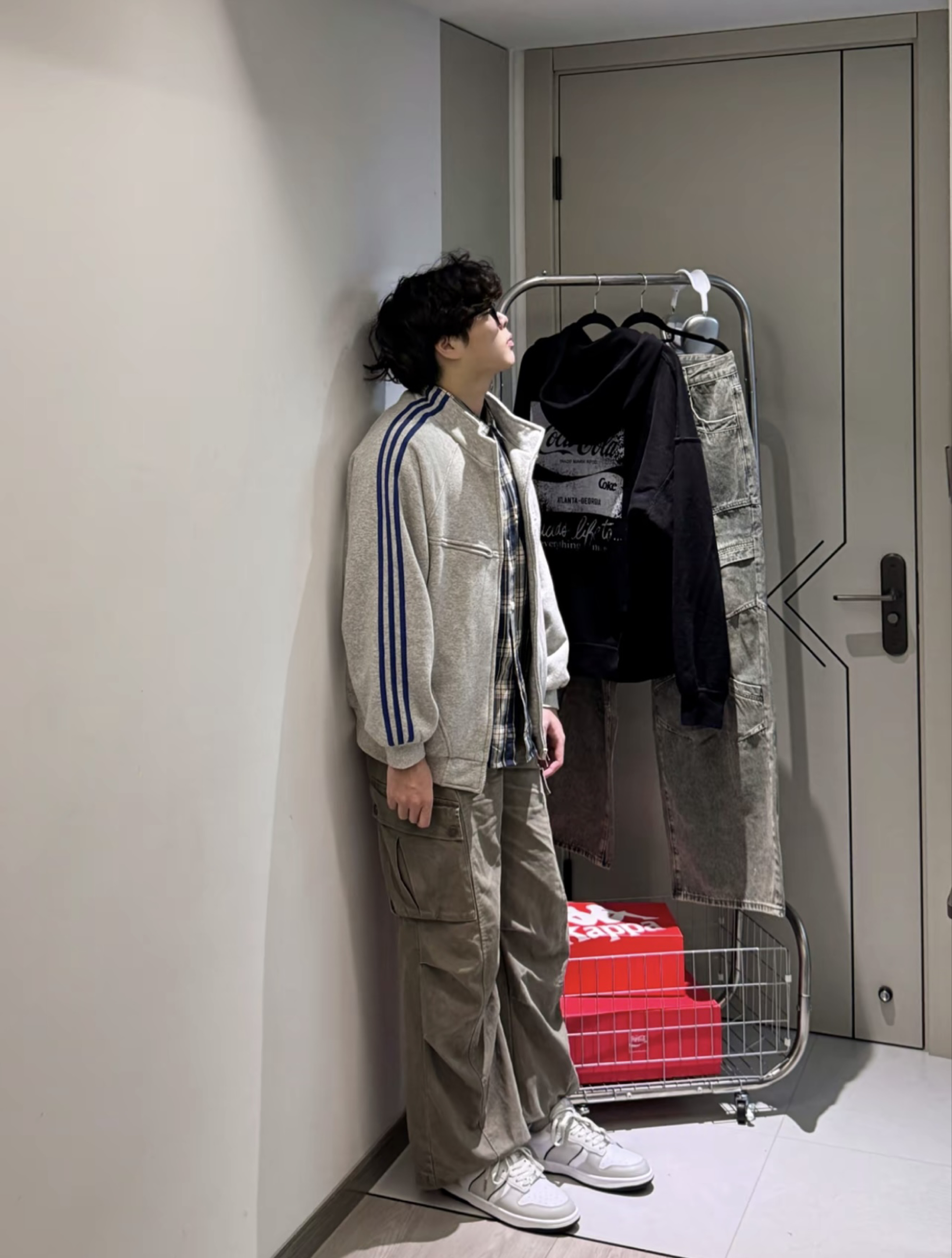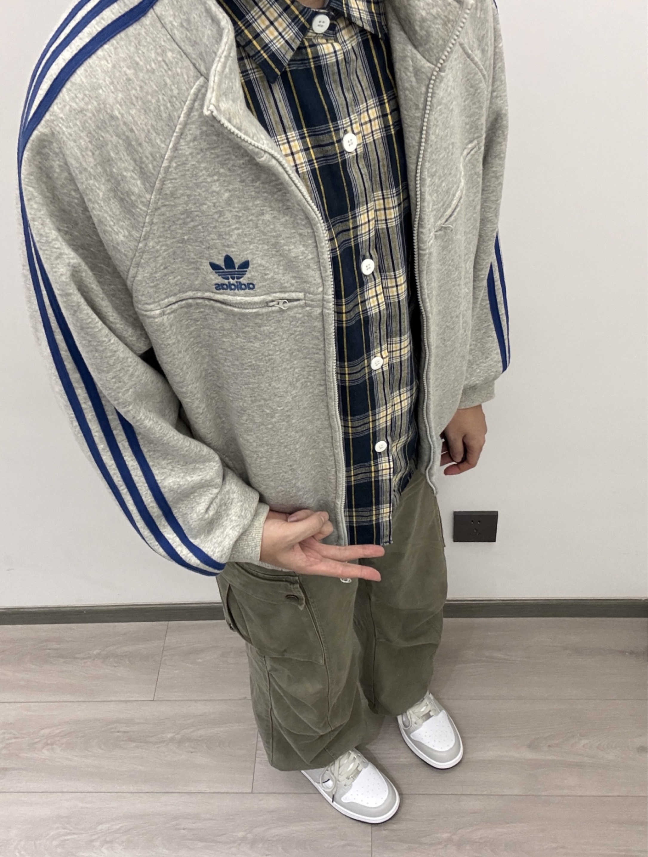 ❤️ 穿搭的质感局 很难不爱灰色系的高级感啊 😍 今日份穿搭分享来啦☑️ 阿迪开衫卫衣叠穿衬衫➕灰色工装裤➕卡帕板鞋 上身灰蓝的叠穿比较有层次感 还有点少年气息 搭配的鞋子是蓝白灰的配色看着复古又高级 整体低饱和度的风格 感觉蛮干净舒适的 和秋冬这种慵懒的氛围好搭啊 ##kappa#秋冬叠穿##ootd##潮流club