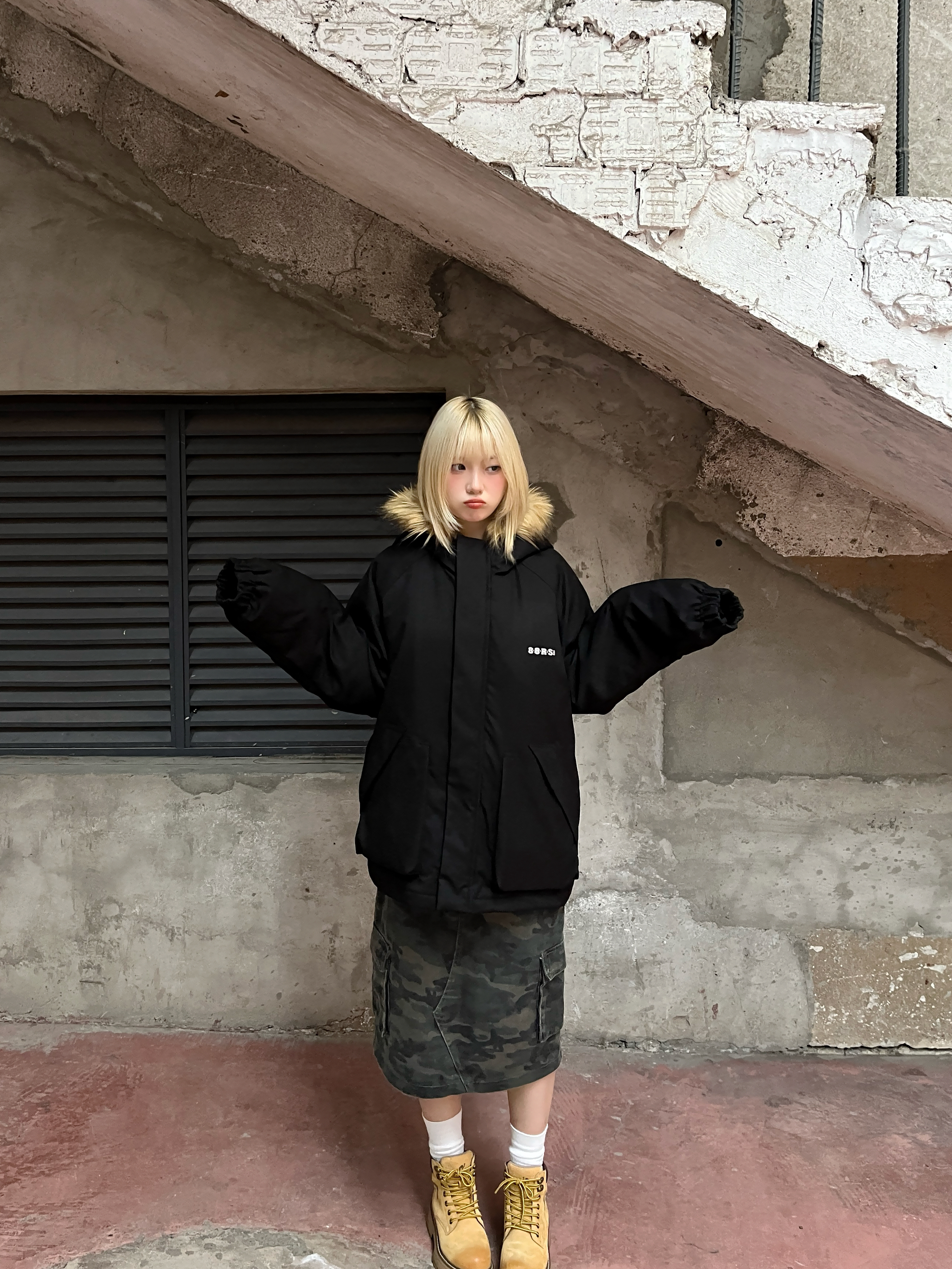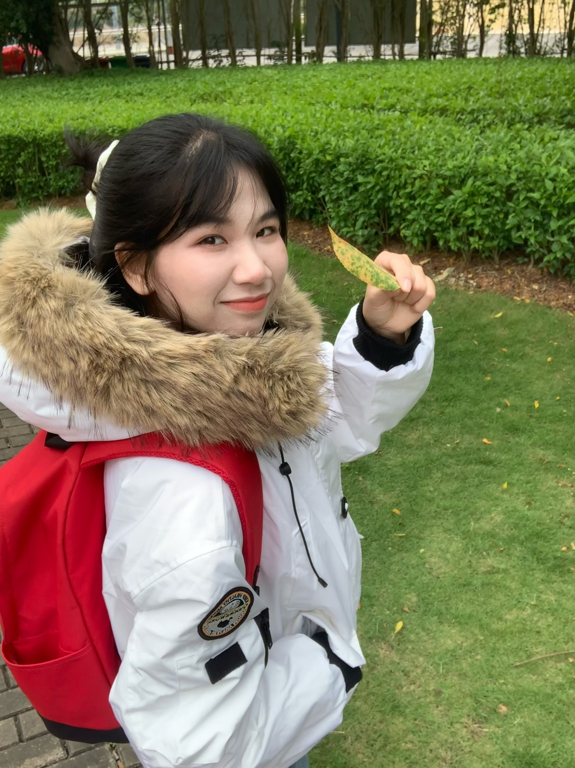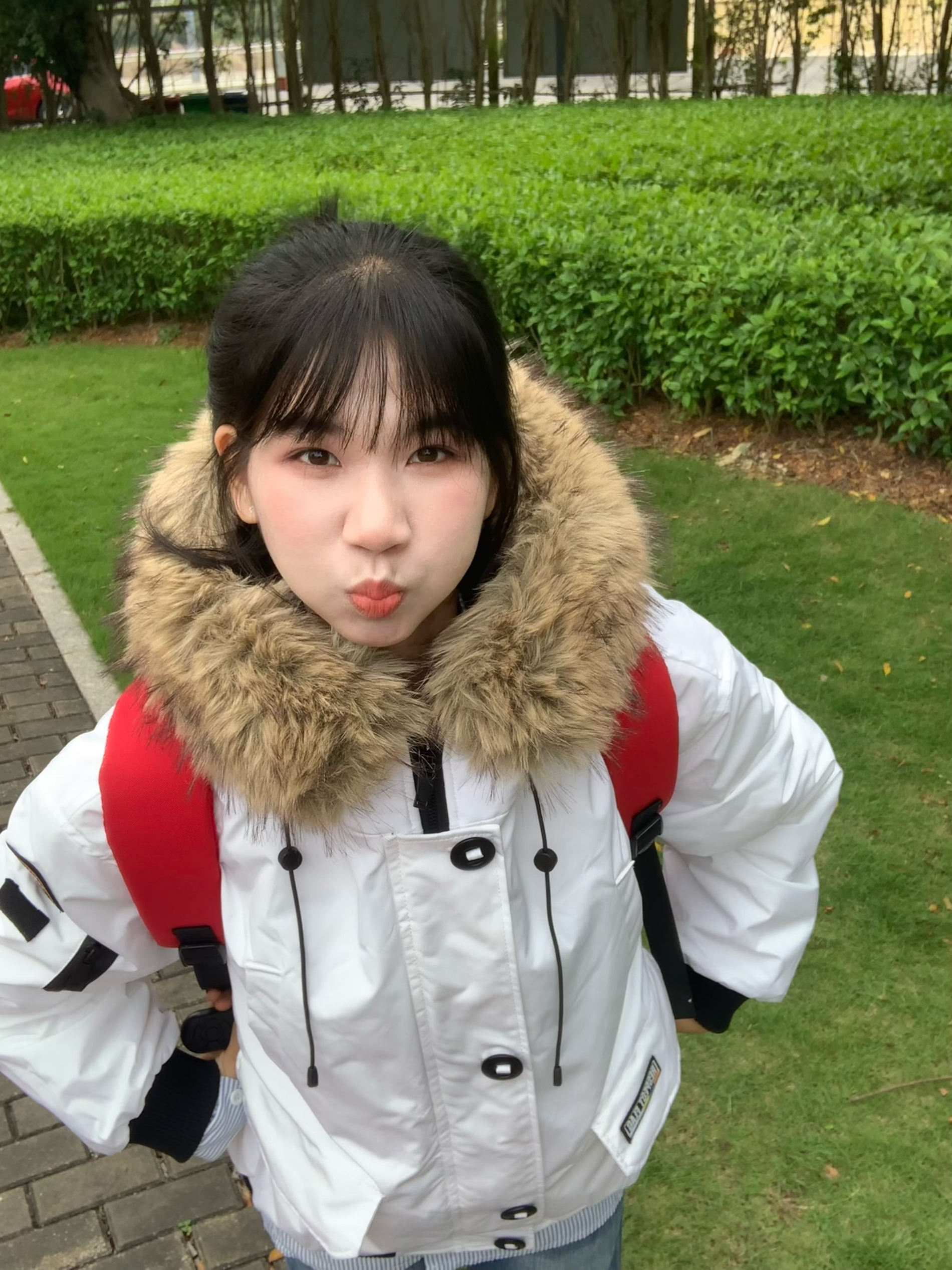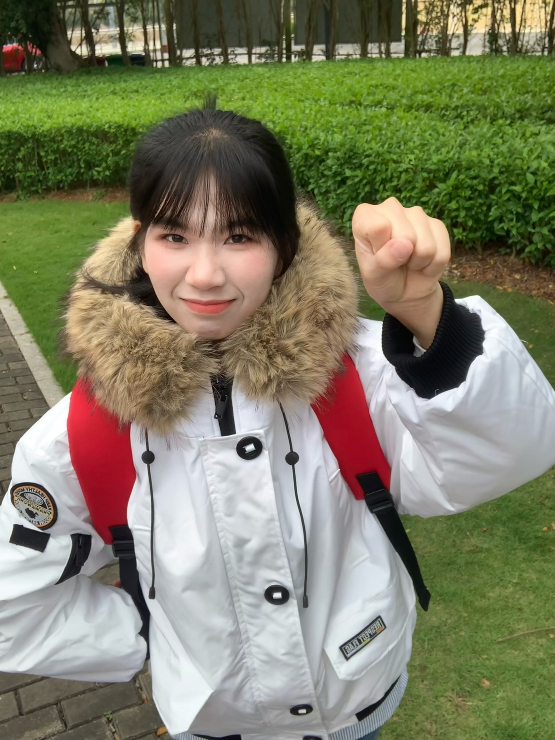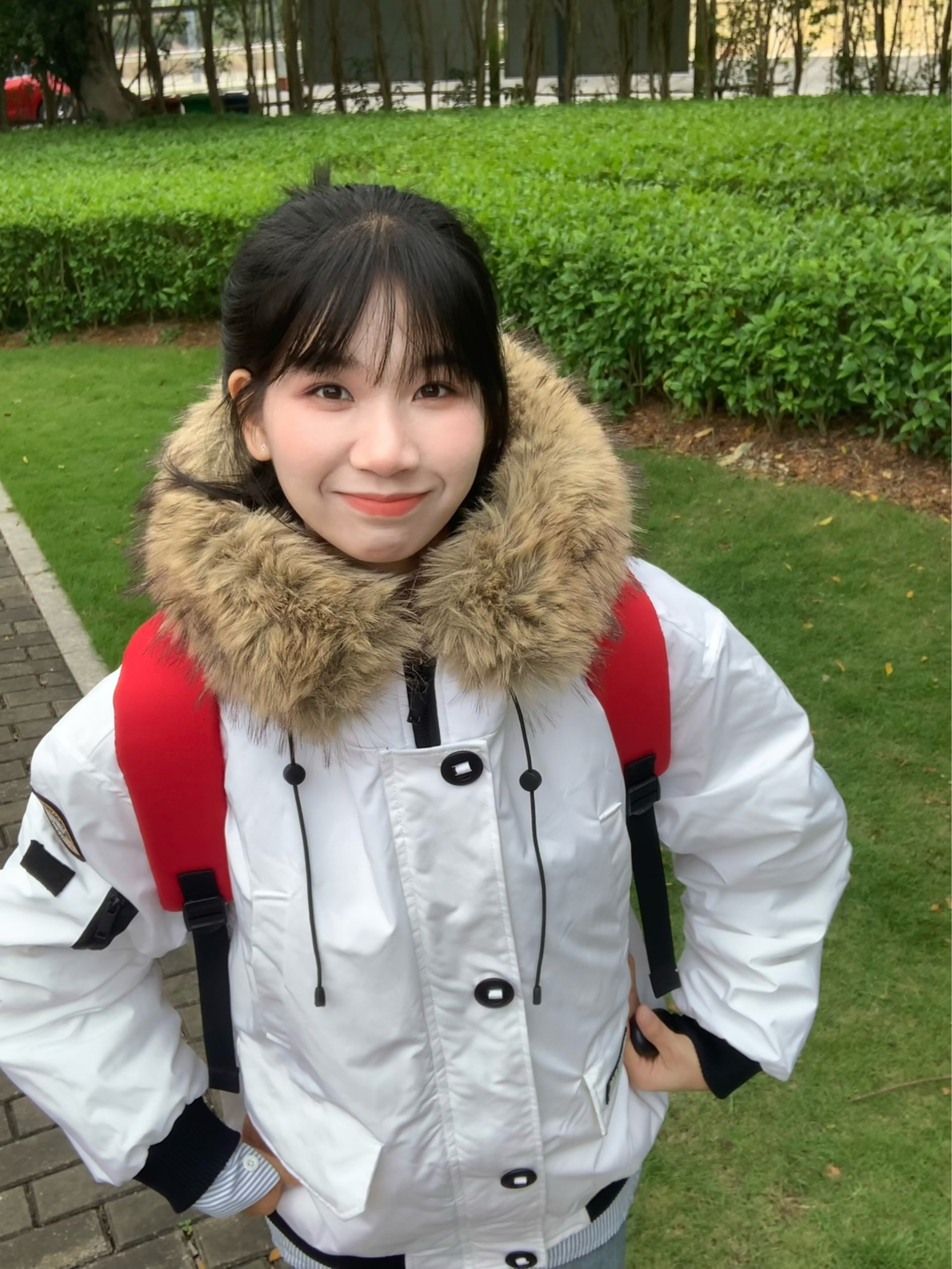 毛绒绒设计又甜又温柔的派克服 手臂有一个徽章设计 看起来很精致 内衬搭配简单衬衫 搭配简单裤子 再搭配一个红色双肩包 整体看起来很有学院风的感觉 超级适合秋冬季节 保暖效果非常ok 而且非常符合爱美女孩 随随便便拍照就可轻松上镜 看起来漫溢青春感