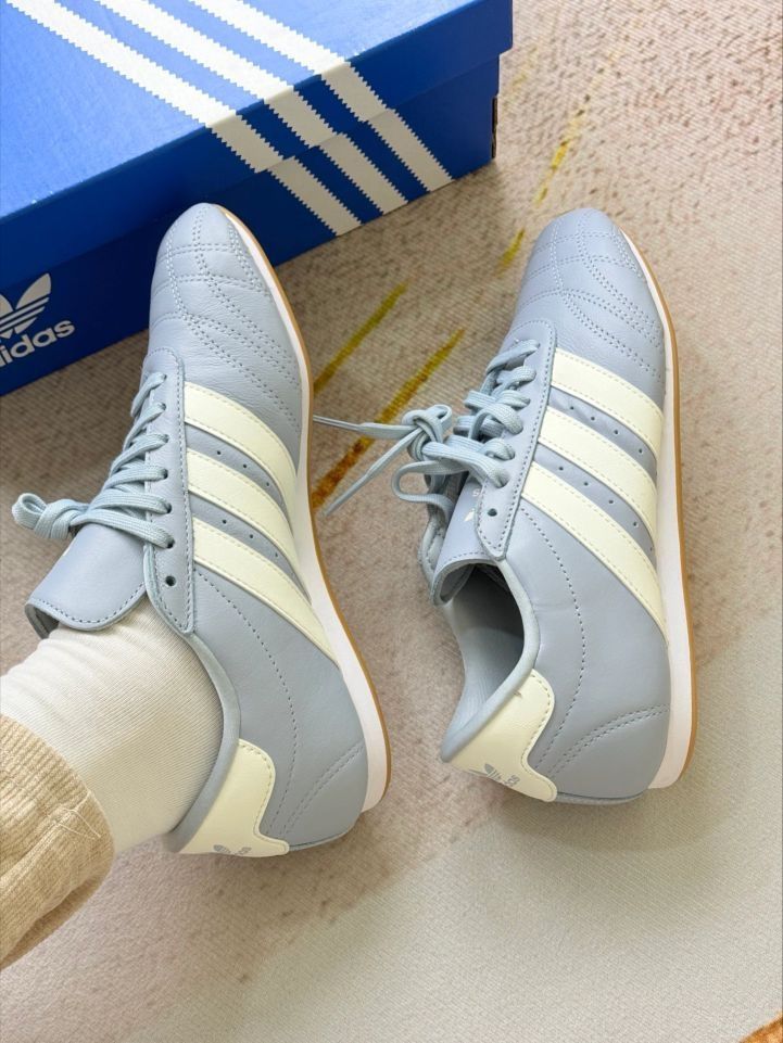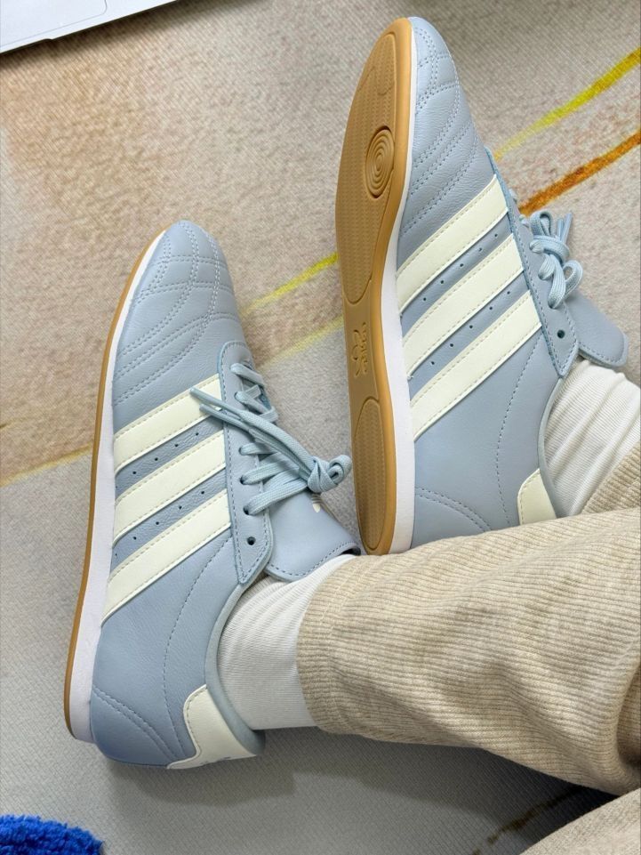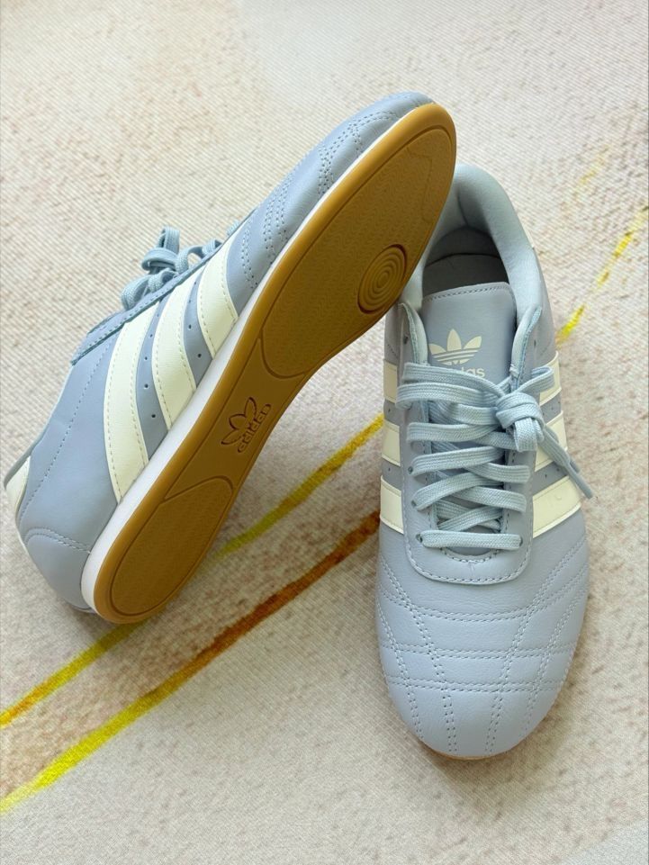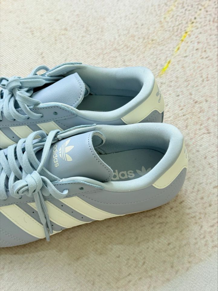 家人们谁懂啊!阿迪达斯这双浅蓝小白鞋,真的长在我的心巴上~ 清新浅蓝搭配奶白条纹,复古又吸睛,皮质质感超棒,上脚舒适还巨百搭,不管是搭裙装还是裤装都很绝,妥妥的穿搭“流量密码”,宝子们闭眼冲!
