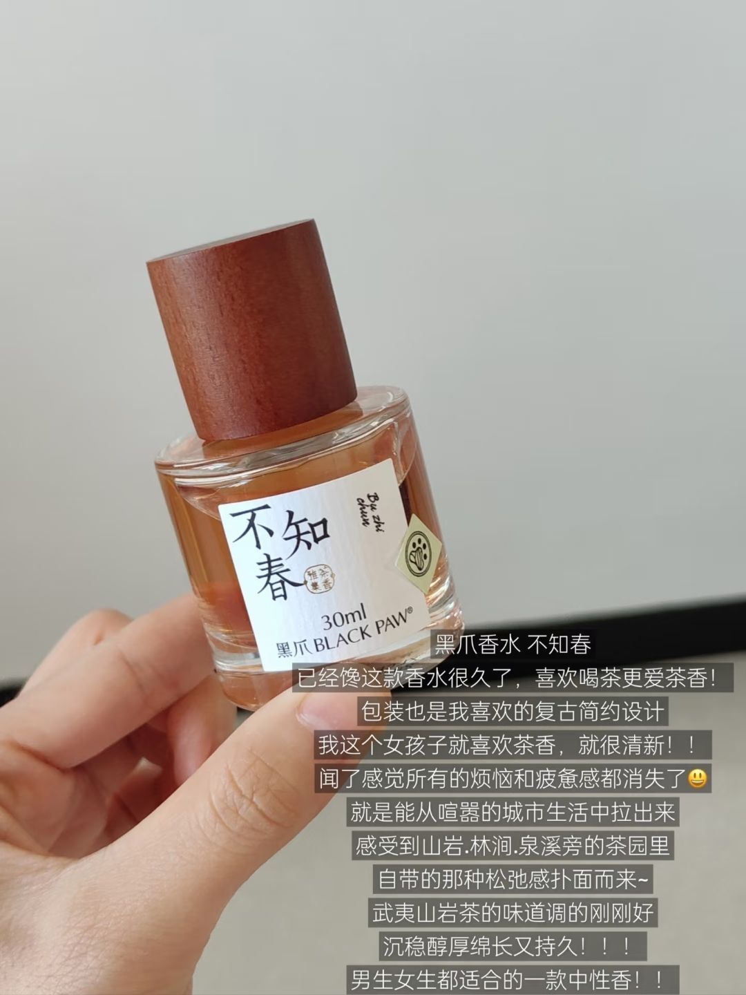 黑爪香水 不知春 已经馋这款香水很久了,喜欢喝茶更爱茶香! 包装也是我喜欢的复古简约设计 我这个女孩子就喜欢茶香,就很清新! 闻了感觉所有的烦恼和疲急感都消失了 就是能从喧器的城市生活中拉出来 感受到山岩.林涧.泉溪旁的茶园里 自带的那种松弛感扑面而来 武夷山岩茶的味道调的刚刚好 沉稳醇厚绵长又持久!!! 男生女生都适合的款中性香!! __ parb磨砂膏 这款磨砂膏是果酸和精油一起协同 像我这大...