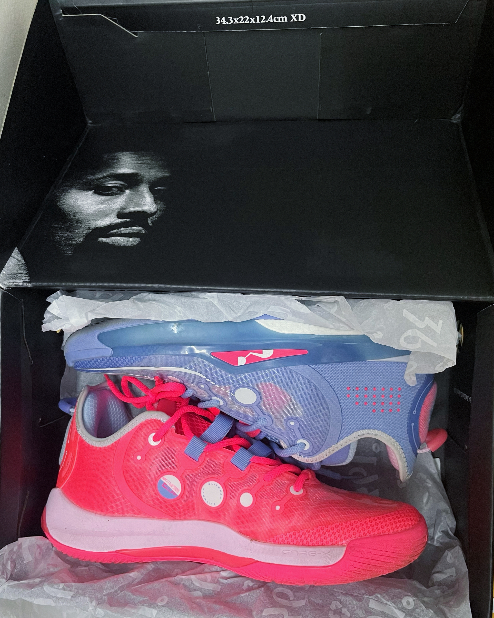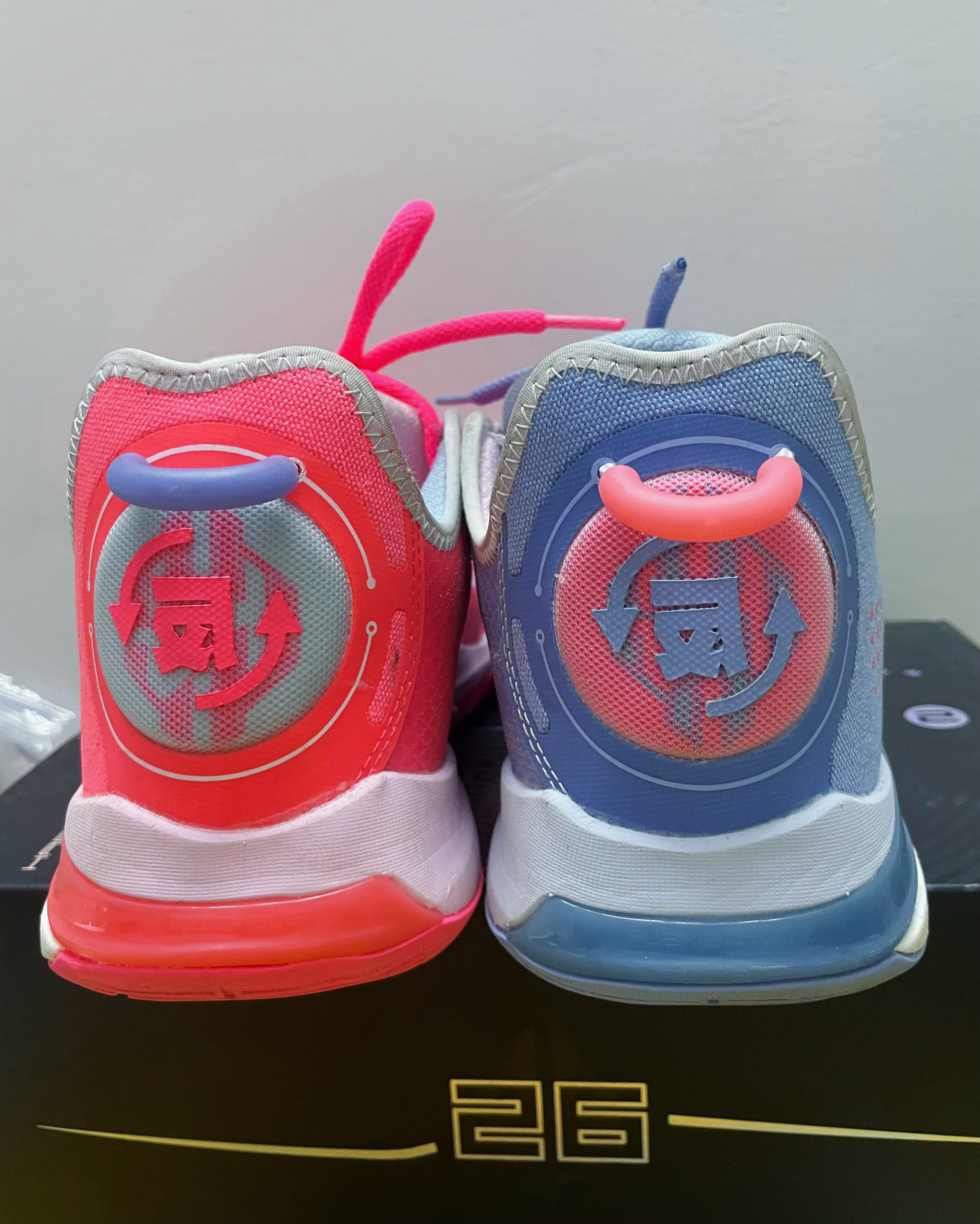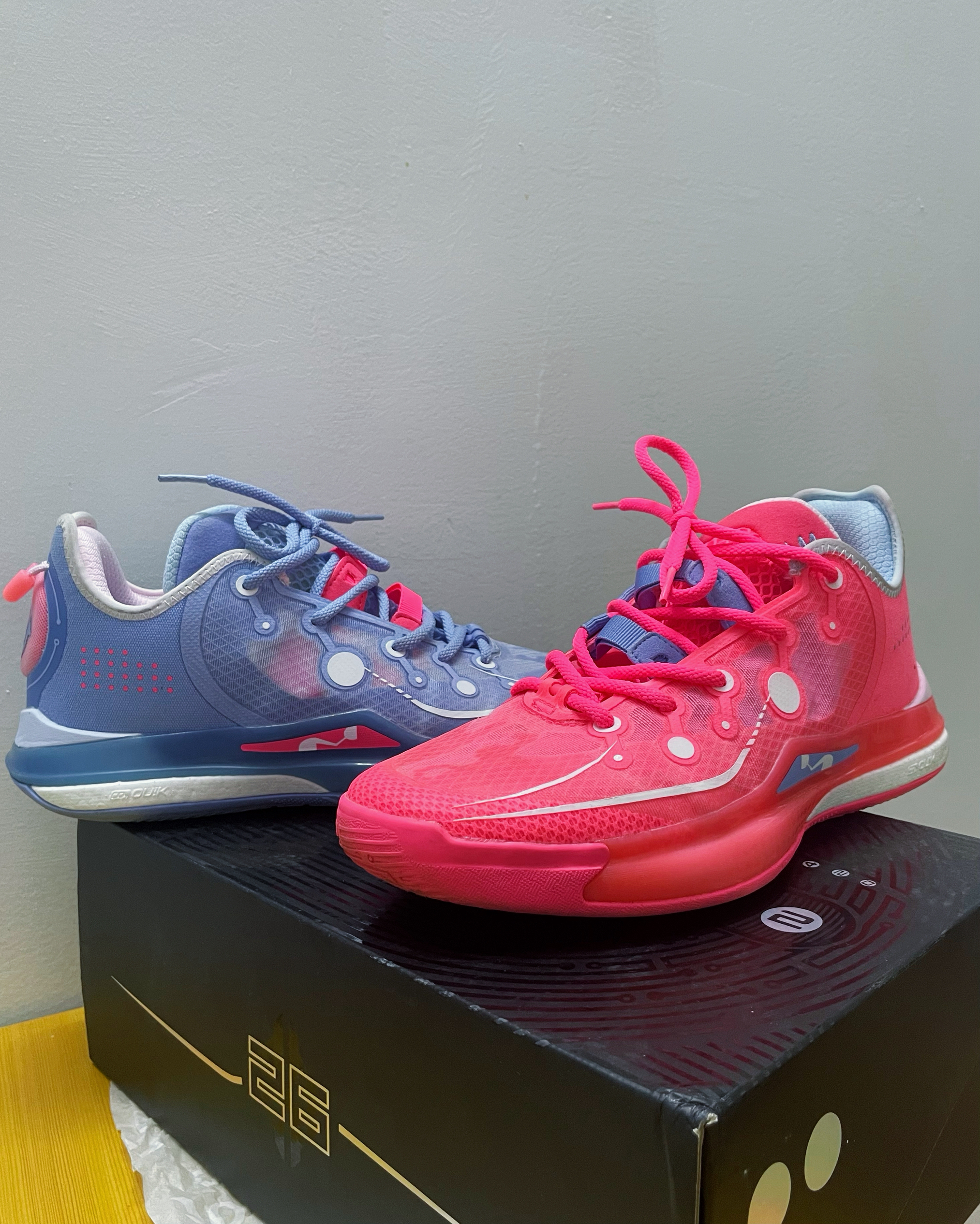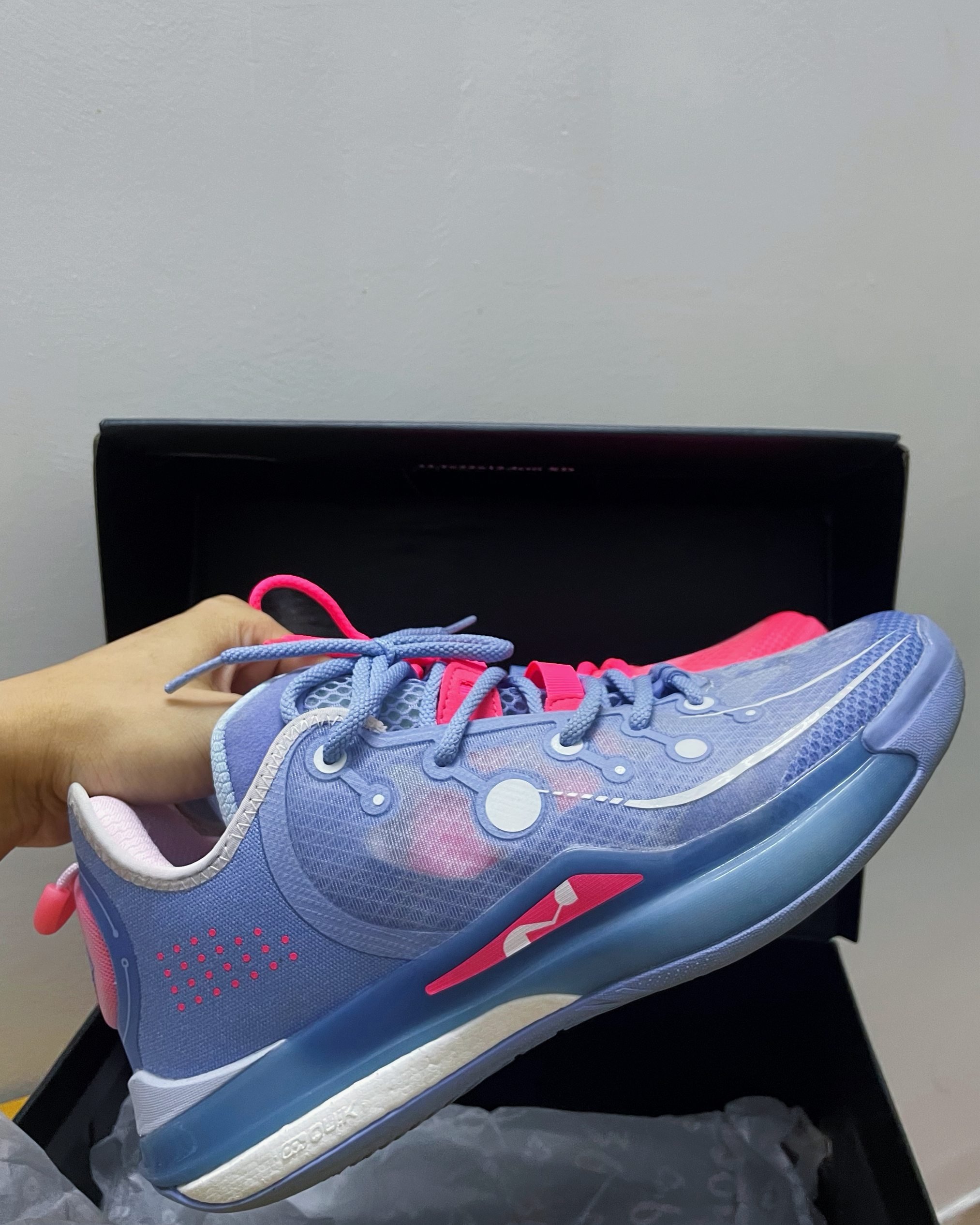 这双鞋以浅蓝粉为主调的鸳鸯配色,视觉冲击力极强。鞋身的透明网面材质与圆形结构装饰,融合了科技感与街头潮流风格,无论是球场上实战还是日常出街搭配,都能轻松成为焦点。“反转”配色的命名也恰如其分,打破了篮球鞋配色的常规思路,为穿搭提供了更多可能性。
