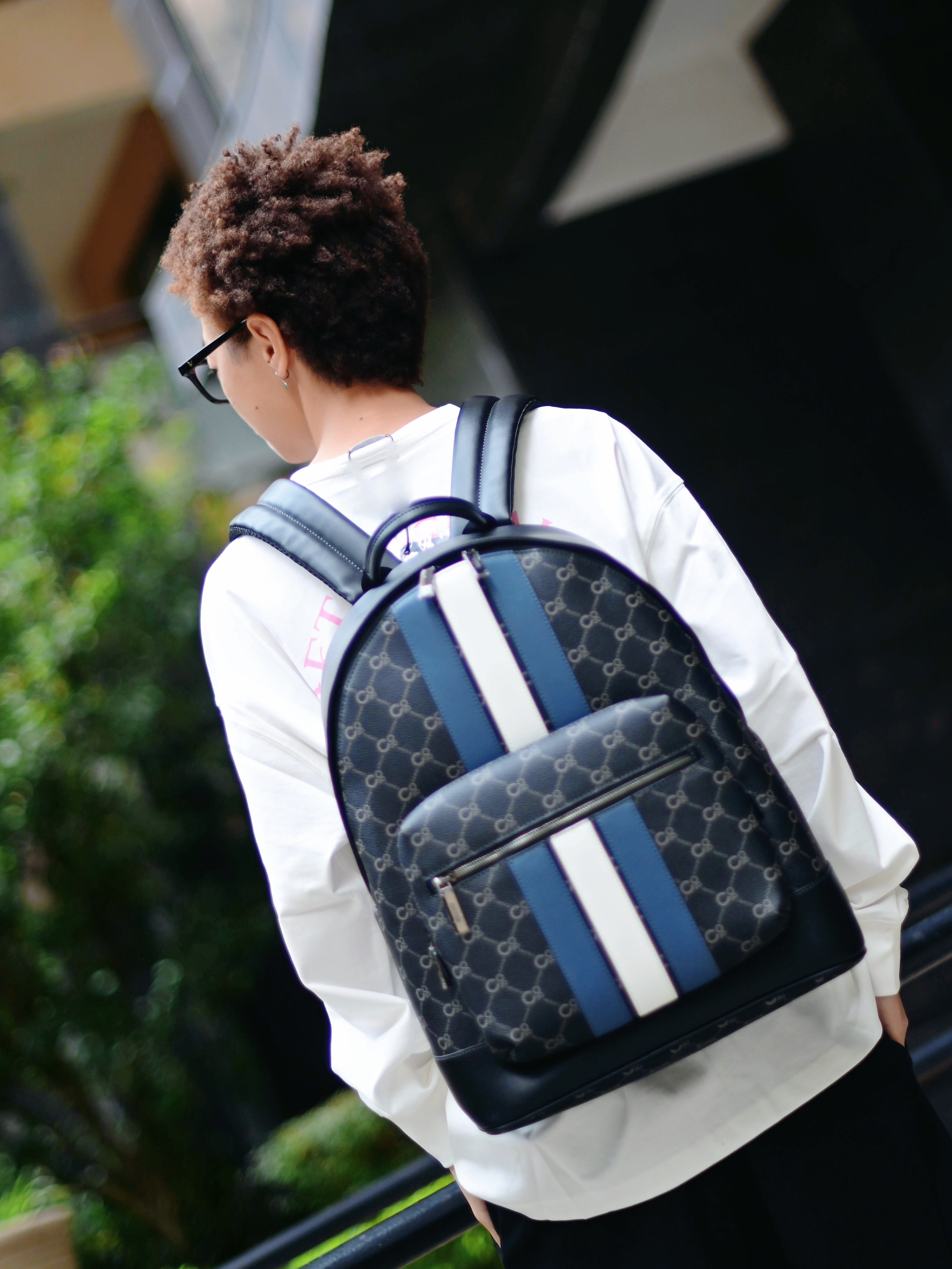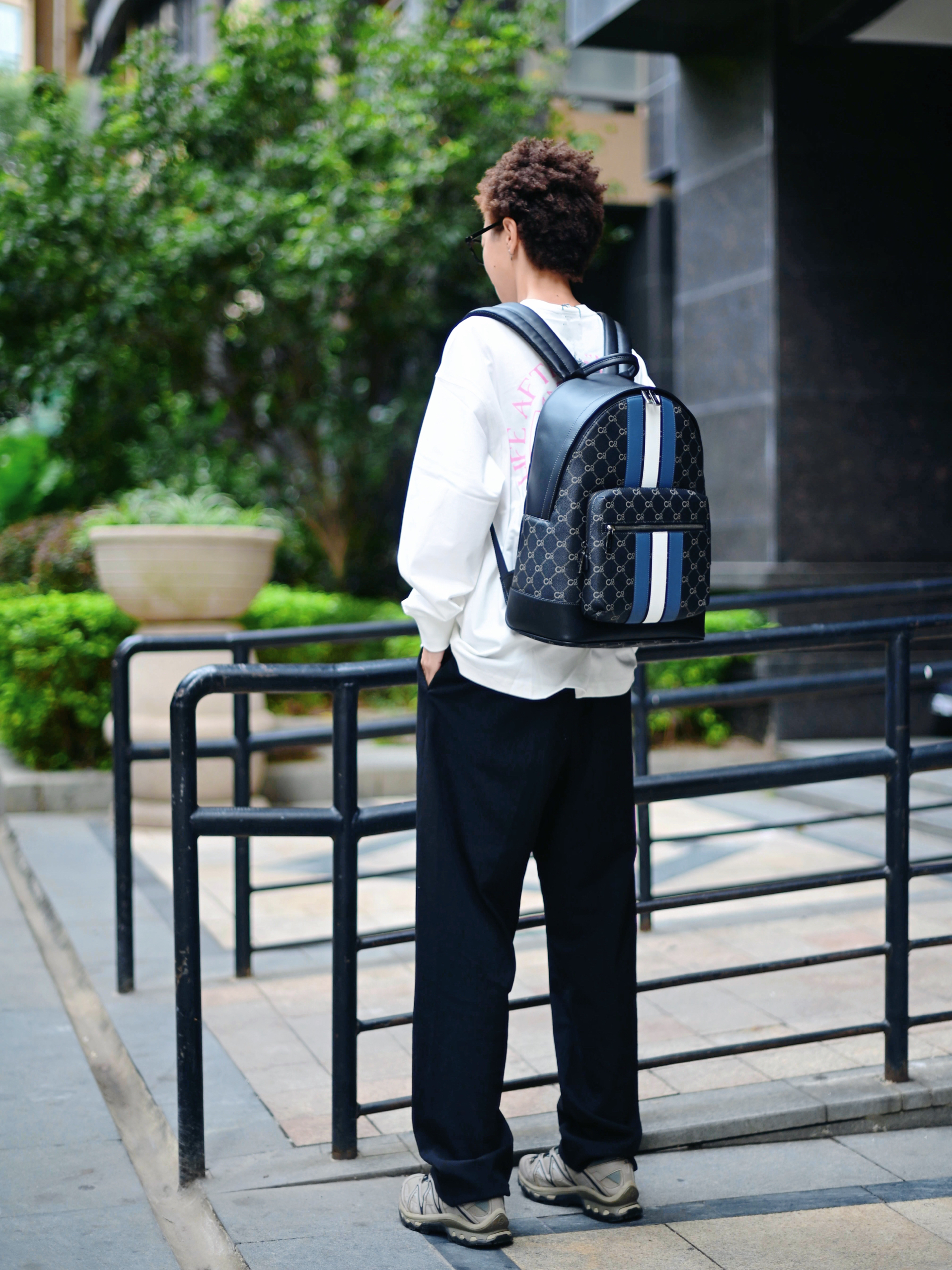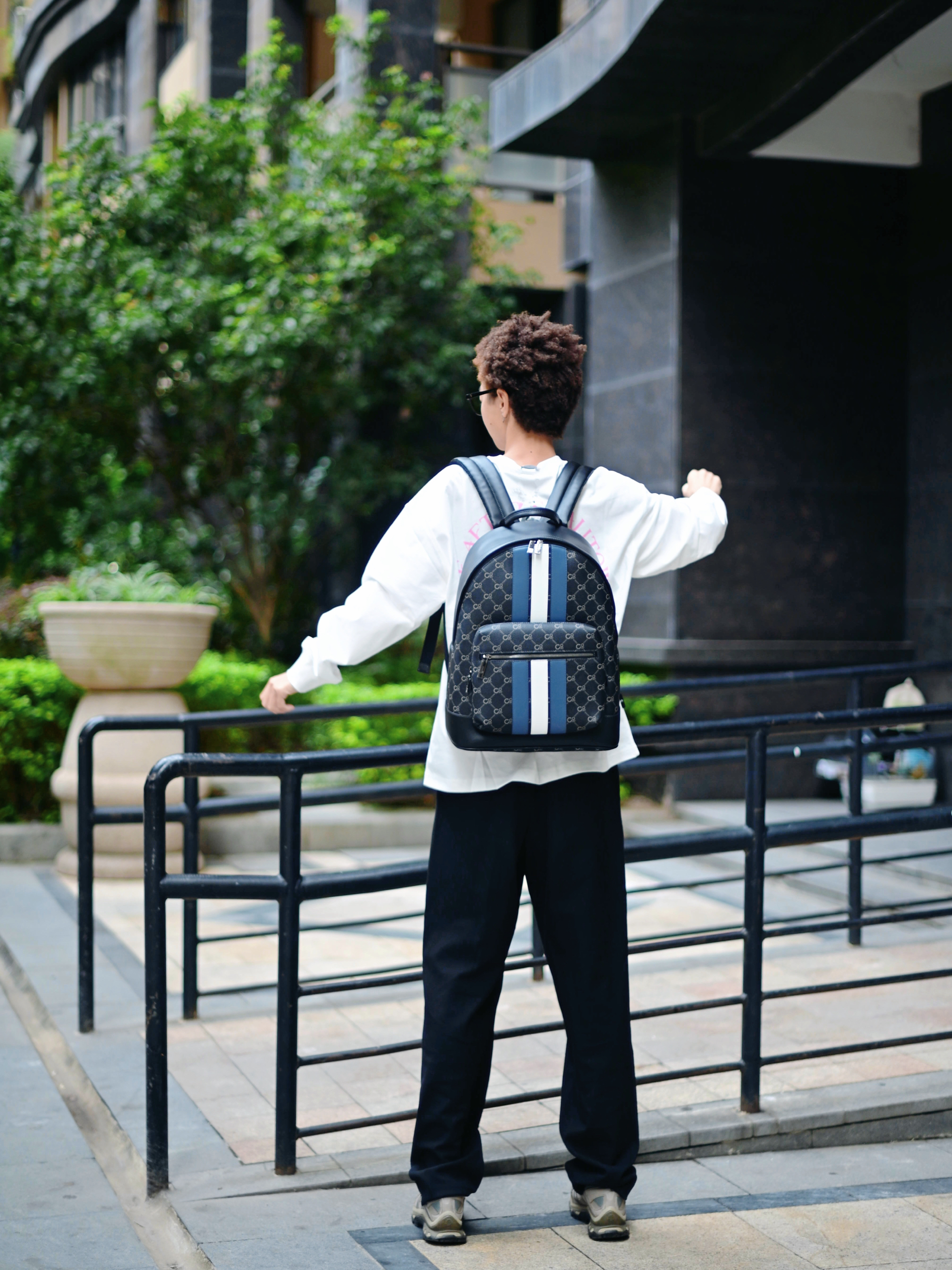 欢迎进入哇哇哇的穿搭分享频道 172CM|55KG 👔:m👖:m|👟:39码 适合秋冬通勤穿搭来咯~ 背上俺的复古老花条纹COOGI黑灰色双肩包经典又百搭 上身白色长袖上衣 背后粉色字母印花增添细节感 下搭黑色阔腿裤 脚踩浅灰色运动鞋提升活力 双肩包容量充足,轻松装载电脑文件,商务通勤还是日常出游都适配!