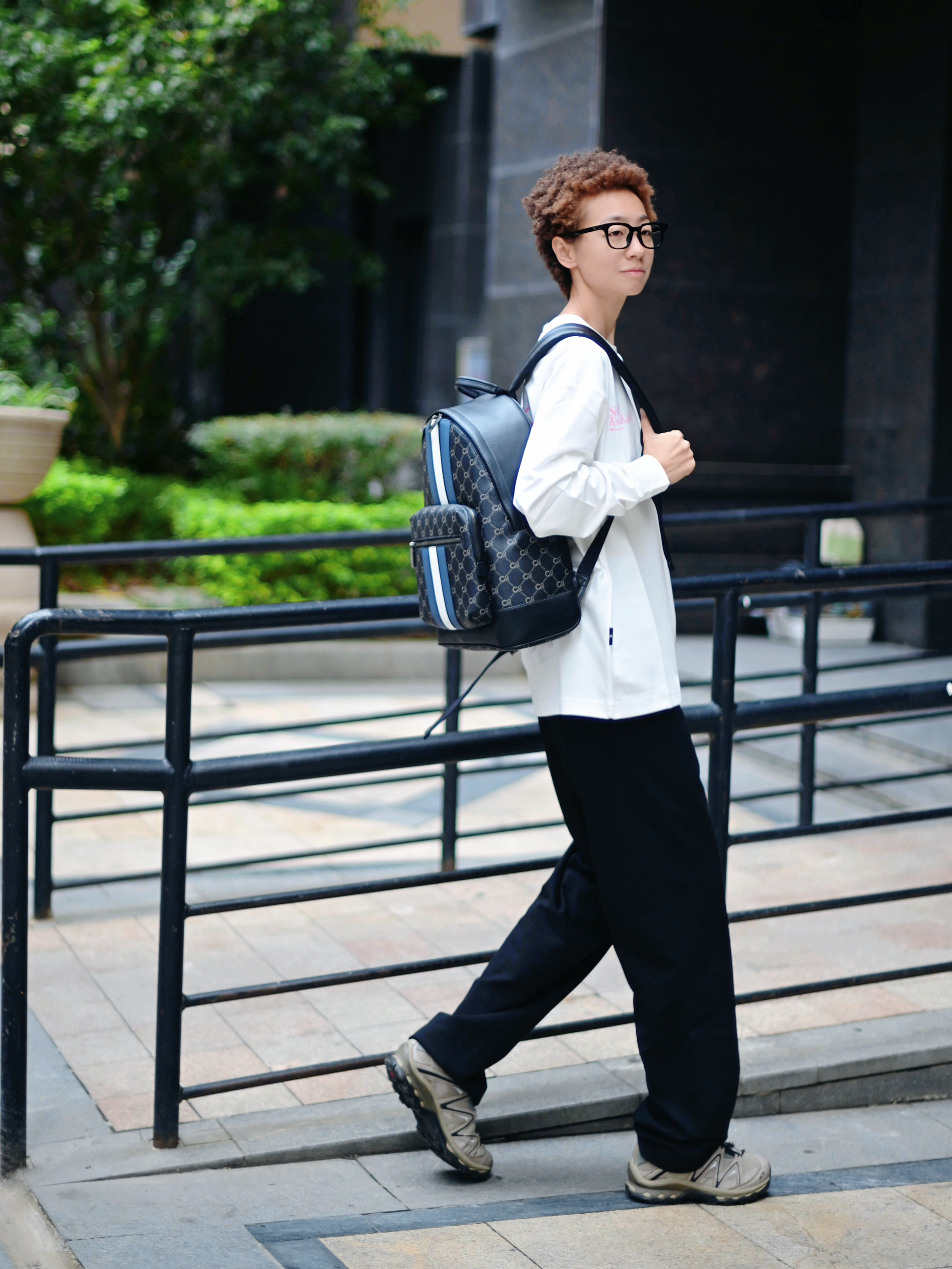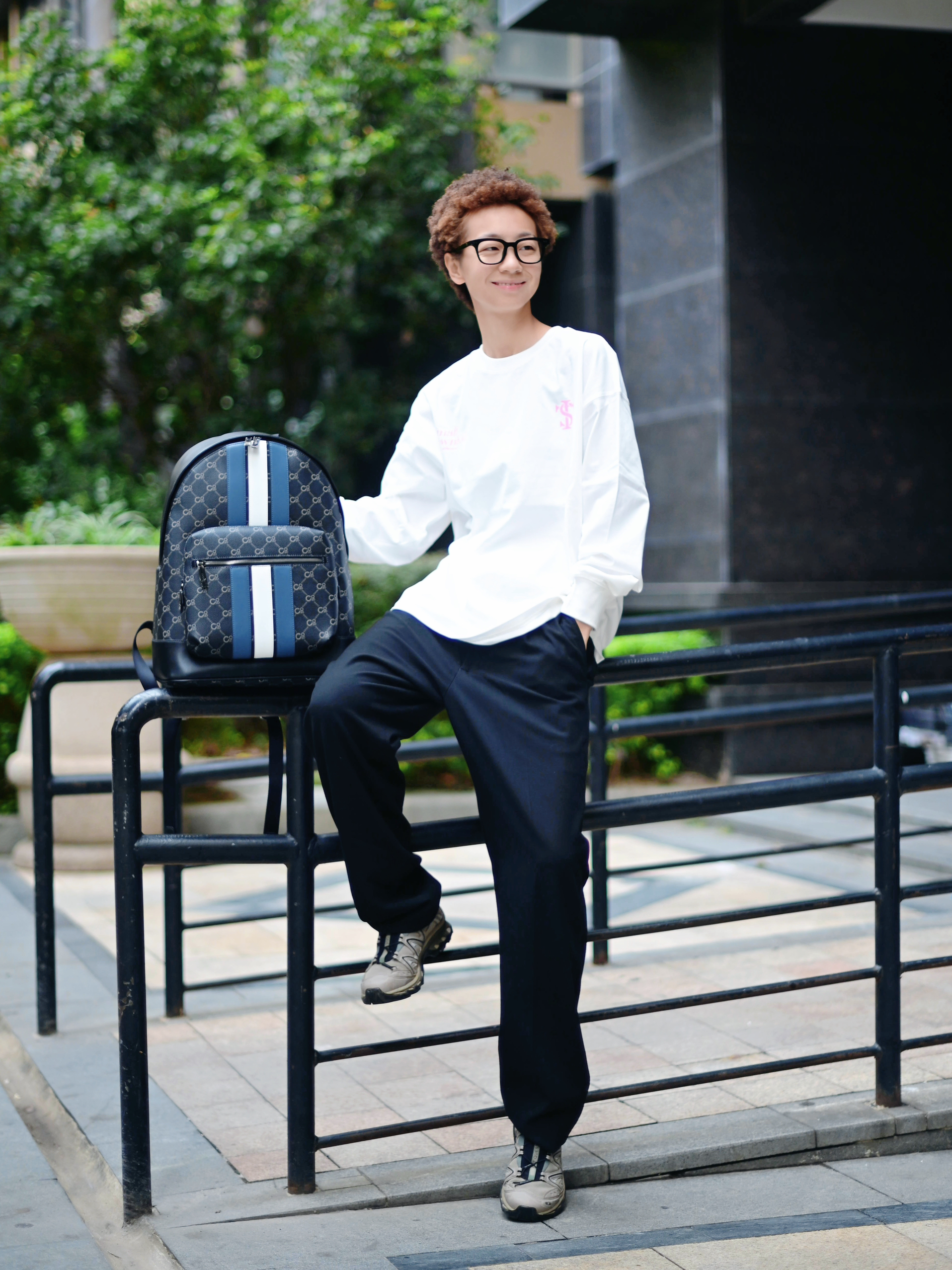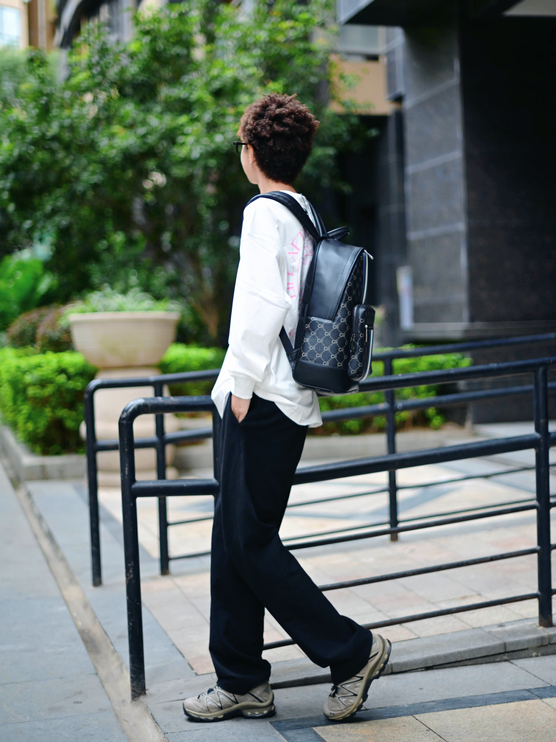 欢迎进入哇哇哇的穿搭分享频道 172CM|55KG 👔:m👖:m|👟:39码 适合秋冬通勤穿搭来咯~ 背上俺的复古老花条纹COOGI黑灰色双肩包经典又百搭 上身白色长袖上衣 背后粉色字母印花增添细节感 下搭黑色阔腿裤 脚踩浅灰色运动鞋提升活力 双肩包容量充足,轻松装载电脑文件,商务通勤还是日常出游都适配!