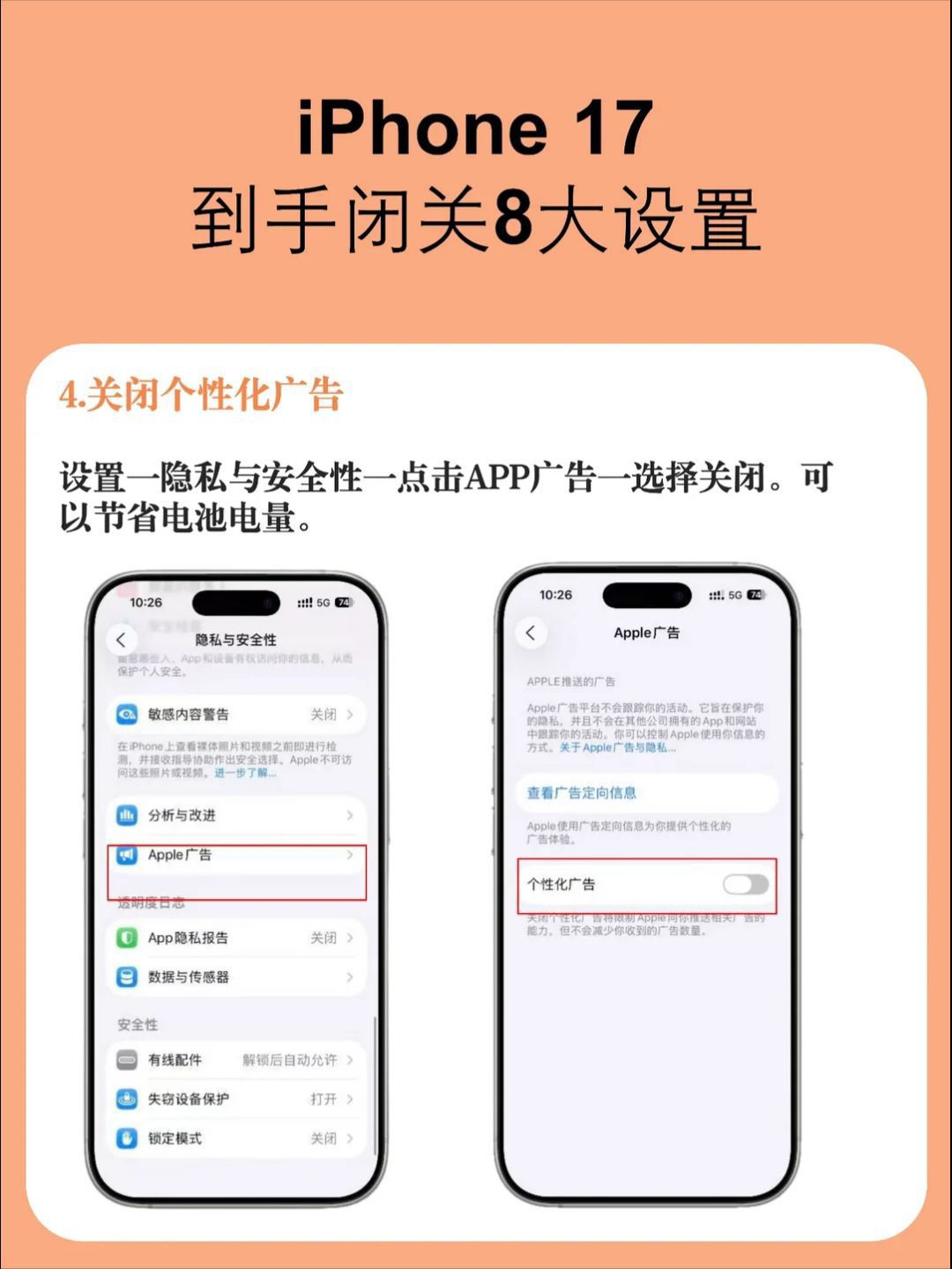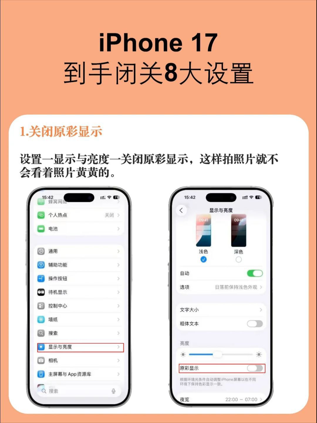 宝子们!你的电子闺蜜小美上线了👩💻✨ ✅姐妹们,是不是入手了iPhone17拉。但是拍照看着黄,手机耗电大,那是因为这些隐藏设置没有关闭。 ✅今天小美就来教大家如何去关闭这些设置,告别误触、弹窗烦恼~ 操作简单,跟着图里步骤走就行,让你iPhone更加好用。 😁赶紧来跟着操作,轻松解锁 iPhone17 的最佳使用状态