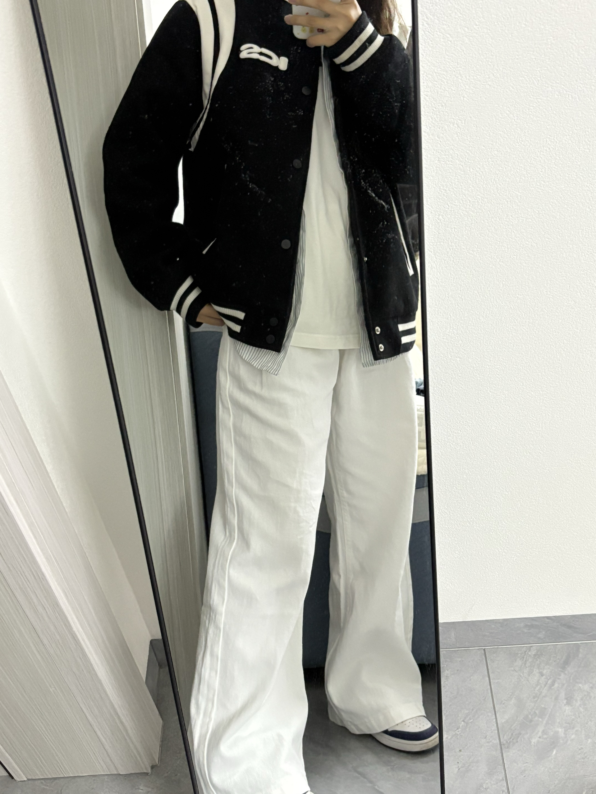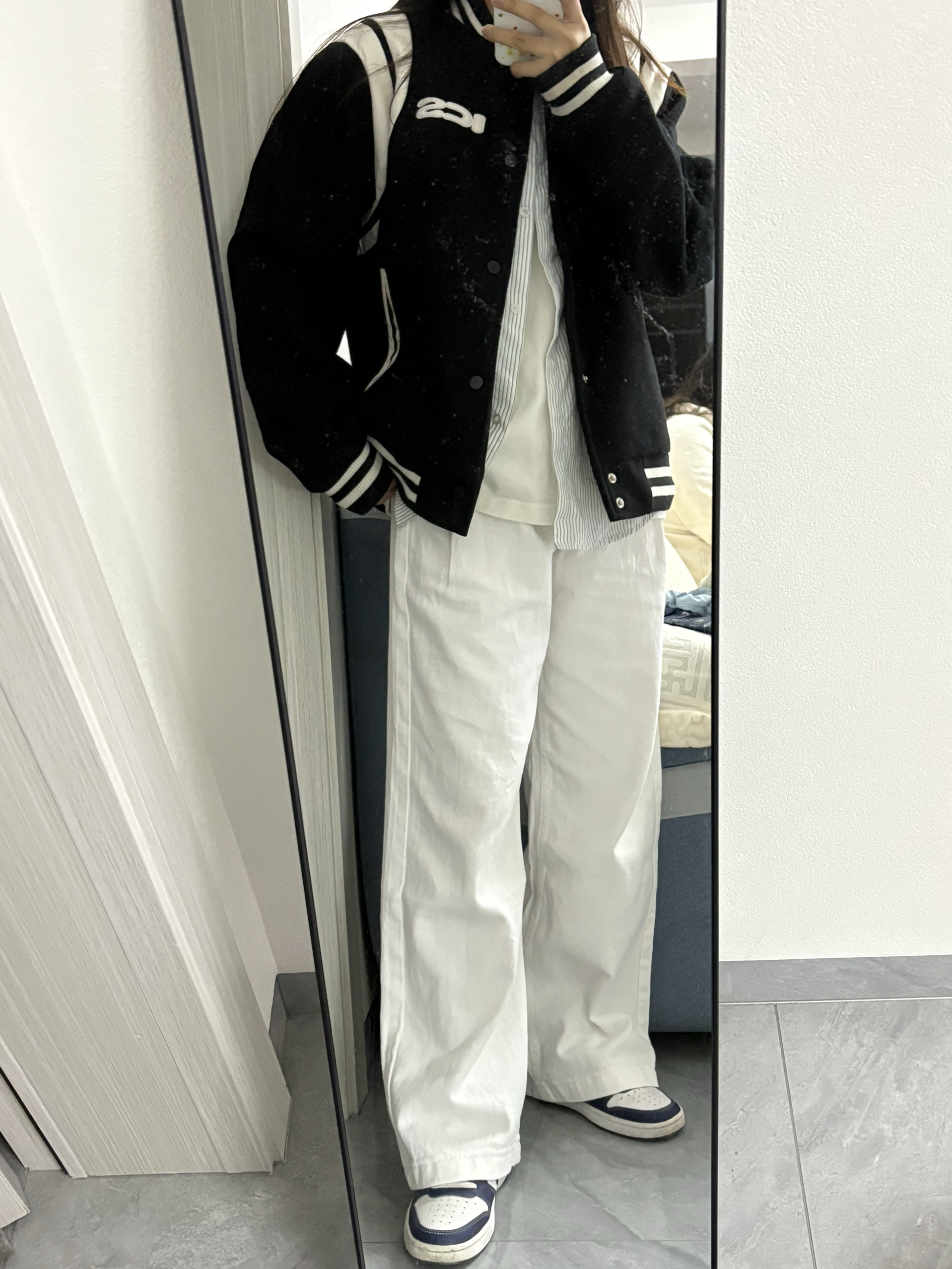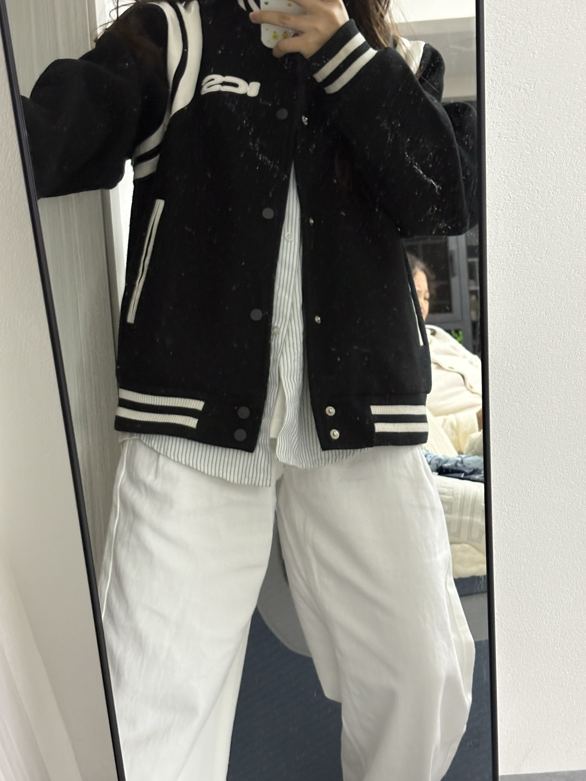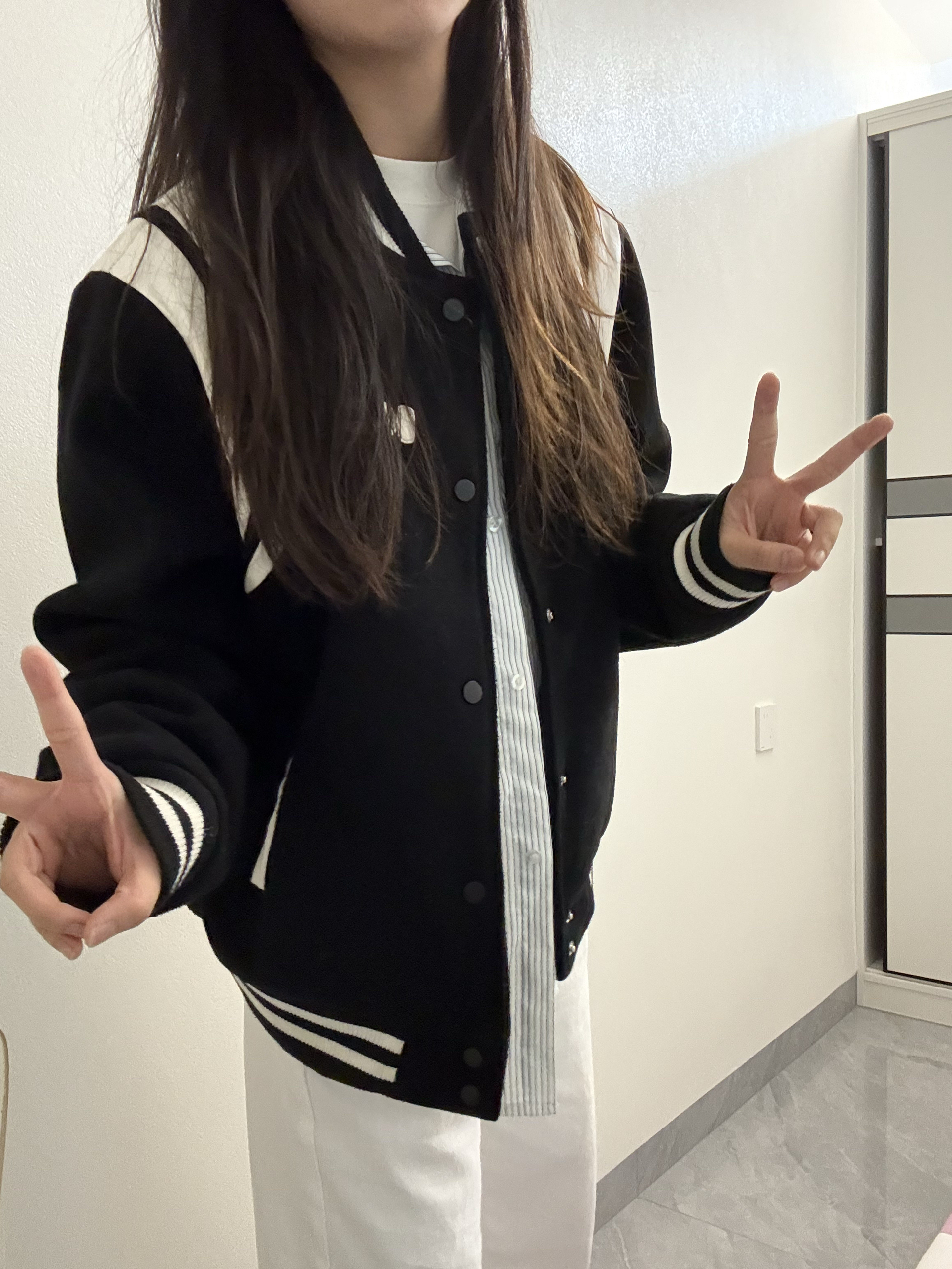 家人们快看!这套黑白棒球服穿搭绝绝子!黑色棒球服配白色拼接,胸前的字母设计超有范儿,穿上就很有美式校园那味儿~ 里面叠穿条纹衬衫和白T,下身搭条白色阔腿裤,再踩双蓝白复古球鞋,休闲又酷飒,日常出街这么穿,随性又吸睛,咱就是说一整个爱住这种风格!