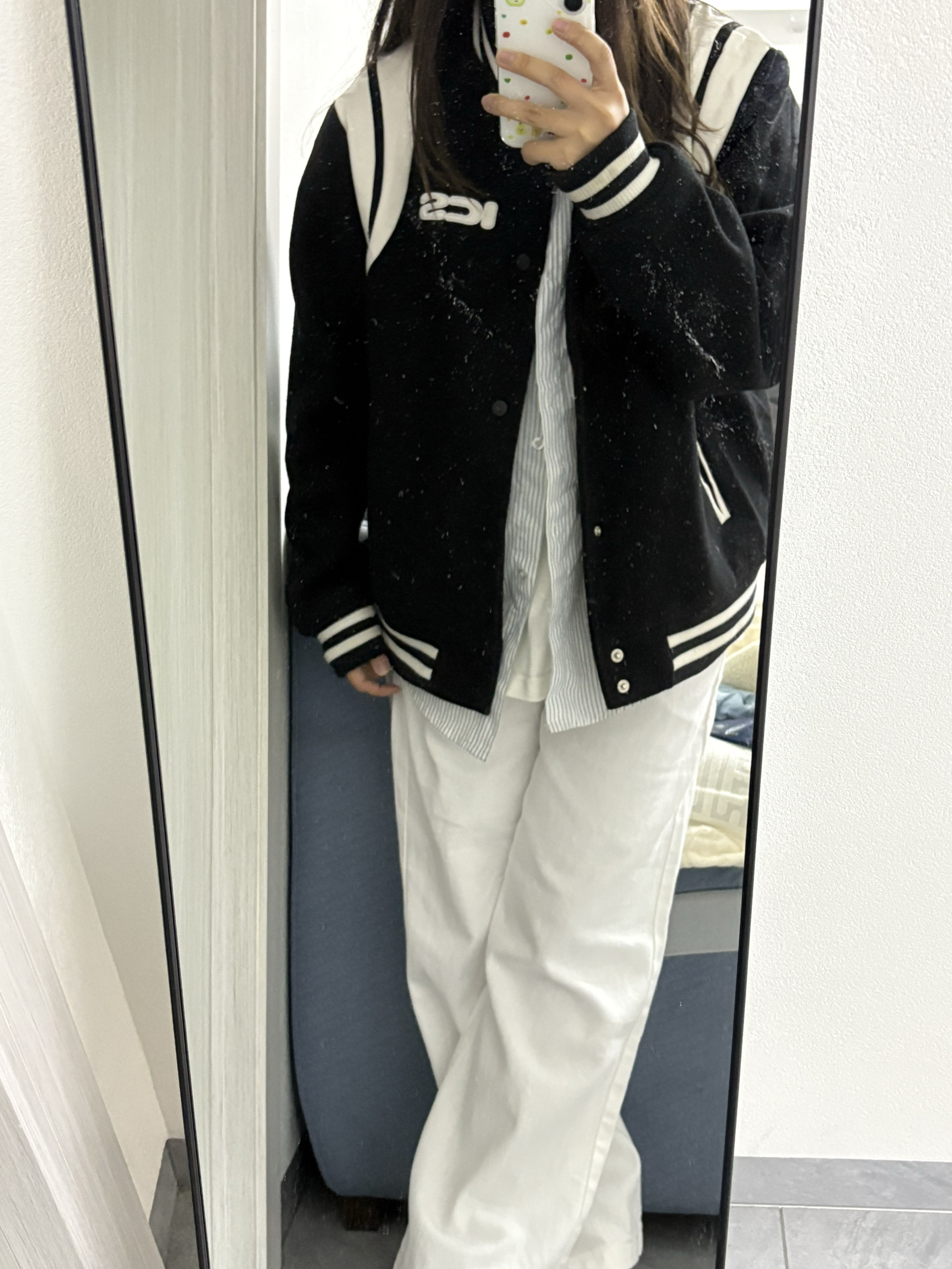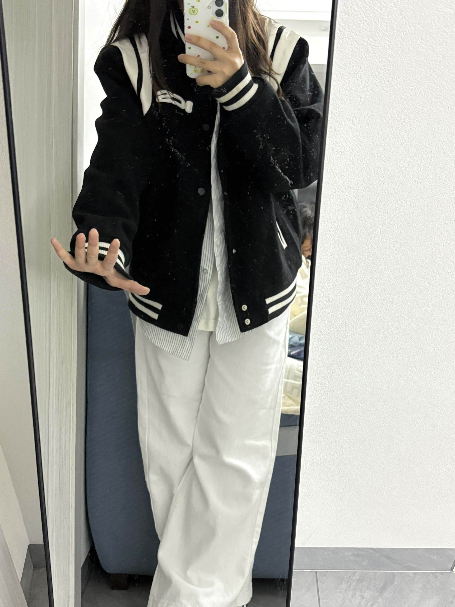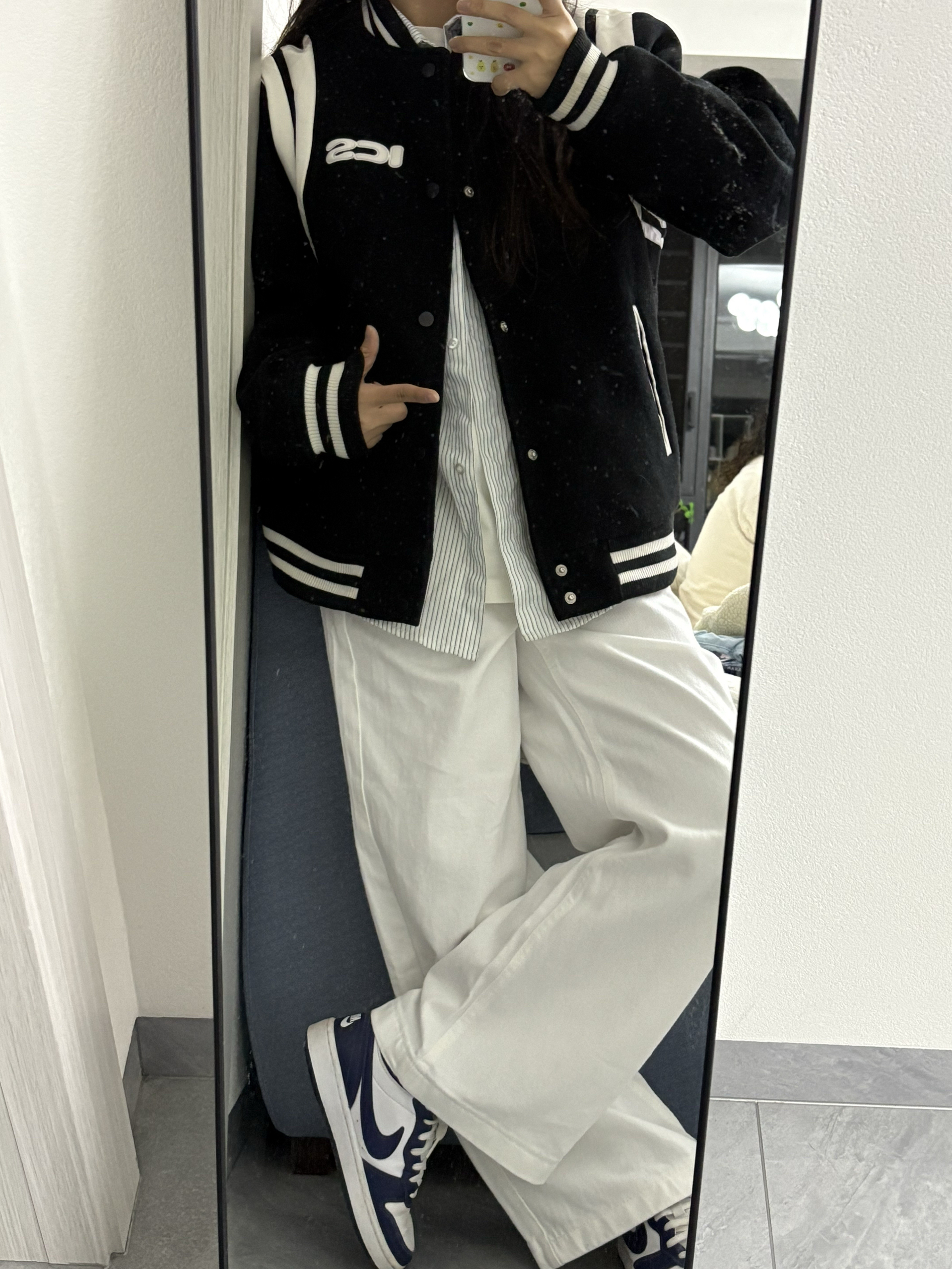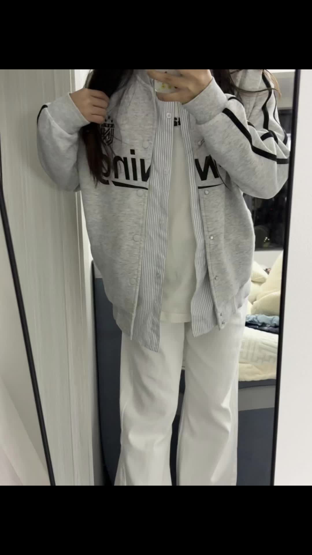 家人们快看!这套黑白棒球服穿搭绝绝子!黑色棒球服配白色拼接,胸前的字母设计超有范儿,穿上就很有美式校园那味儿~ 里面叠穿条纹衬衫和白T,下身搭条白色阔腿裤,再踩双蓝白复古球鞋,休闲又酷飒,日常出街这么穿,随性又吸睛,咱就是说一整个爱住这种风格!