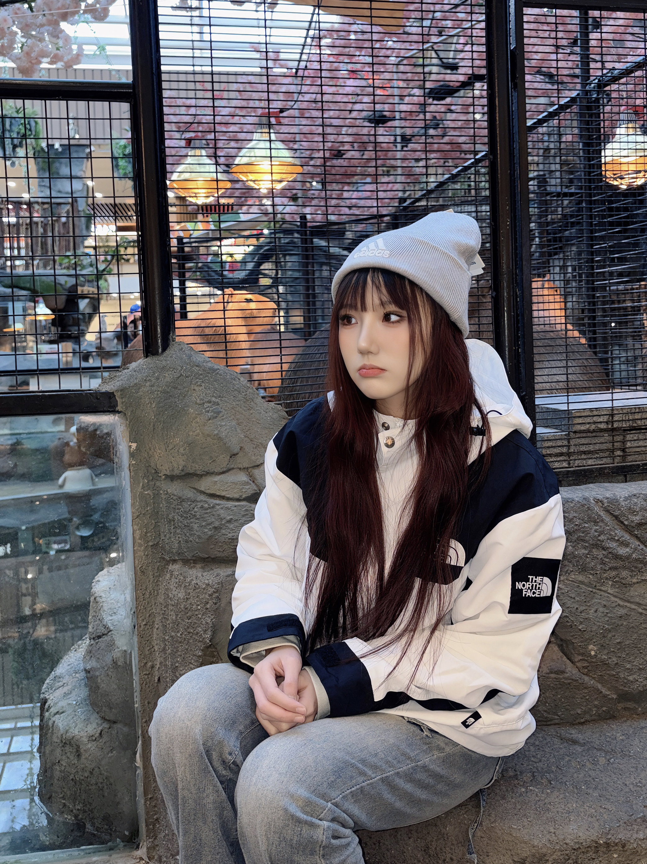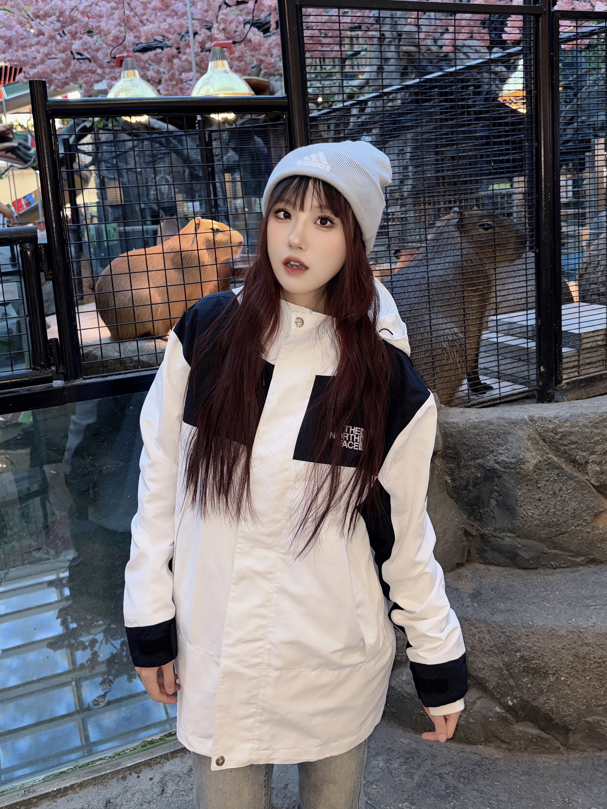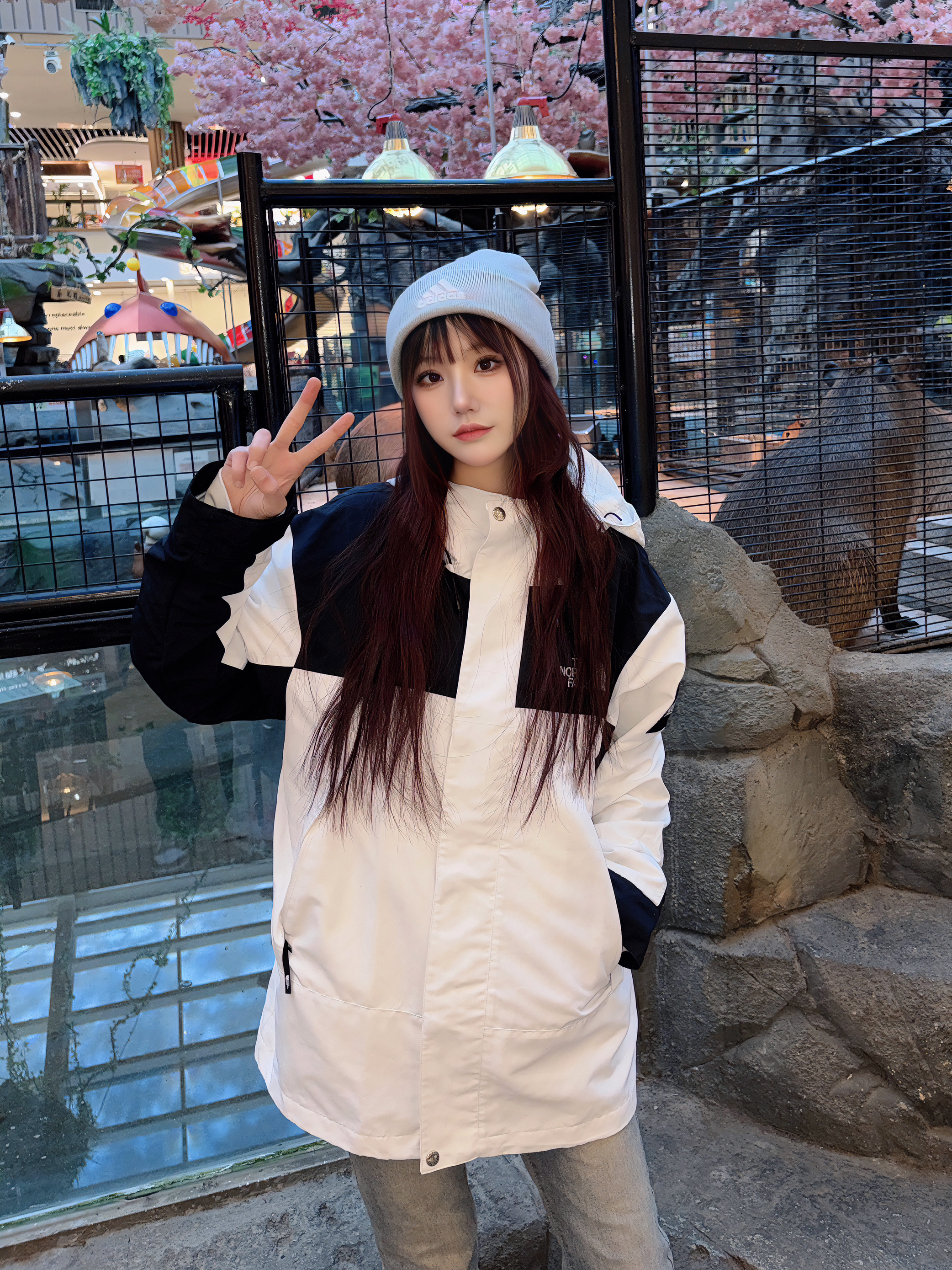 谁能拒绝白黑拼色的北面冲锋衣啊! 软乎乎的阿迪毛线帽一搭,直接拿捏韩系松弛感✨ 防风又轻便,长度刚好遮胯,梨形身材狂喜~ 连帽+防风面料,春天早晚温差大也能抗住,宽松版型裹上超有安全感,里面可以叠穿毛衣。侧面的北面小标简直就是点睛之笔。