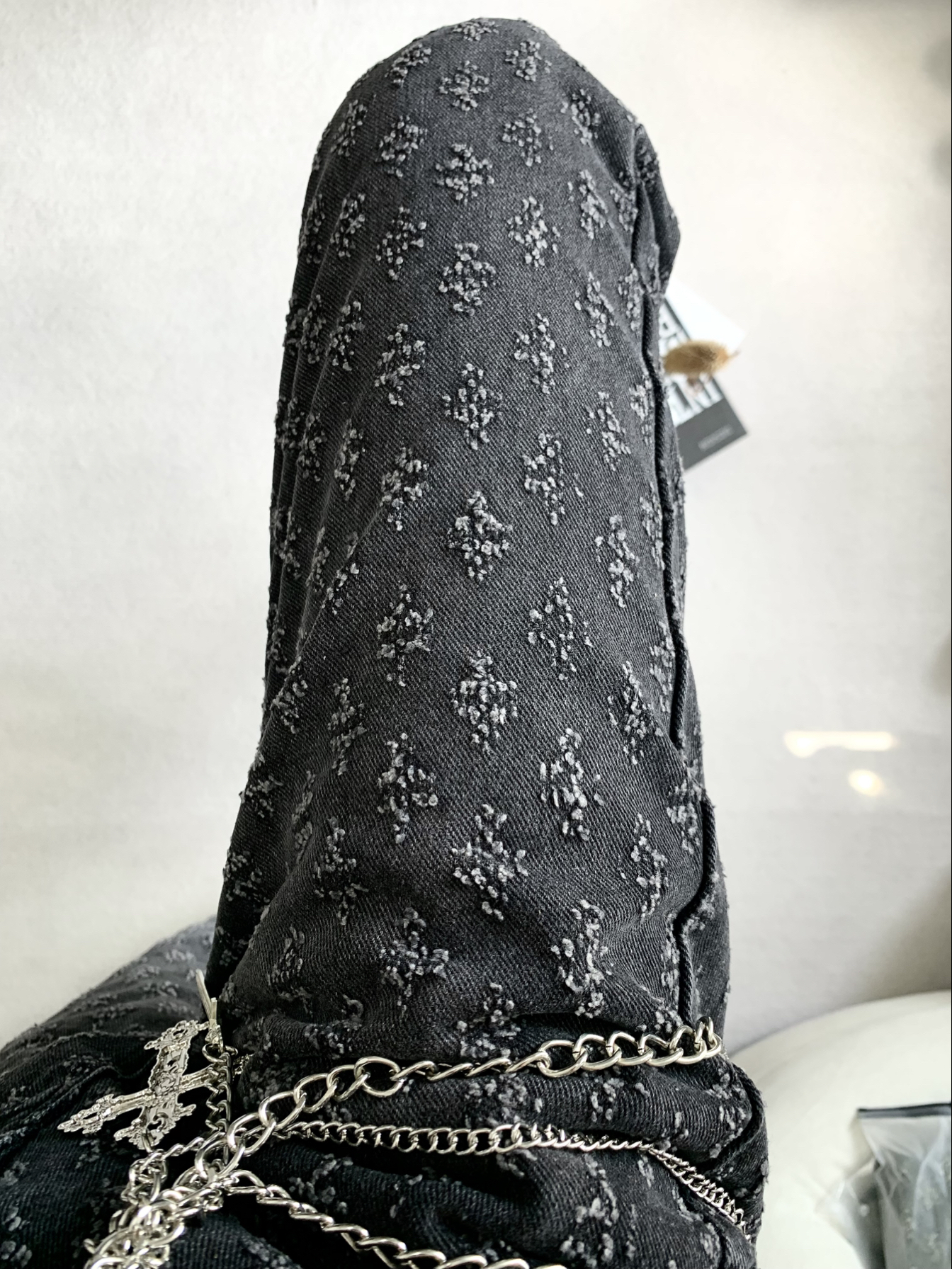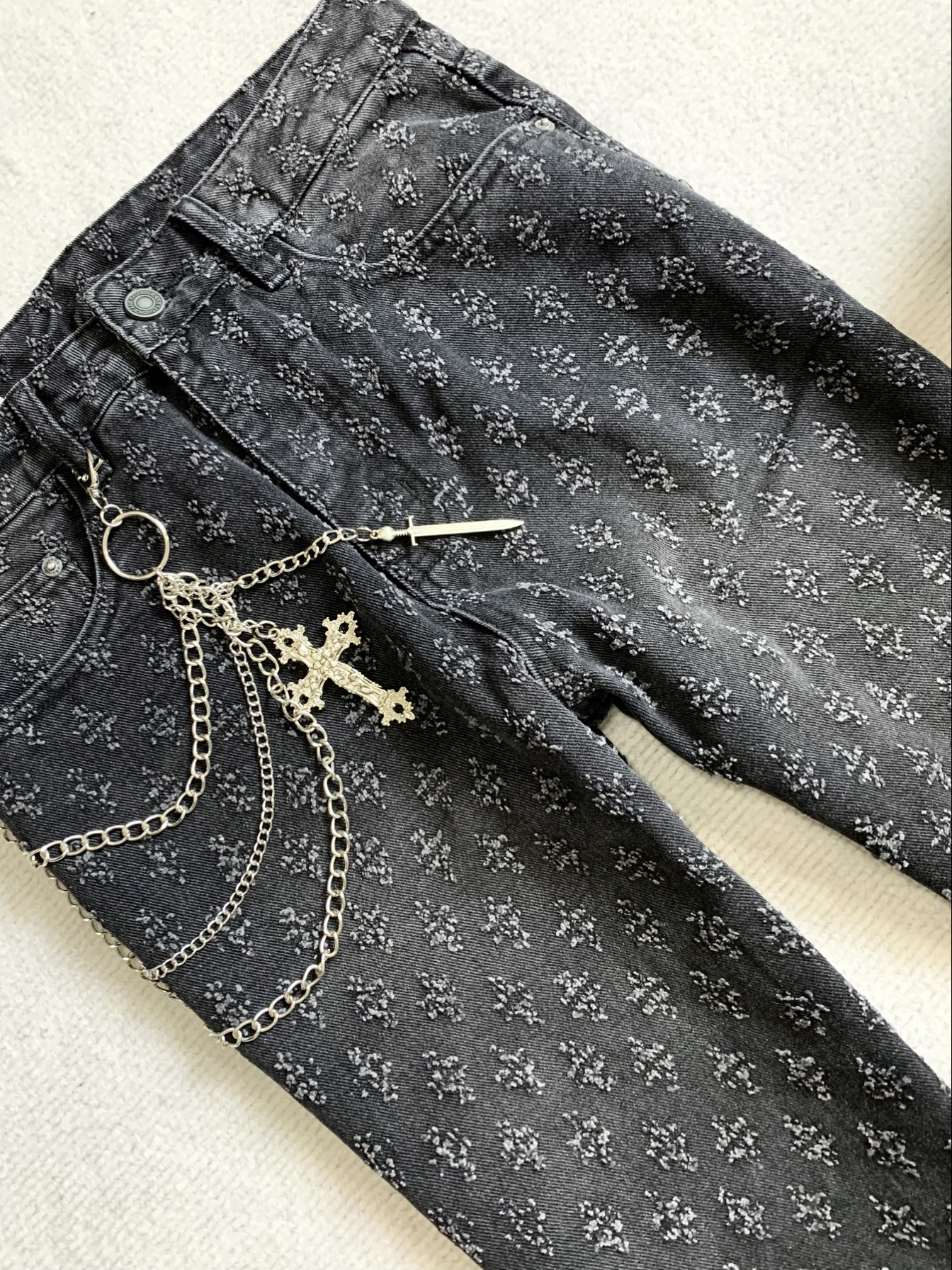 好痞帅的一条街头牛仔裤啊,这个满裤印花的设计我老喜欢了,有谁能懂吗,上身你们就说痞不痞吧,哈哈,版型老显瘦了,我很喜欢,必须穿的够帅家银们!