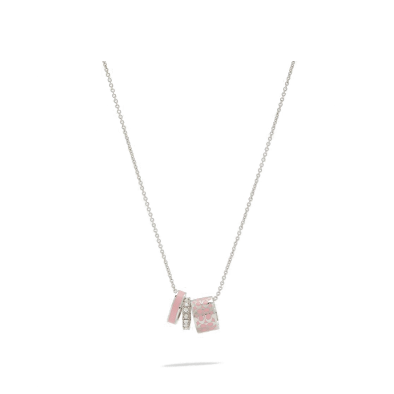 COACH粉银三环项链宣传 COACH经典三环项链,粉银配色甜酷交织:珐琅印满品牌标识,镶钻环缀满细碎星光,16+2英寸链身适配各类颈线。轻奢质感适配通勤、约会,是秋冬叠穿点睛之笔