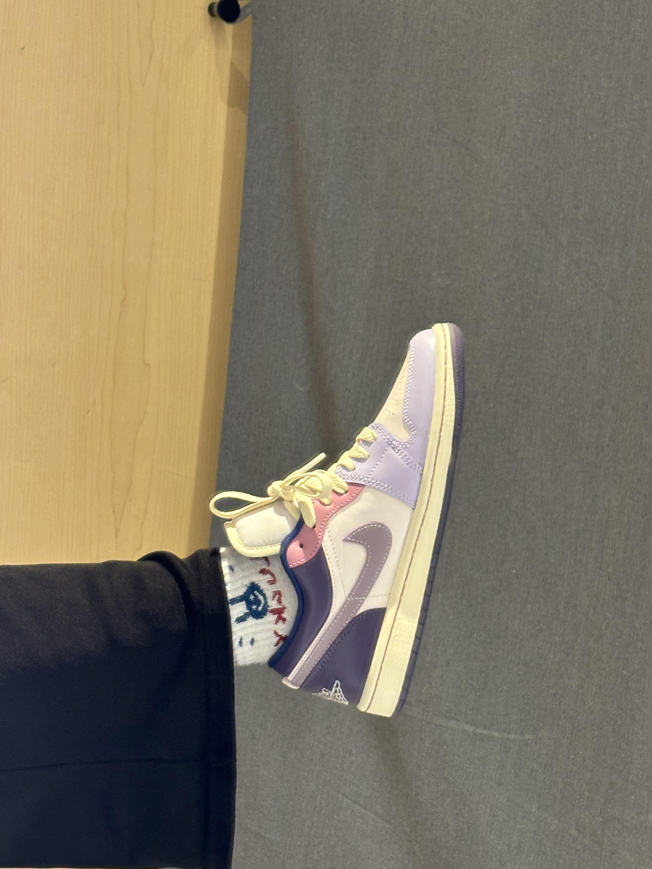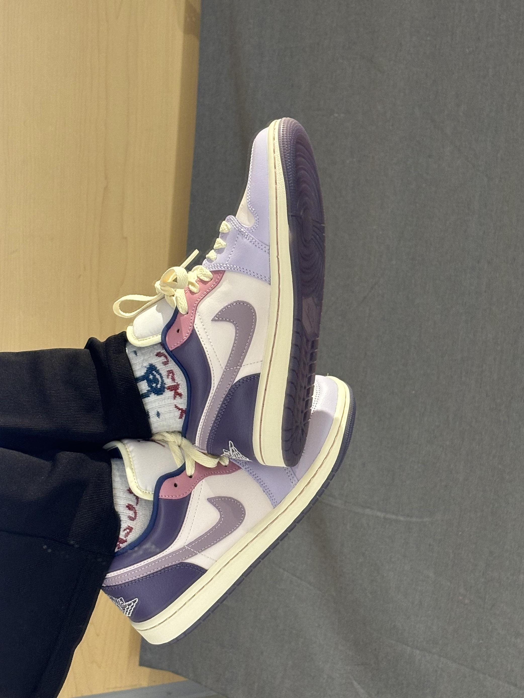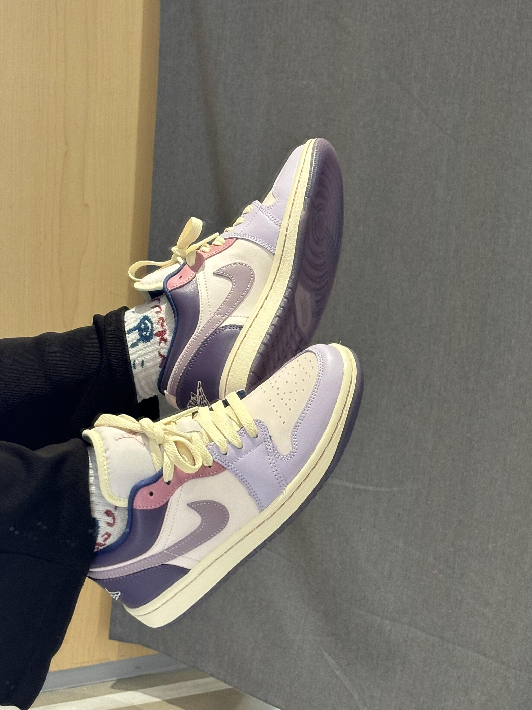 谁懂啊家人们!昨天穿这双鞋去食堂买饭,排队时隔壁桌的学妹直接递来纸条:“学姐这鞋链接发我!配色软到想咬一口!” 连我那从不夸鞋的直女室友,都摸了摸鞋帮说“这紫调比她的芋泥奶茶还戳人”… 说真的,我之前买的AJ要么显脚胖,要么磨后跟磨到贴创可贴,但这双“芋泥拼接”是真离谱——淡紫+奶白+粉调的撞色,像把春天的紫藤花揉进鞋里,配黑长裤露个鞋帮,楼下取快递都被快递小哥问“在哪抢的限定款”!最绝的是做旧...