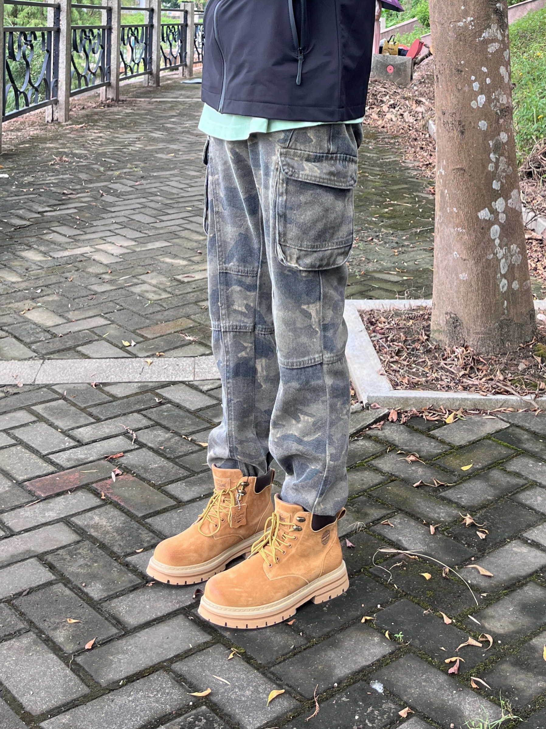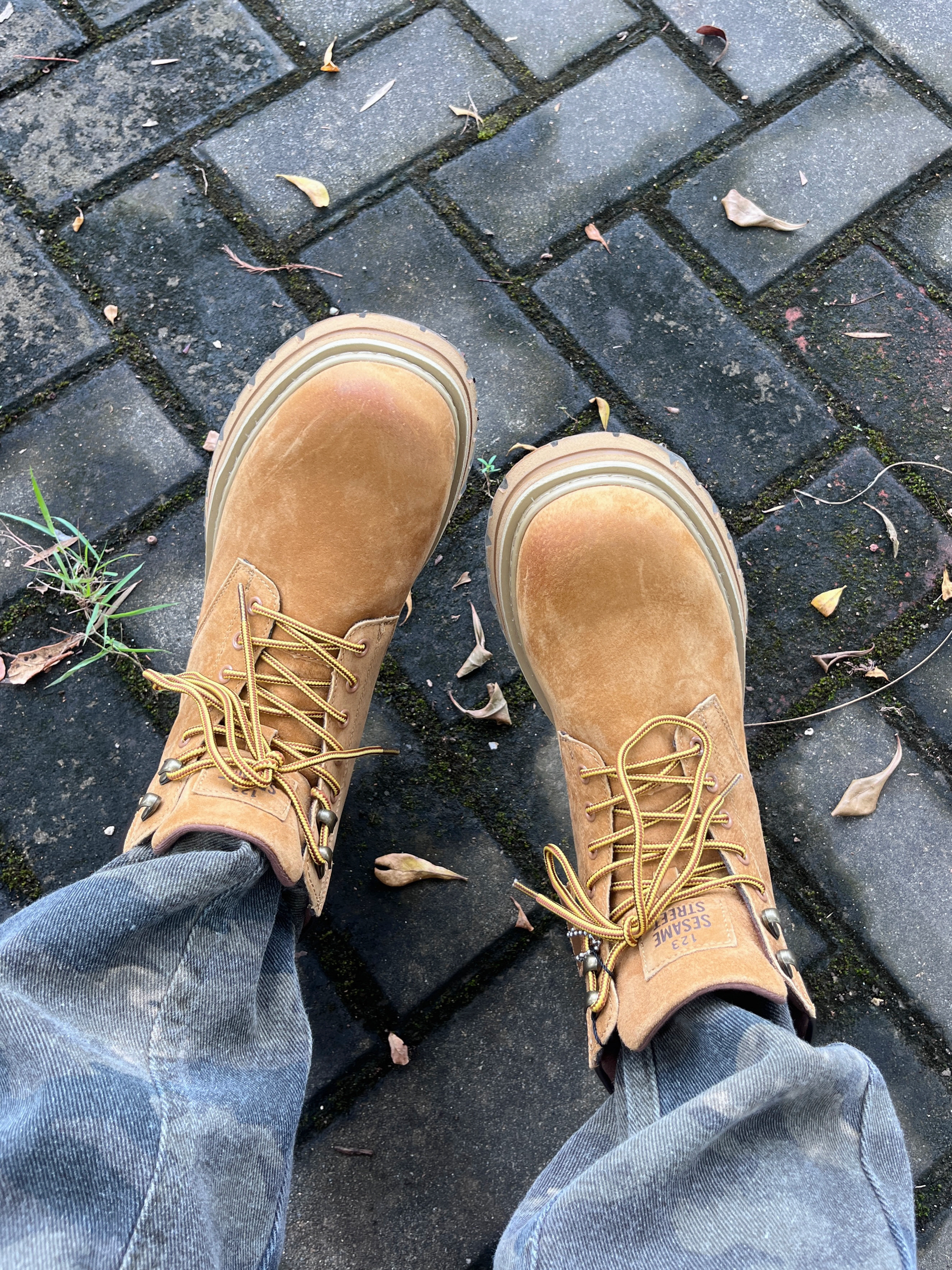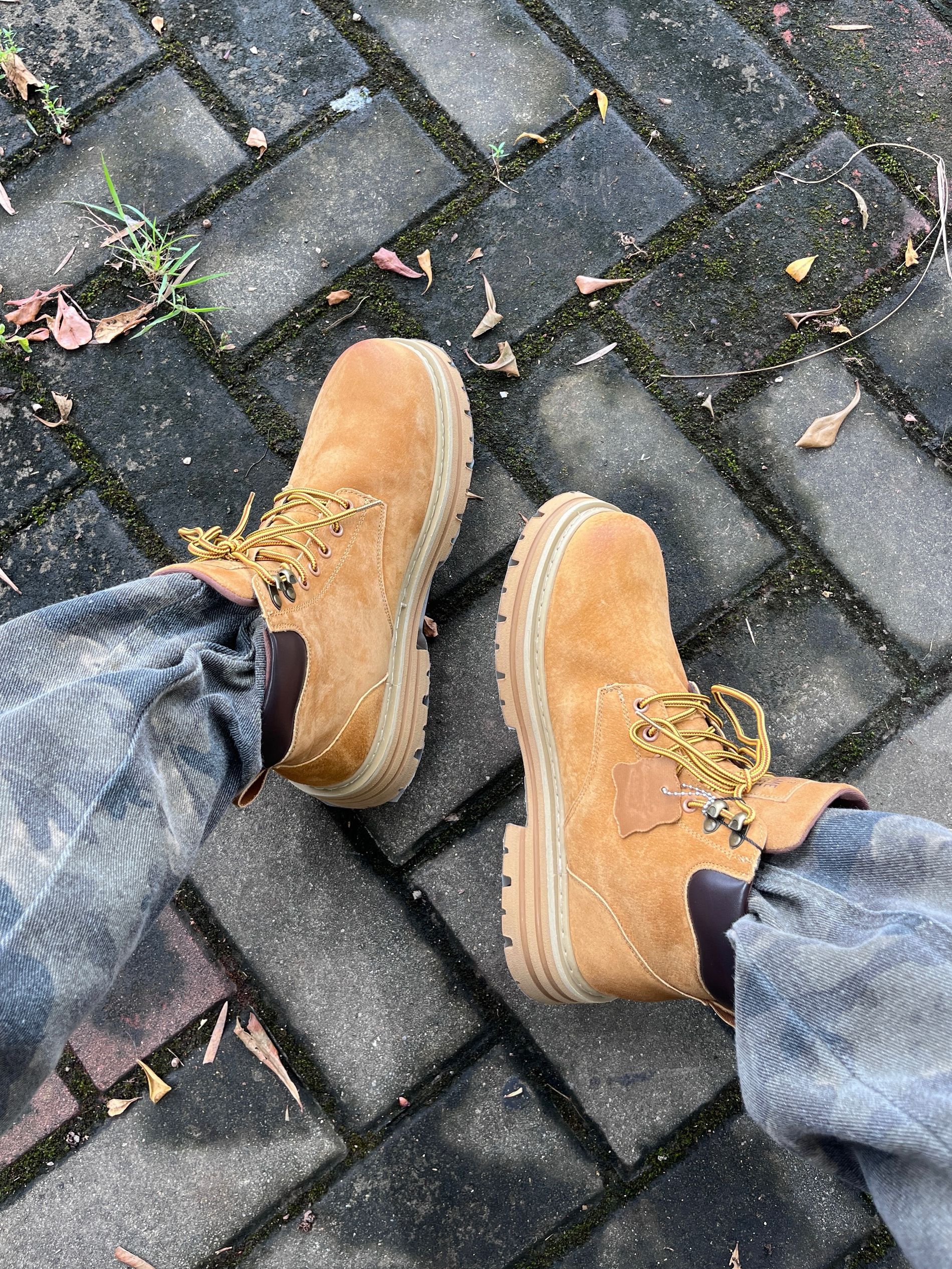 今日份秋日出街上脚 SESAME STREET 的马丁大黄靴🥾 棕黄配色颜值复古时尚 - 皮革面料质感满满 脚感也很舒适透气🔥 搭配上休闲运动外套👔和迷彩工装裤👖 / 一套搭配下来 秋日出行百搭又好看🚶