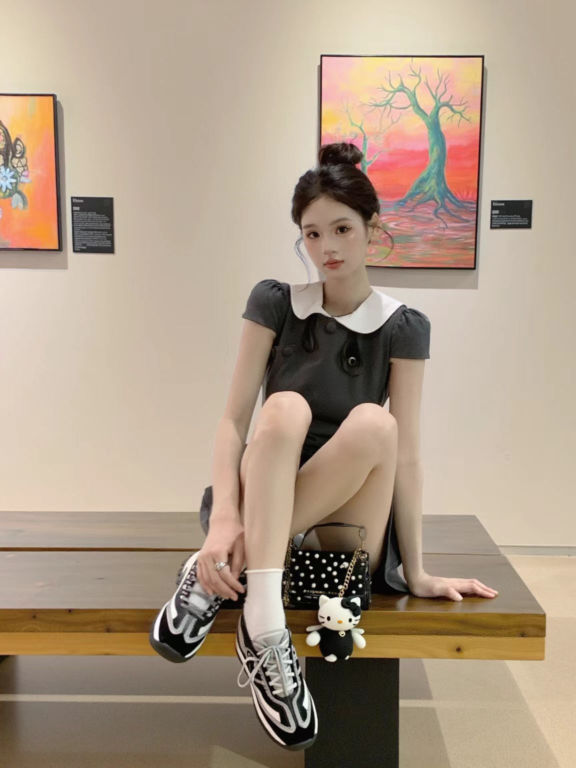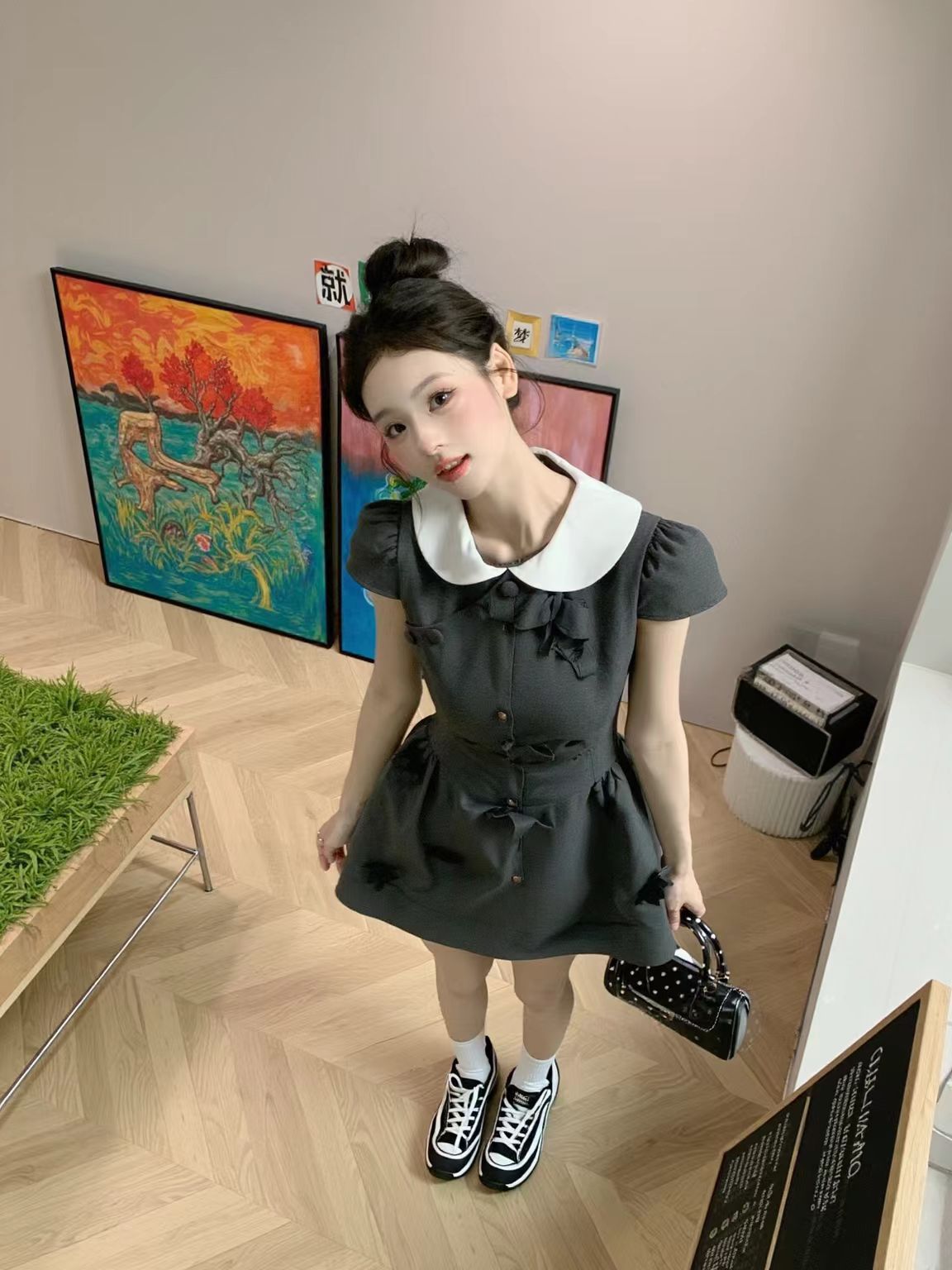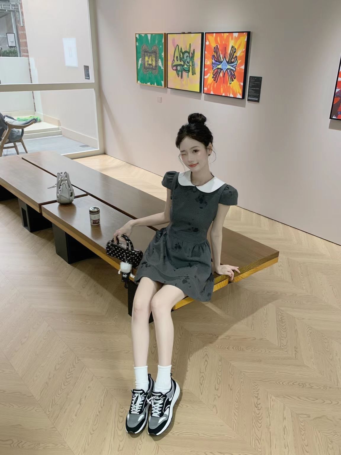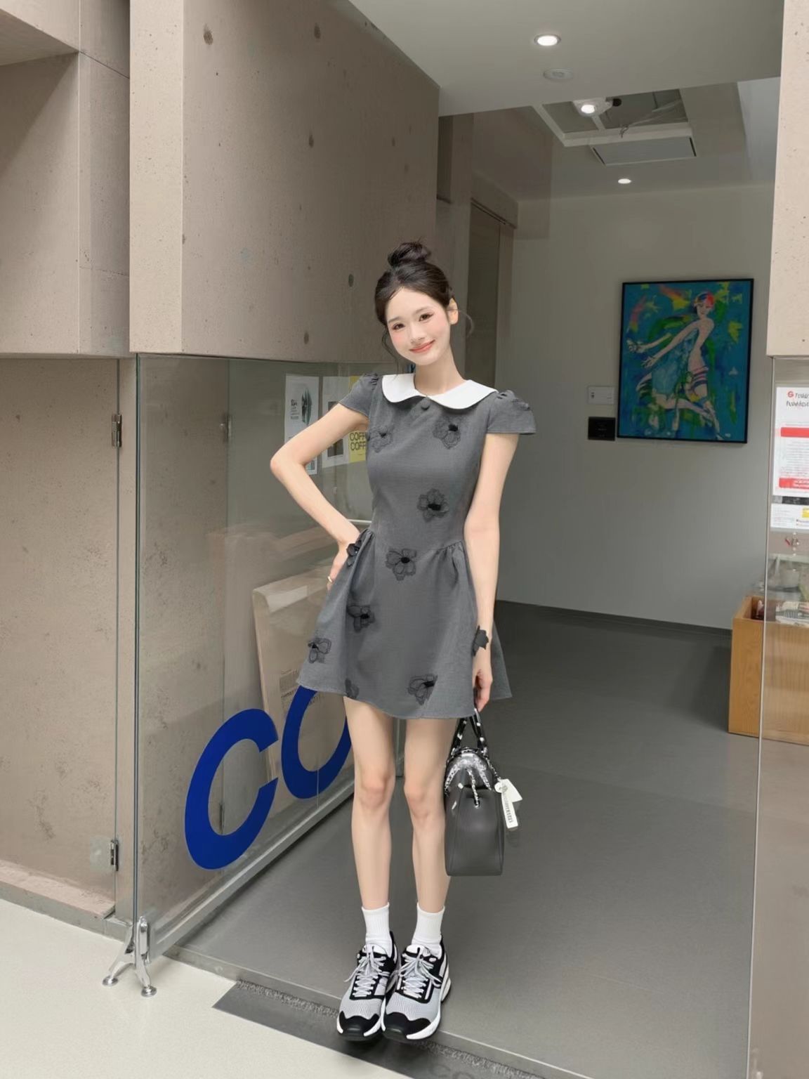 谁懂啊家人们!这套灰调娃娃领连衣裙真的把甜酷感玩明白了~ - 领口的白色娃娃领自带少女感,裙身的立体小花和盘扣设计又藏着中式甜酷的小心机,收腰+蓬裙版型直接把腰臀比焊死,谁穿谁是漫画女主! - 搭配黑白老爹鞋和波点小包,甜妹瞬间变甜酷拽姐,逛艺术展、咖啡探店都能无缝衔接,出片率直接拉满! 这种风格碰撞的穿搭,不火没道理啊!快冲这套炸街王炸组合~