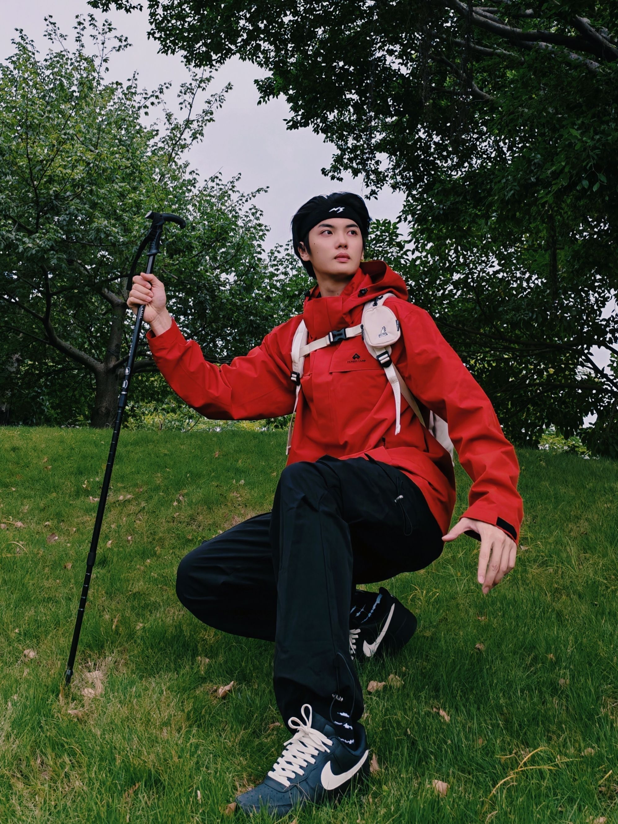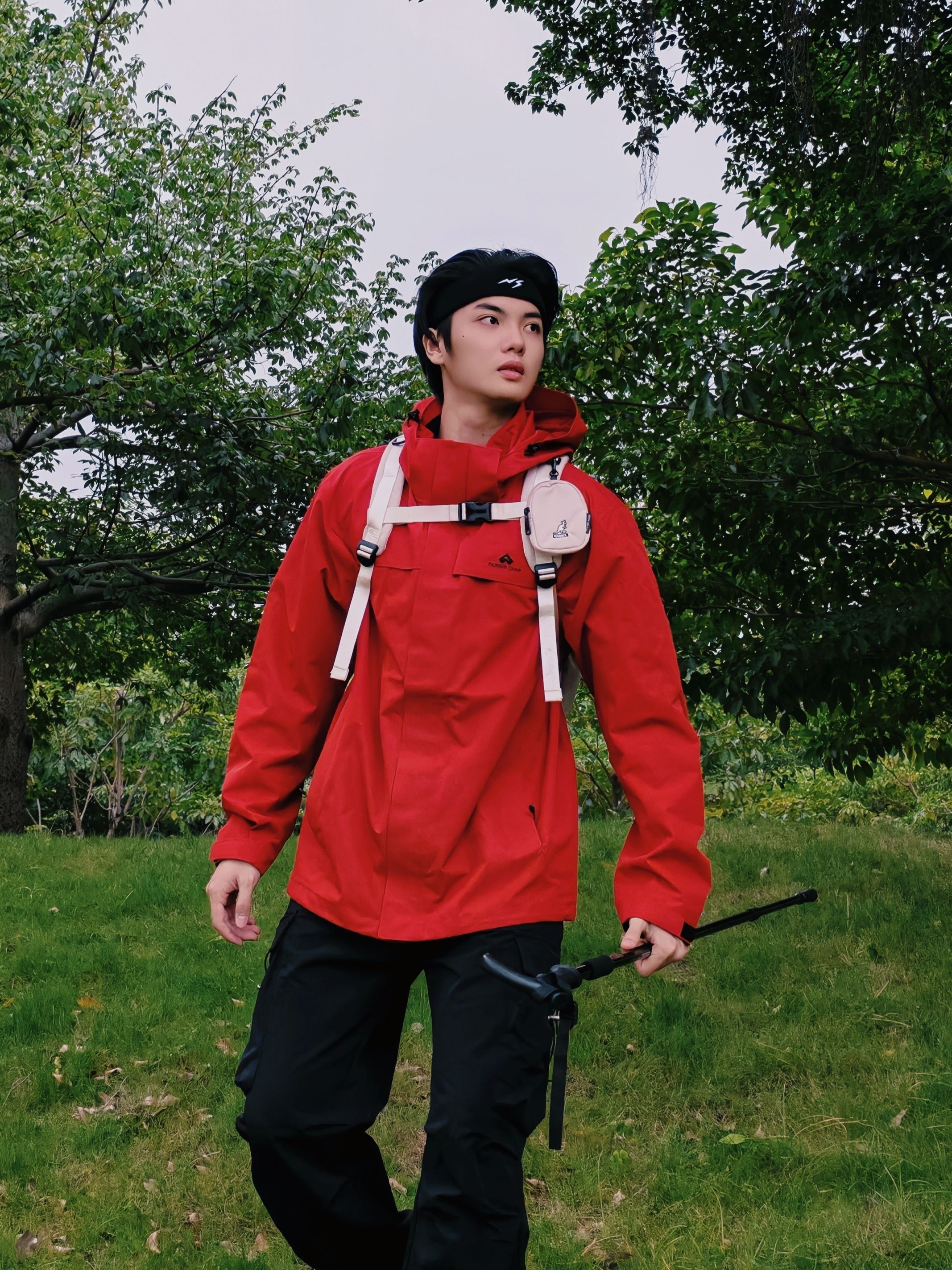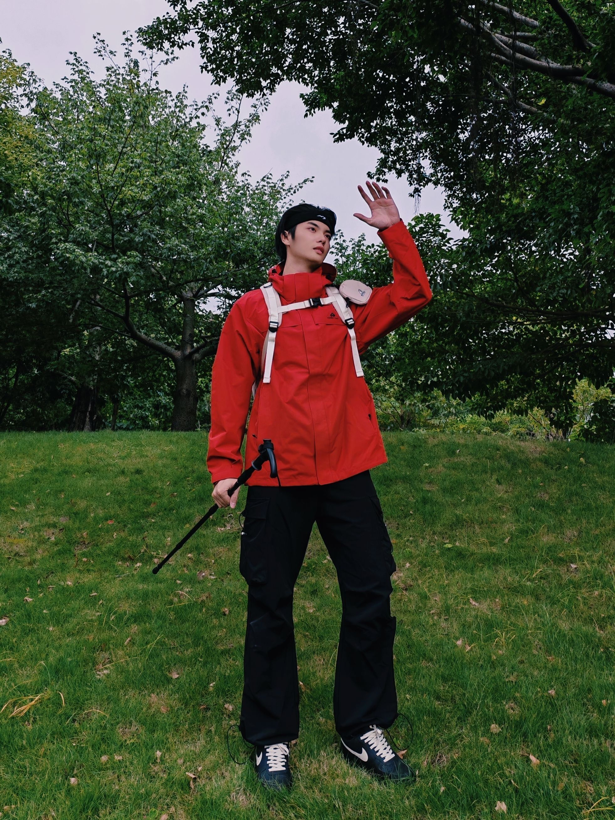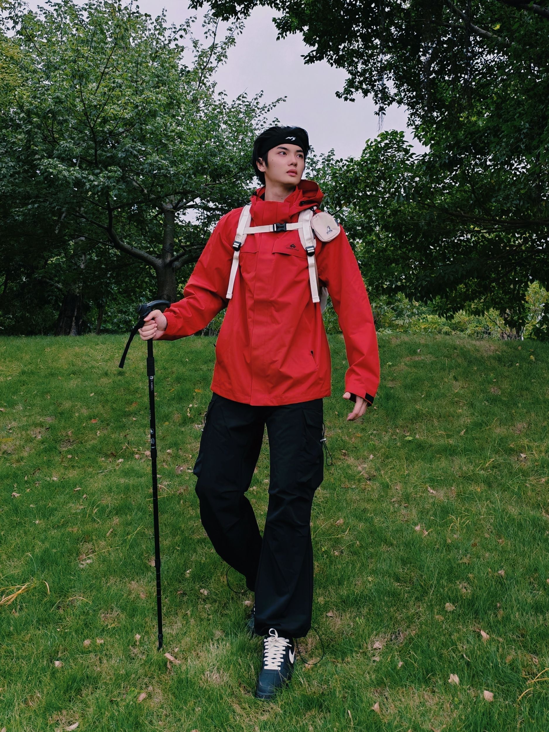 这套山系机能风穿搭把户外实用性和潮流感结合得绝绝子! 亮红色冲锋衣是视觉焦点,高饱和度色调在户外场景超吸睛,防风防水的材质应对多变天气很靠谱~ 搭配黑色多袋工装裤,功能性口袋+利落剪裁,山系感拉满。 配饰也很有心思:黑色闪电发带增加潮酷细节,米色机能小包+骆驼登山杖,实用又契合风格,徒步时放个手机、钥匙很方便~ 这种穿搭不管是周末近郊徒步,还是城市户外风出街,都能轻松hold住,喜...