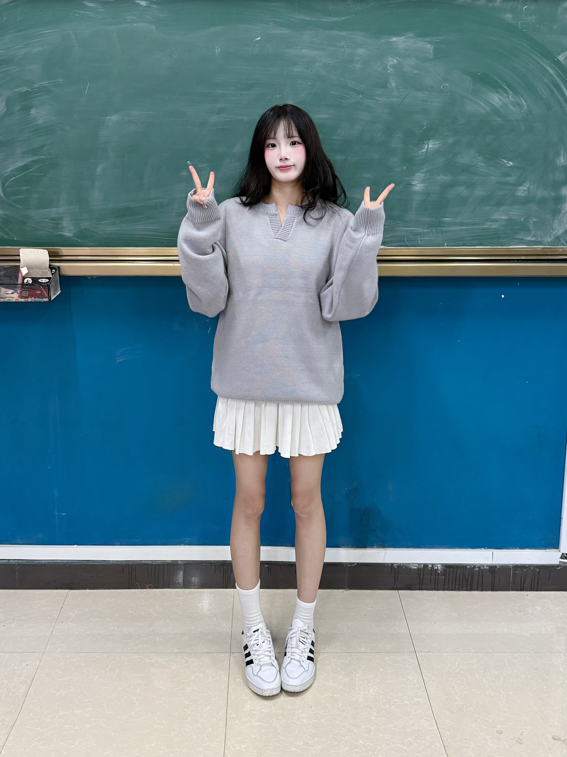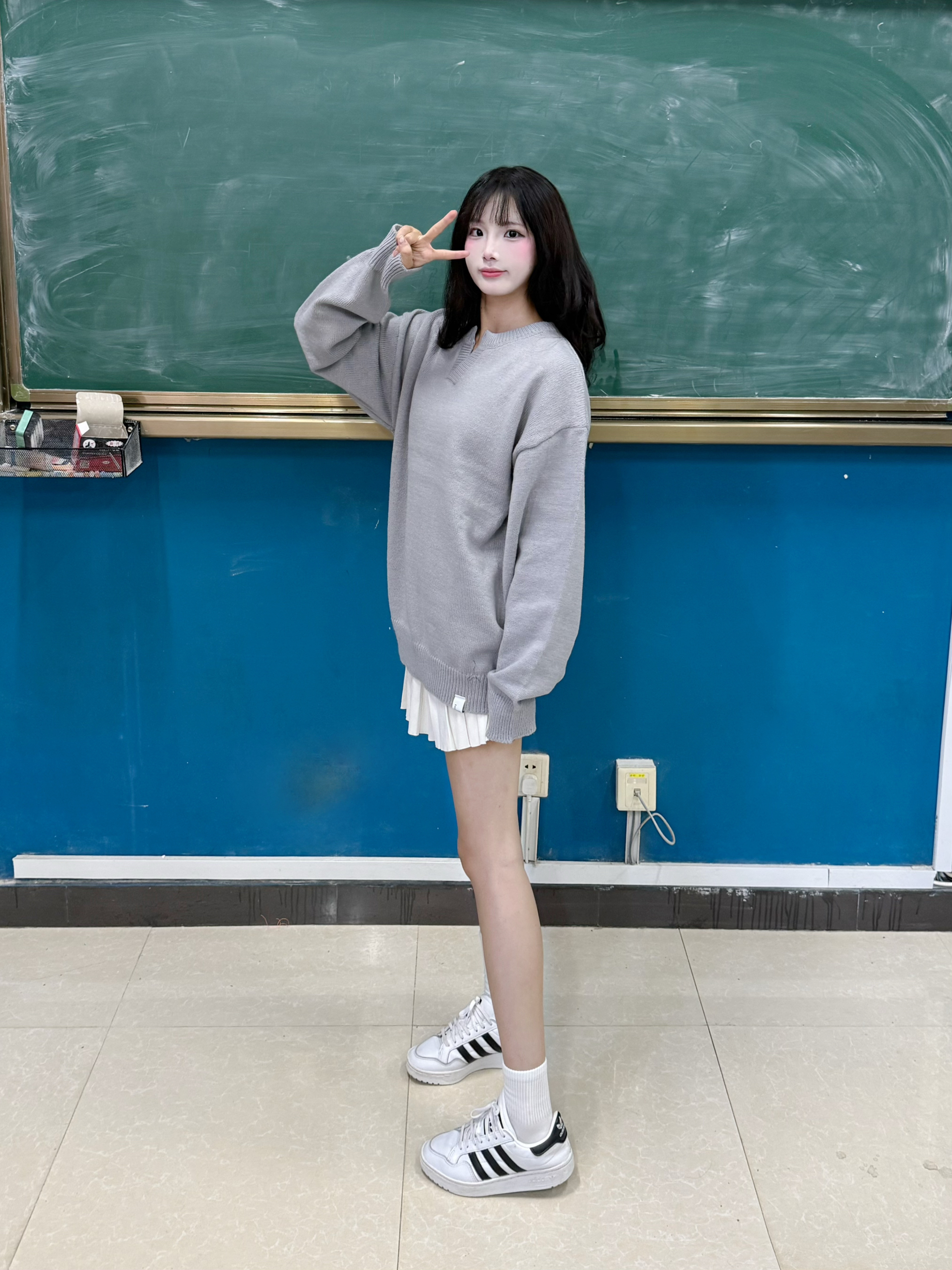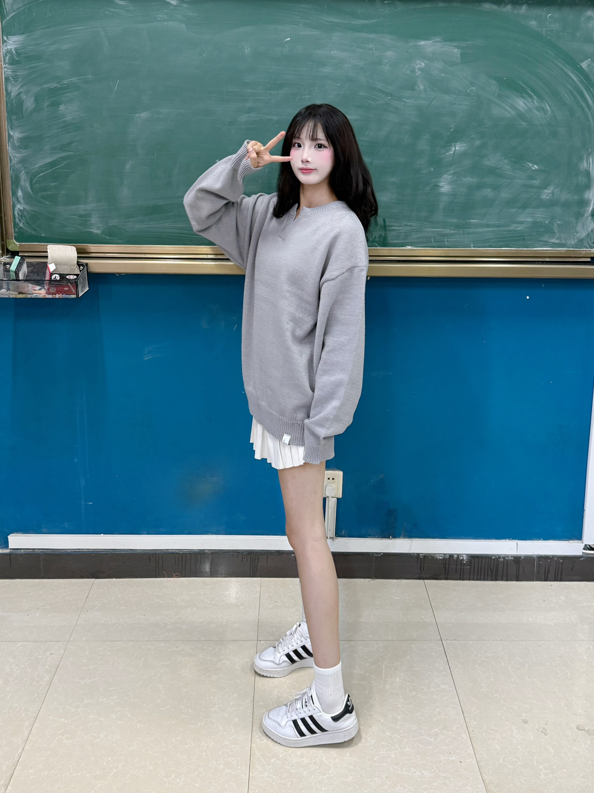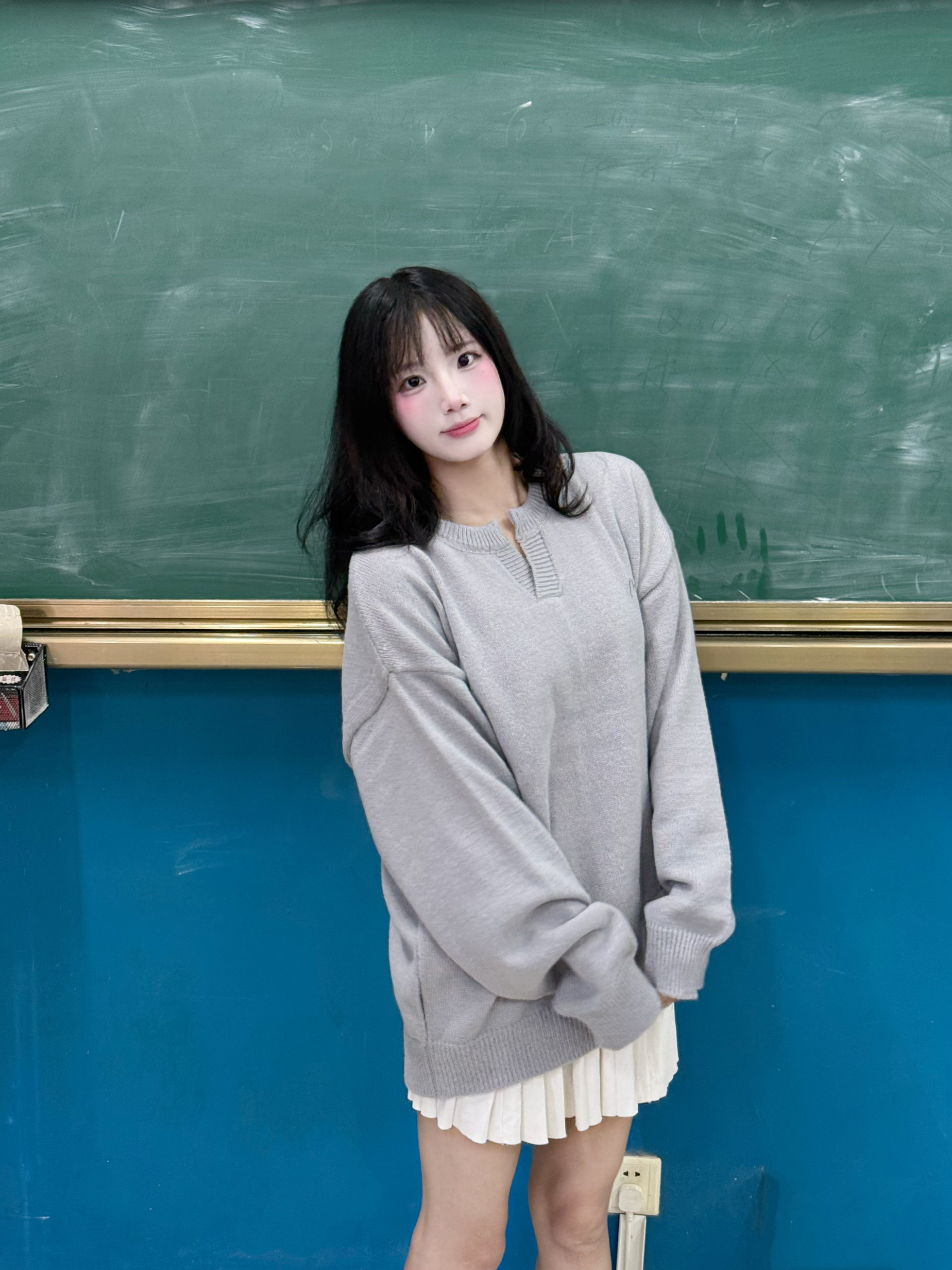 今天穿什么 今天穿 灰色 毛衣 ➕ 白色短裙 v领的设计显瘦又时尚 简单版型宽松舒适 160:90穿的m