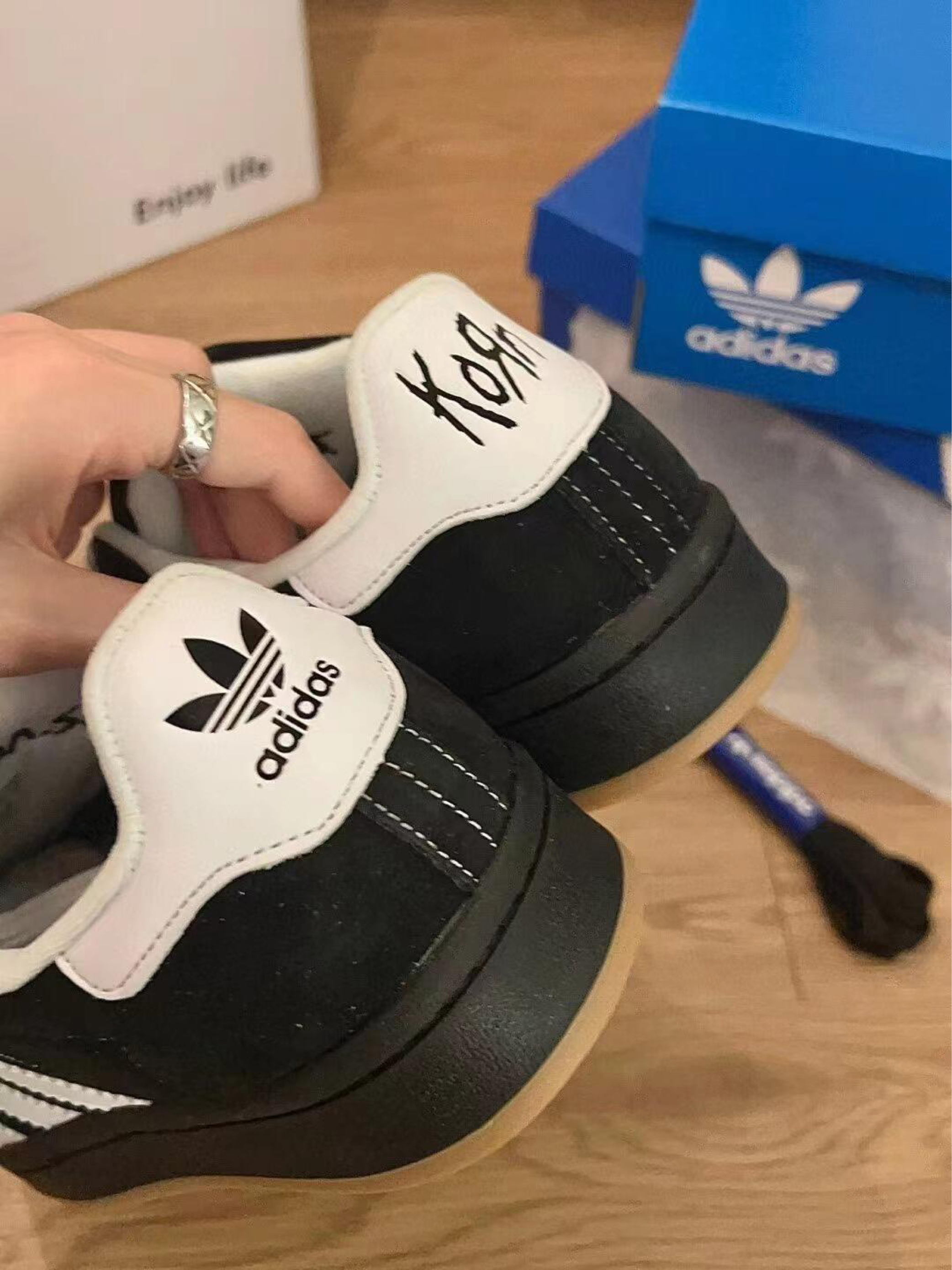 家人们谁能信,我穿这鞋去livehouse,老板拽着我脚喊:“这鞋舌的涂鸦是摇滚乐队签名吧?黑麂皮比我家舞台幕布还野”! 上周穿这鞋挤livehouse前排,刚蹦完一首歌,邻座乐迷凑过来摸鞋:“这黑白配+手写涂鸦,比乐队周边还炸!麂皮踩起来比舞台地板还带劲”!(社死但爽:我穿它蹦了三小时,鞋帮软到没磨脚踝,黑麂皮抗造到被踩了N脚都没脏,回家换了送的黑鞋带,秒变另一种暗黑风!) 有没有和我一样的...