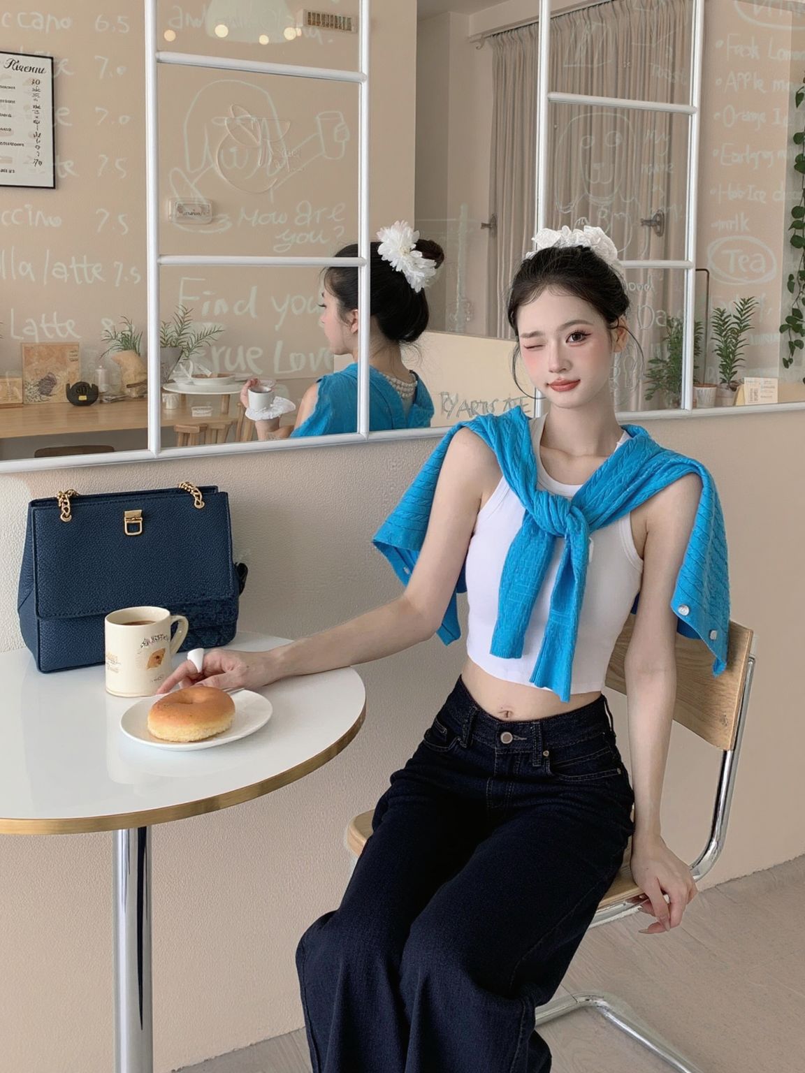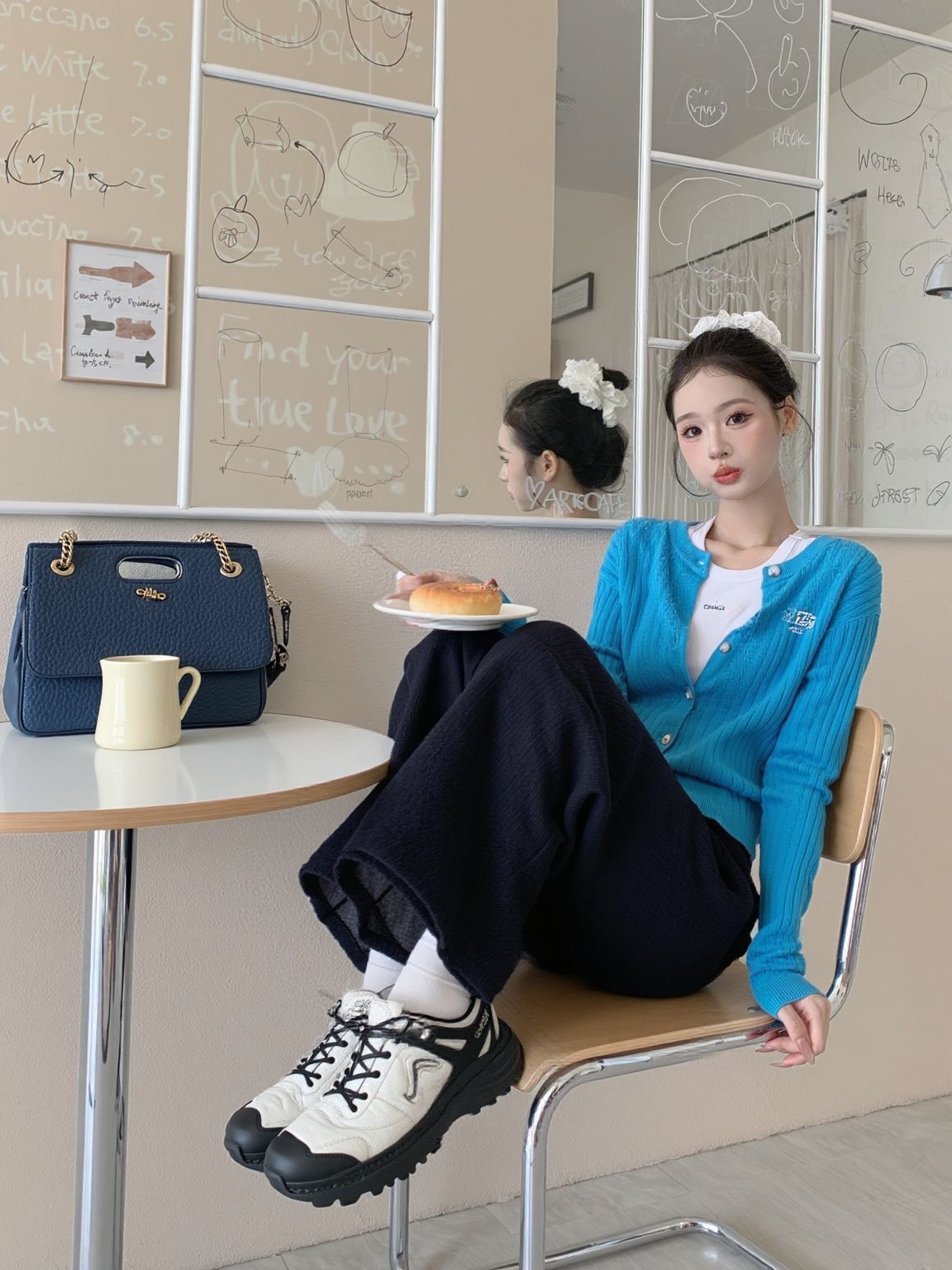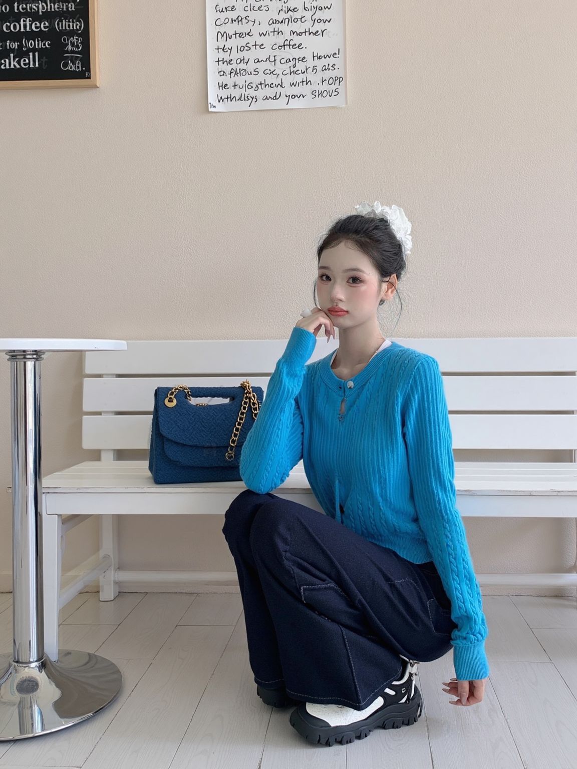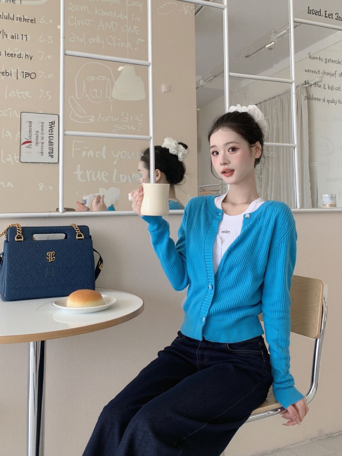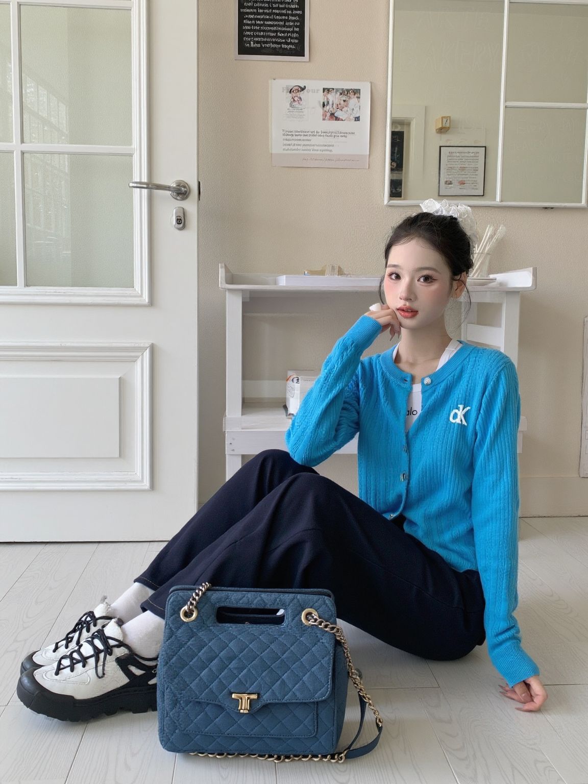 挖到宝了家人们!这套韩系穿搭直接封神! 💙克莱因蓝针织开衫:坑条纹理+珍珠扣设计,质感拉满,软fufu不扎肤,百元价位直接平替博主款! 👖藏蓝阔腿牛仔裤:垂感巨好!高腰+阔腿版型,小个子也能穿出1米8既视感,显腿直还遮肉~ 👟厚底老爹鞋:脚感软弹,搭配白袜直接拿捏韩系慵懒感! 同色系包包一搭,整套look高级又协调,日常出街/咖啡店拍照都巨出片! 链接已经帮你们扒到了,性价比直接拉满!