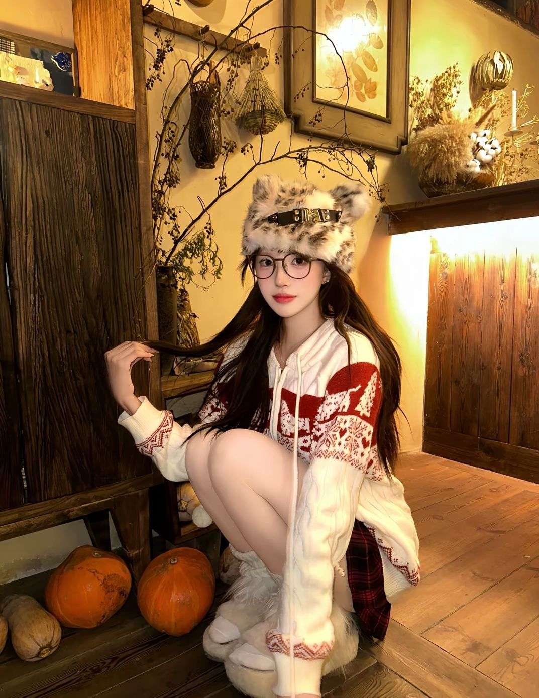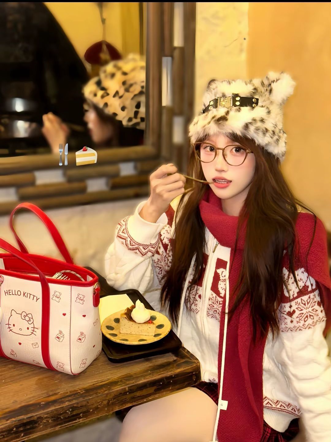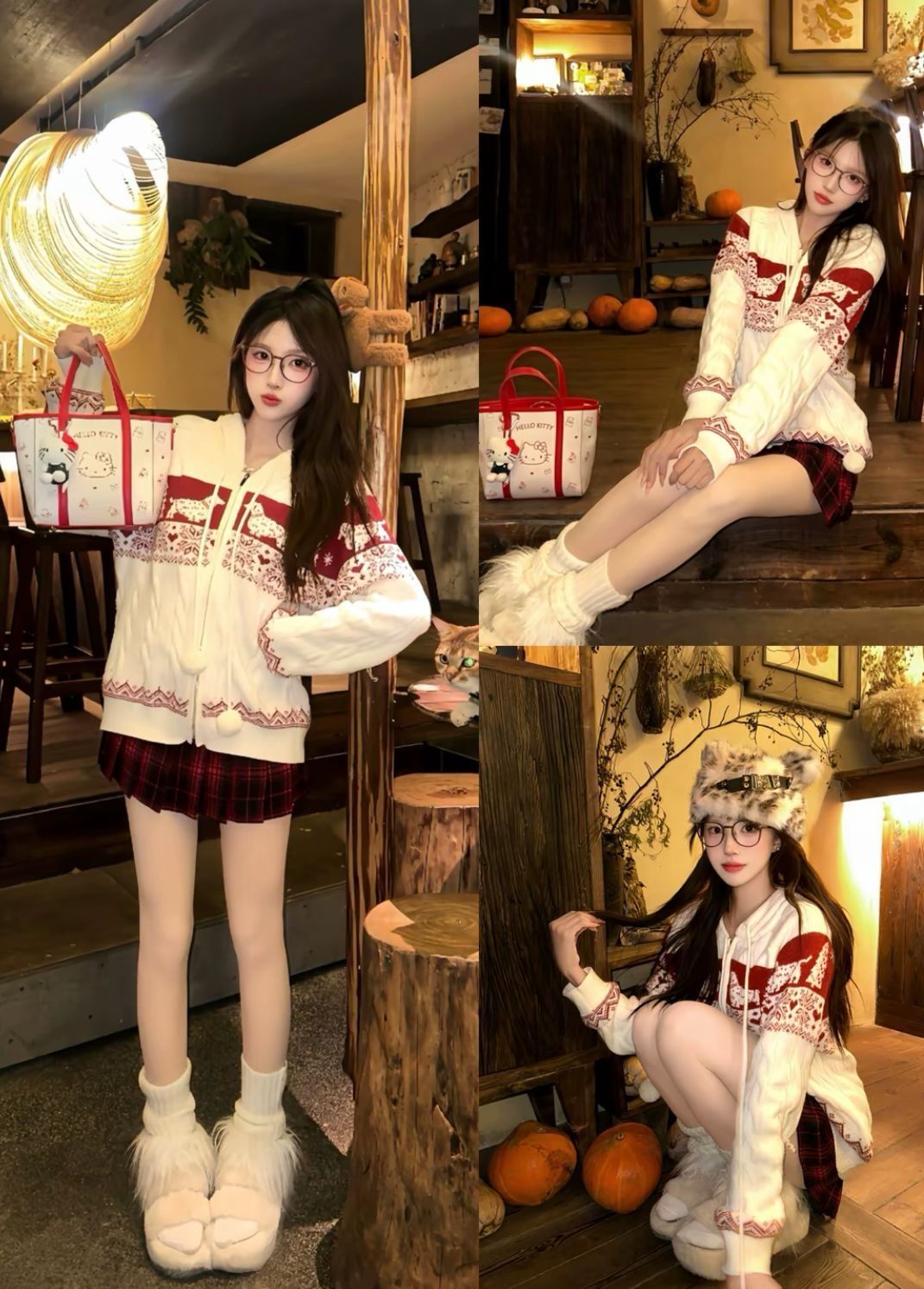 一到秋冬就沦陷在这种美丽又保暖的搭配里! • 费尔岛风针织外套:红白配色氛围感拉满,针织纹理+可爱提花设计,拉链款可以当卫衣还能当开衫穿,一衣多搭! • 红黑格纹百褶裙:短款版型超显腿长,格纹元素经典又复古,和外套凑成CP,好显腿长 • Hello Kitty手提包:朋友送滴 奶fufu的配色+萌系印花,容量超能装,搭配毛绒靴和豹纹猫耳帽,首尔街头甜妹那味儿一下就有了 #秋冬氛围感穿搭 #oot...