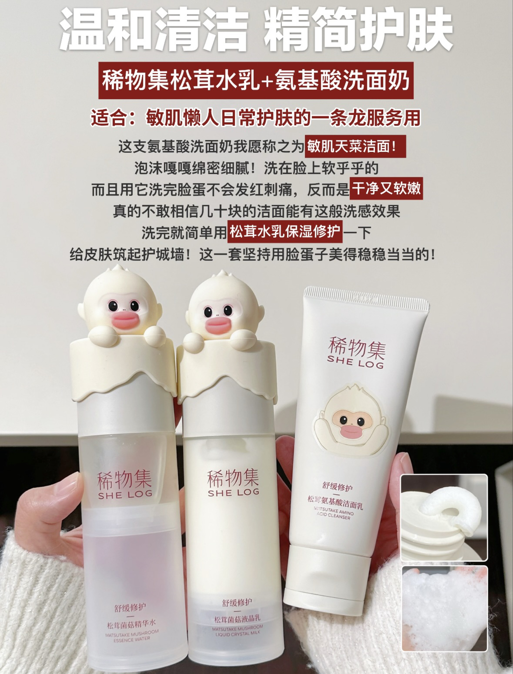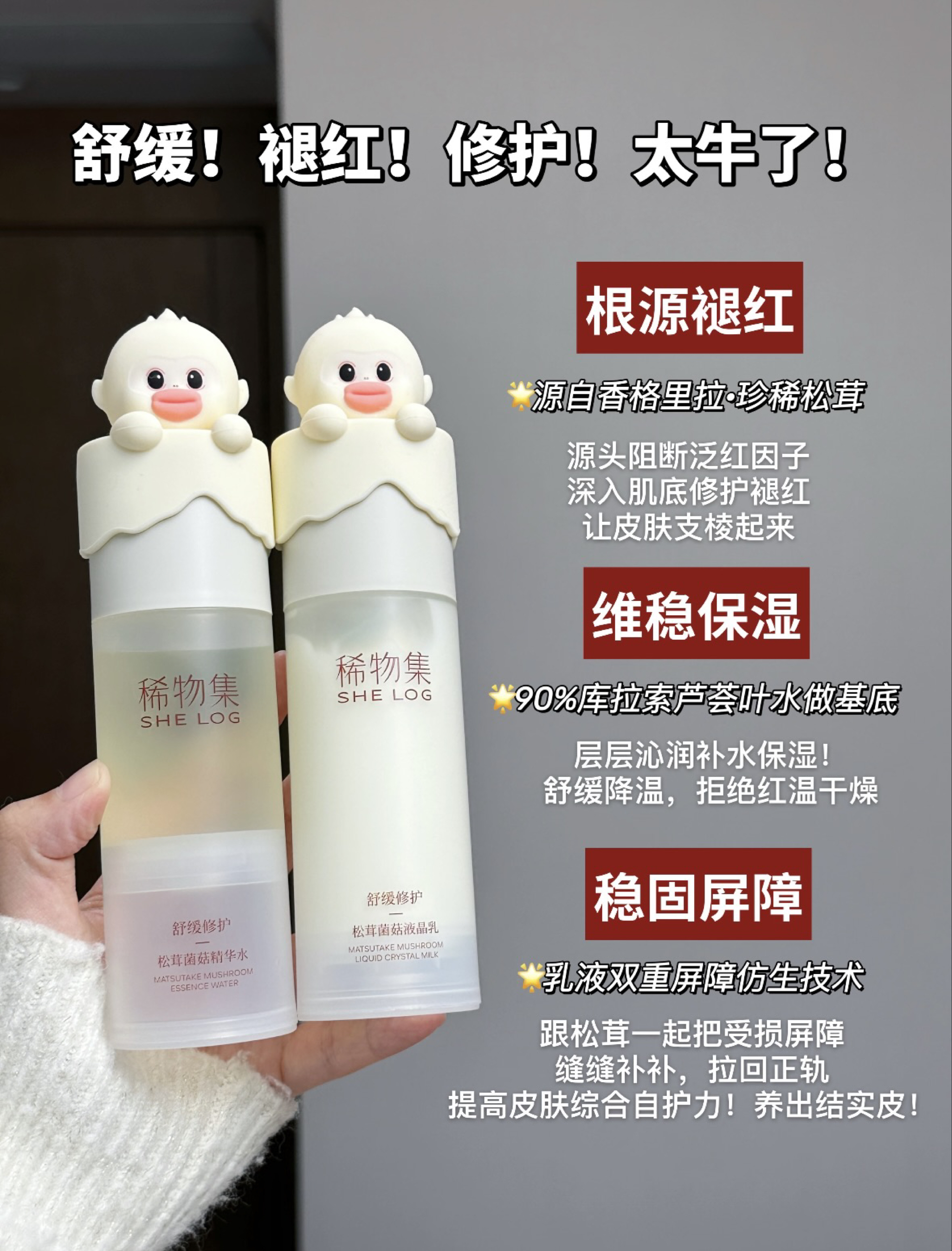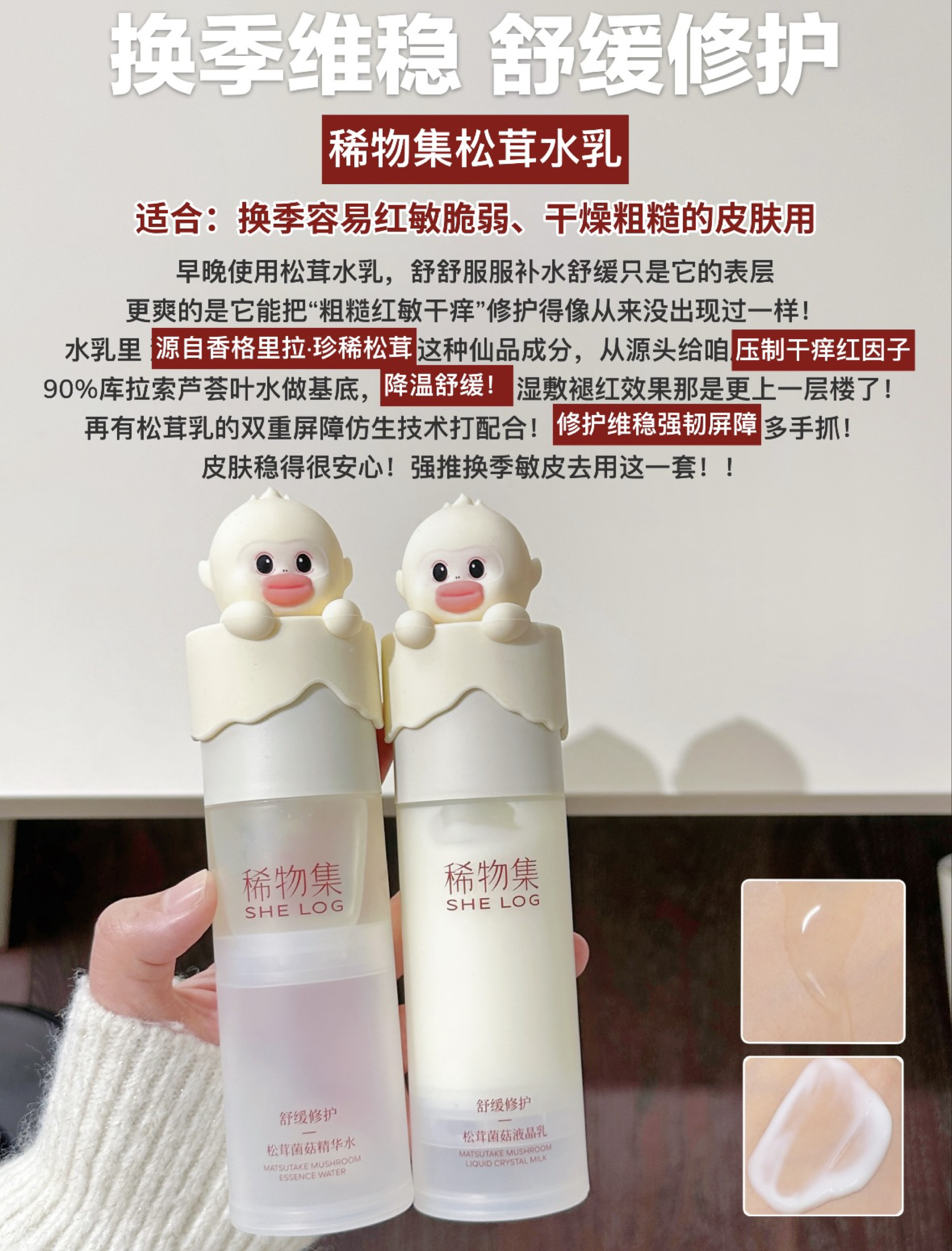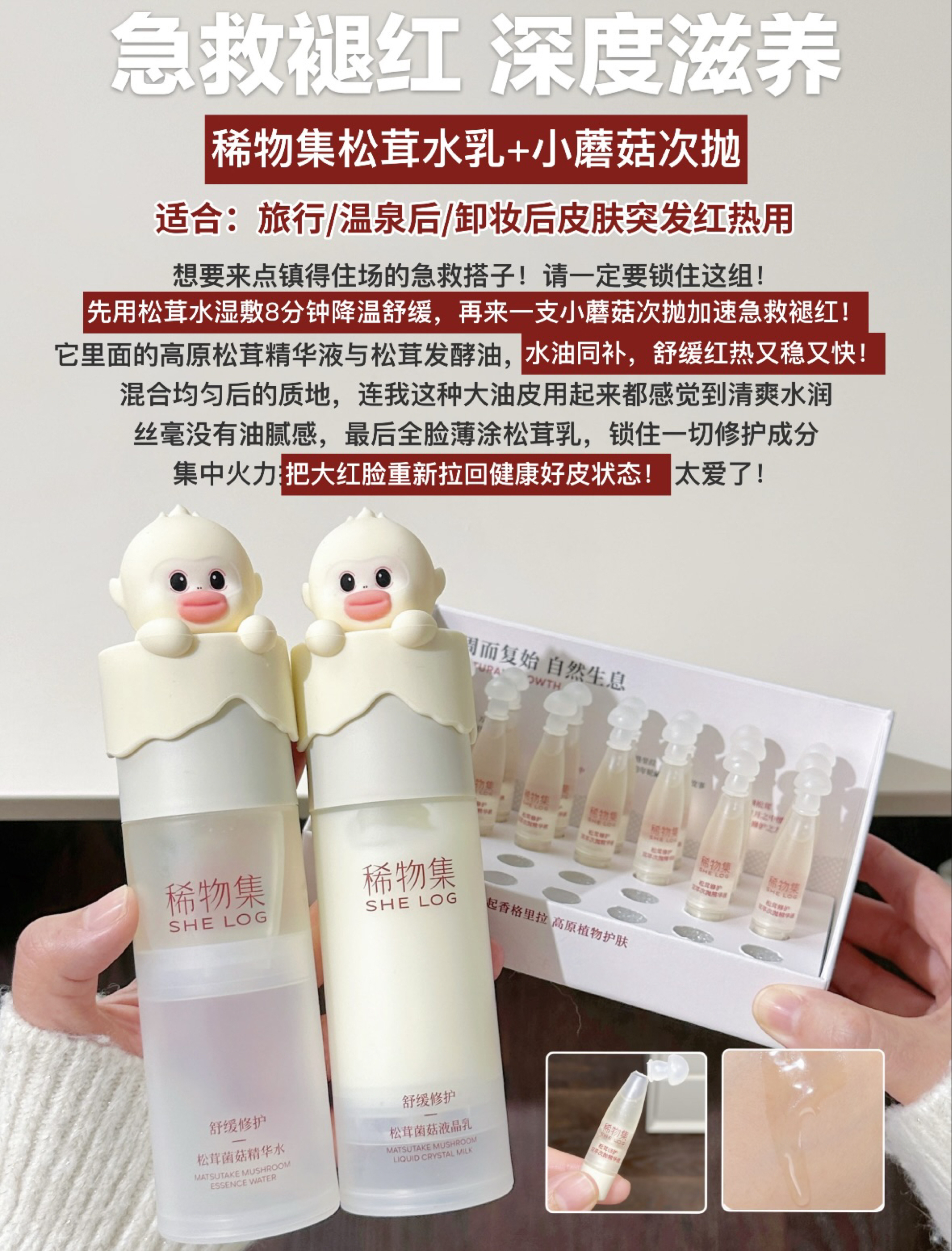 本篇笔记关联了稀物集 松茸双萃次抛精华液 修护舒缓维稳 小蘑菇 滋润、【滇金丝猴限定】SHE LOG/稀物集 松茸水乳护肤套装【水+乳+洁面+面膜】补水保湿修护舒缓泛红 水100ml+乳100ml+洁面100g+修护面膜5片等商品,为用户提供真实的使用体验和购买参考。