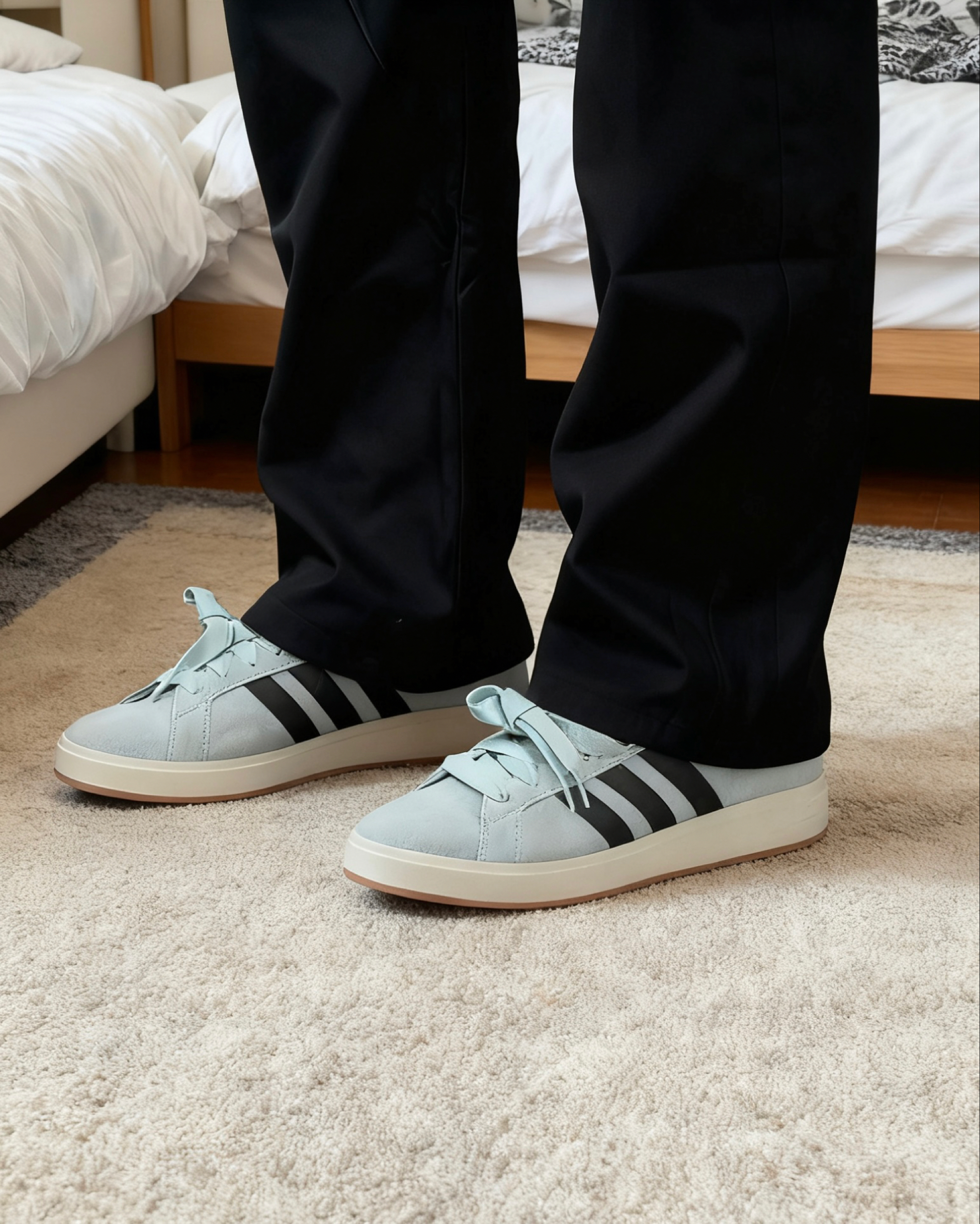 这双浅薄荷调的阿迪板鞋,算是近期挖到的“颜值+实穿”宝藏款。雾面浅灰与薄荷绿的渐变配色自带清冷氛围感,麂皮拼接网布的材质,摸起来绒感细腻又透气,鞋舌的缎面蝴蝶结甜酷中和,搭牛仔裤显松弛、配小裙子添温柔,日常通勤或周末逛街都能直接“套上出门”。 脚感也超出预期:软弹鞋垫踩上去不板脚,走一下午也没磨后跟,宽脚穿起来包裹感刚好不挤脚。不过小缺点也有——麂皮容易沾深色衣物的绒毛,得偶尔用粘毛器打理;缎面...