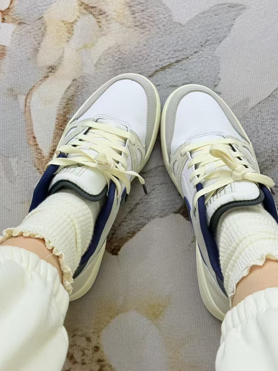 这双鞋上脚一周,先说说真实感受👇 拿到手是干净的浅色系,配米黄鞋带还挺耐看,日常搭牛仔裤、运动裤都不违和。脚感比想象中软一点,走个两公里路,鞋底的支撑不算顶好但也不硌脚,算是舒适那一挂的。鞋型偏瘦,我正常脚型穿刚好,宽脚可能得大半码。 缺点也挺明显:鞋面是那种容易沾灰的材质,穿一天鞋头就有点显脏,得勤擦;鞋舌稍微有点薄,系紧鞋带久了脚背会有点压。 另外鞋边的米黄色是做旧感,不是脏了哈~...