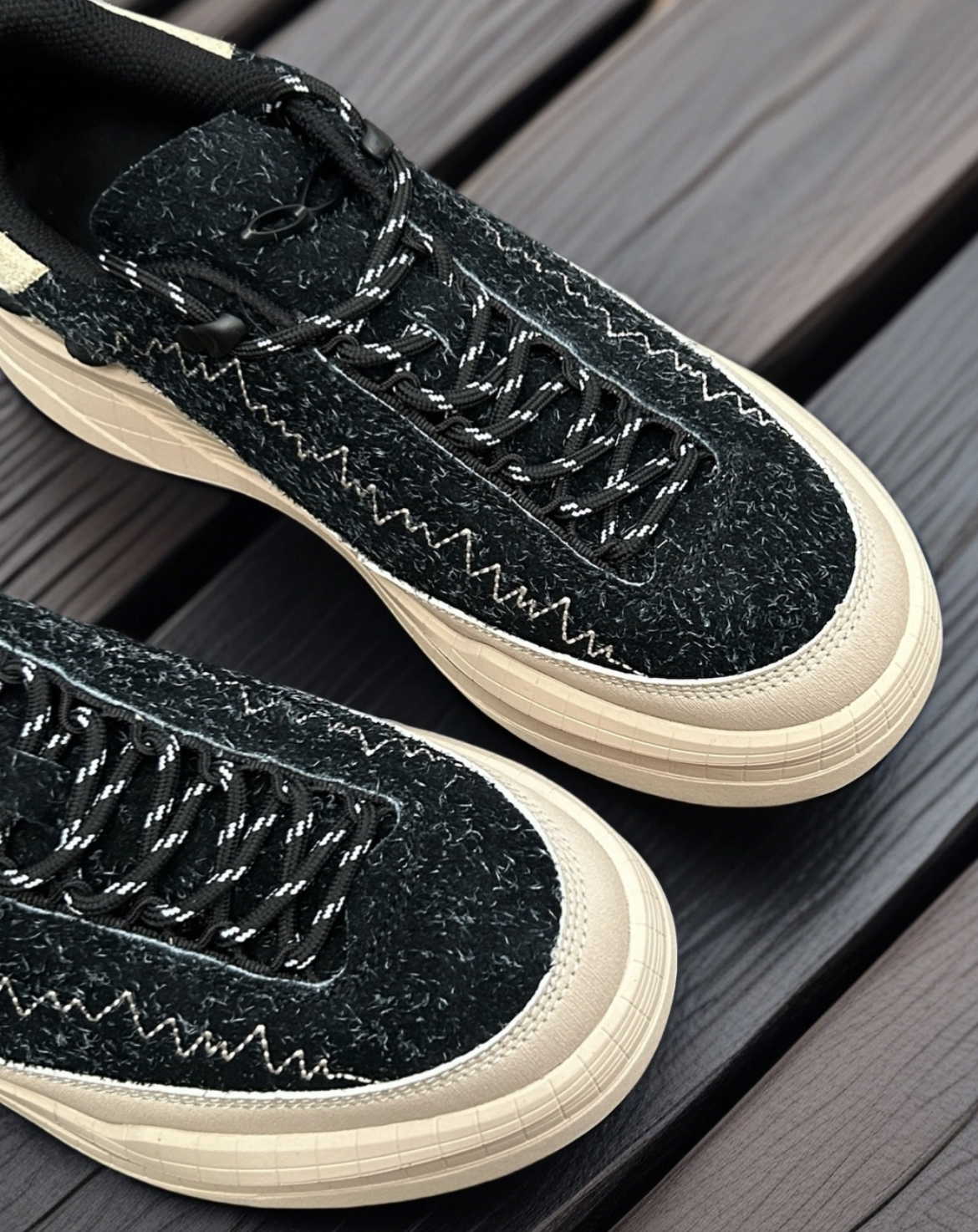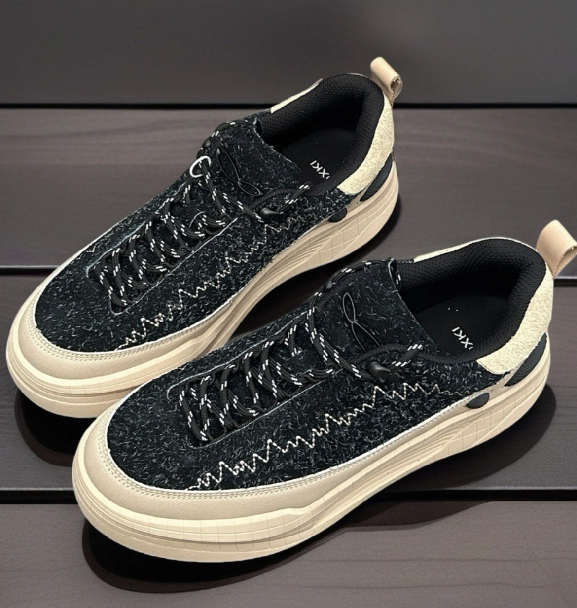 今天分享的这双板鞋,简单的黑色搭配,白色点缀的恰到好处,面料采用了牛仔布的设计,让鞋子更加的柔软,好穿,五厘米左右的厚底,增高效果也是十分OK的呢