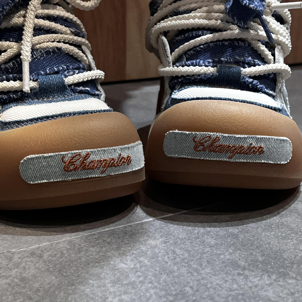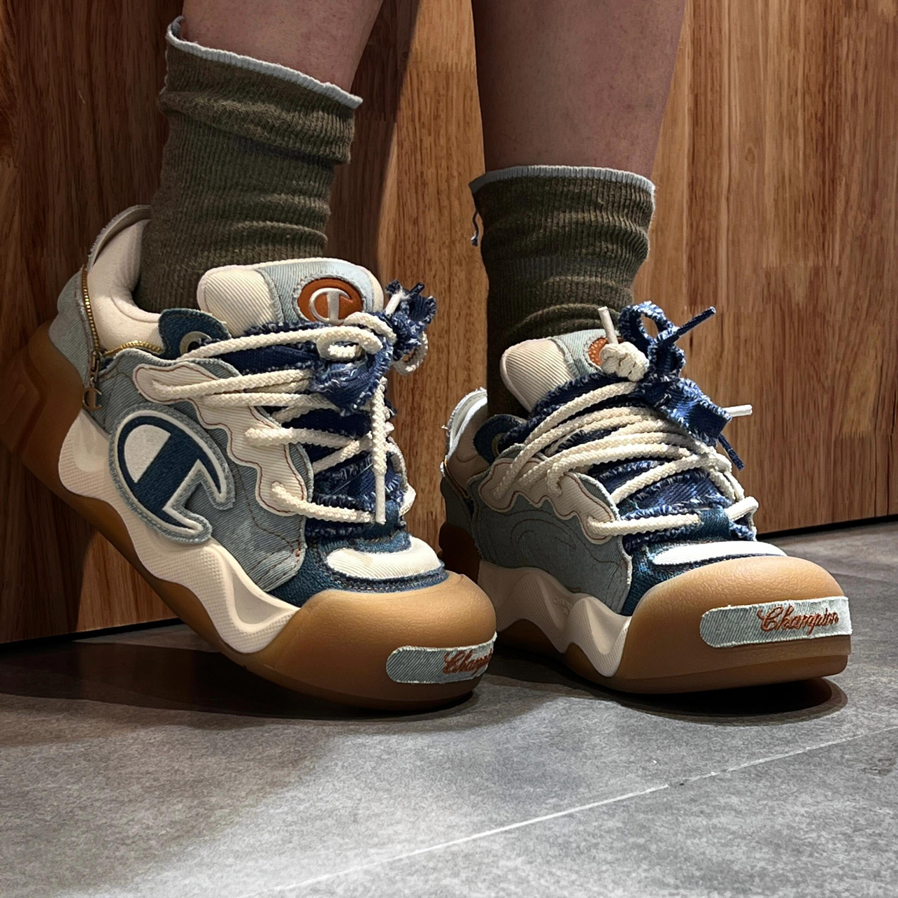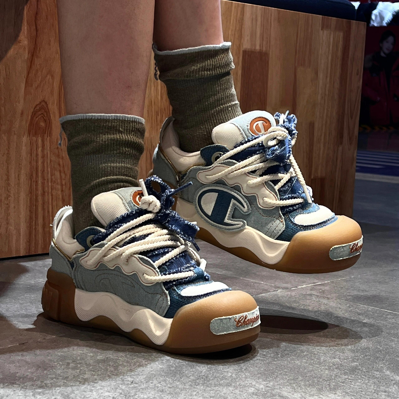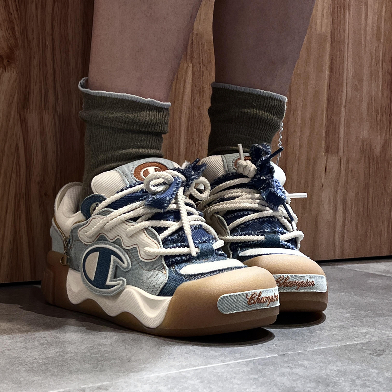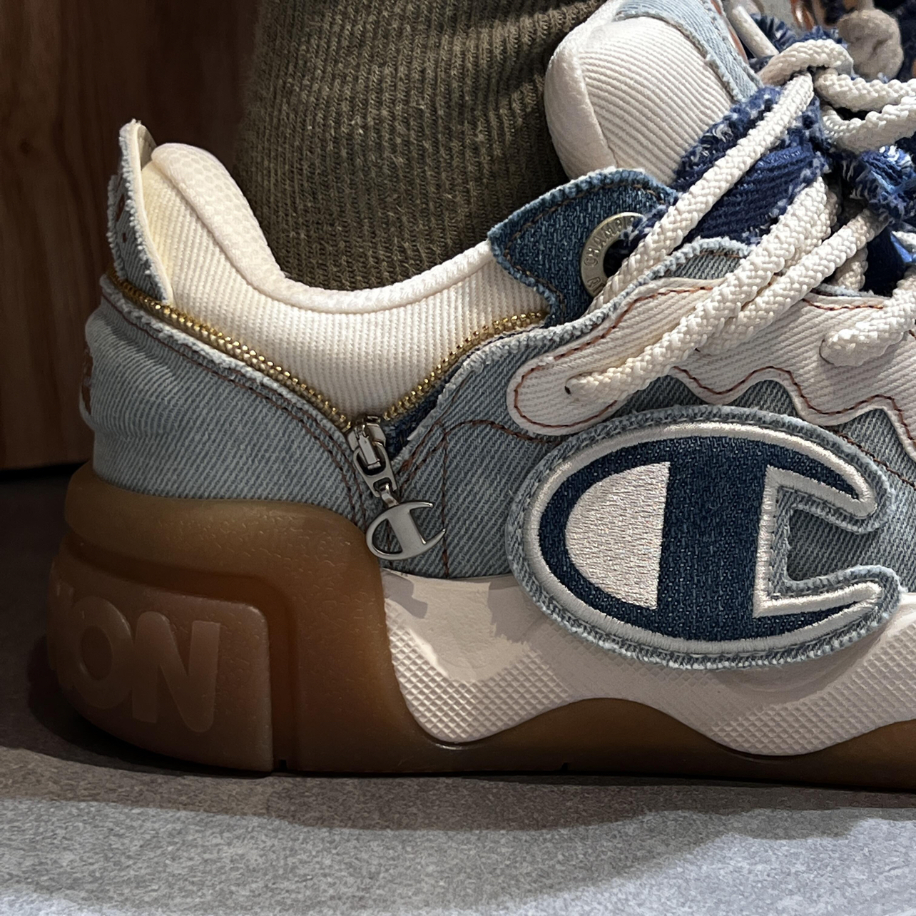 家人们谁懂啊!昨天穿这双鞋买拿铁,刚进门店员就盯着我脚笑:“这鞋又是牛仔布又是软乎乎的鞋带,是把衣柜里的料子都凑一块了?走路上会不会散架啊?”连邻座的小哥都凑过来摸——说“这鞋看着像拼的,摸起来居然这么软”… 先骂Champion设计师是把“混搭疯魔buff”焊鞋上了吧?做旧牛仔布+奶白软绳鞋带+波浪厚底,往咖啡店里一放直接像“从复古市集捡来的‘鞋界拼贴画’”,但离谱的是它居然是软底还不压脚款!...