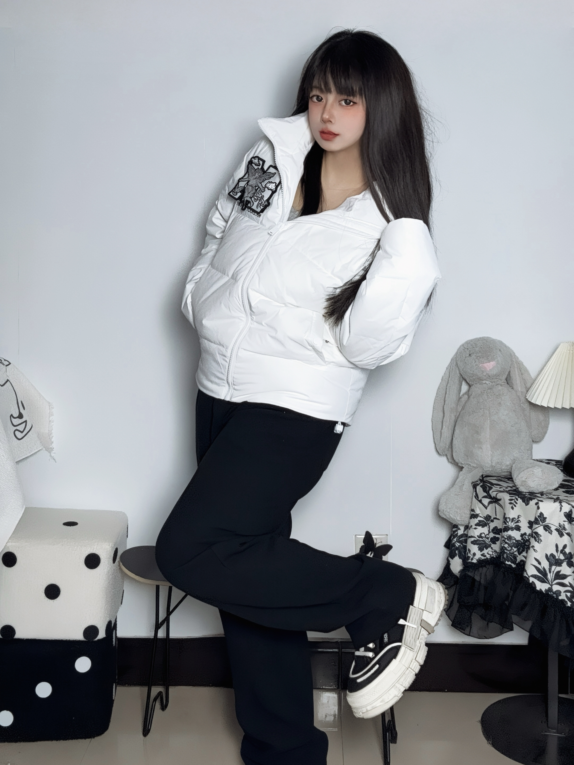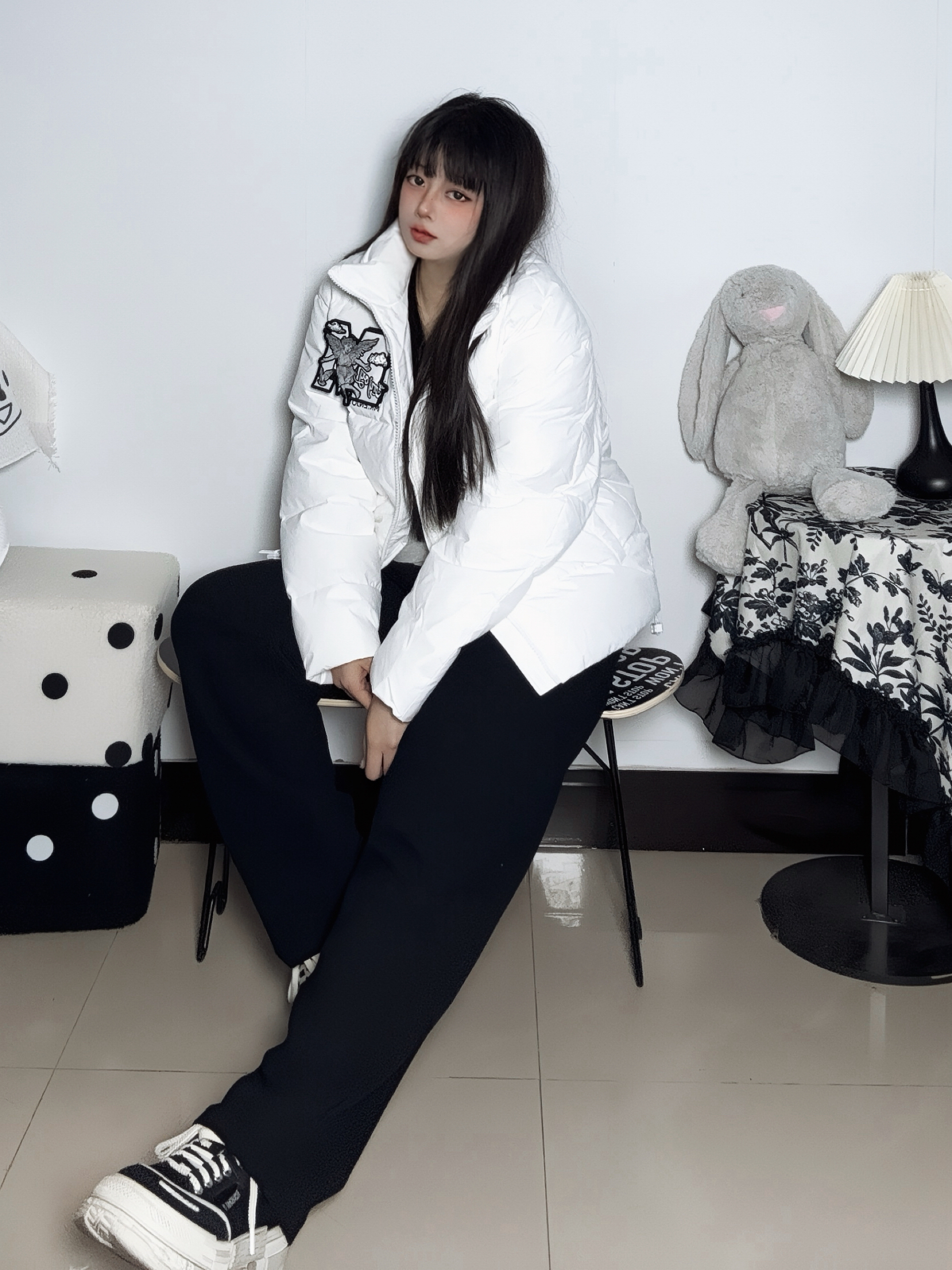 是我喜欢的设计感棉服 附赠的一大包刺绣M标 可以自己贴换 颜色都是不同的哦更方便穿搭 暖和软乎乎的北方冬天也不怕 - 搭配了一条很修饰腿型的线圈裤 软软的单穿就可以很暖和 抽绳的设计也更方便啦~ ▪️ 参考尺码:168cm60kg M