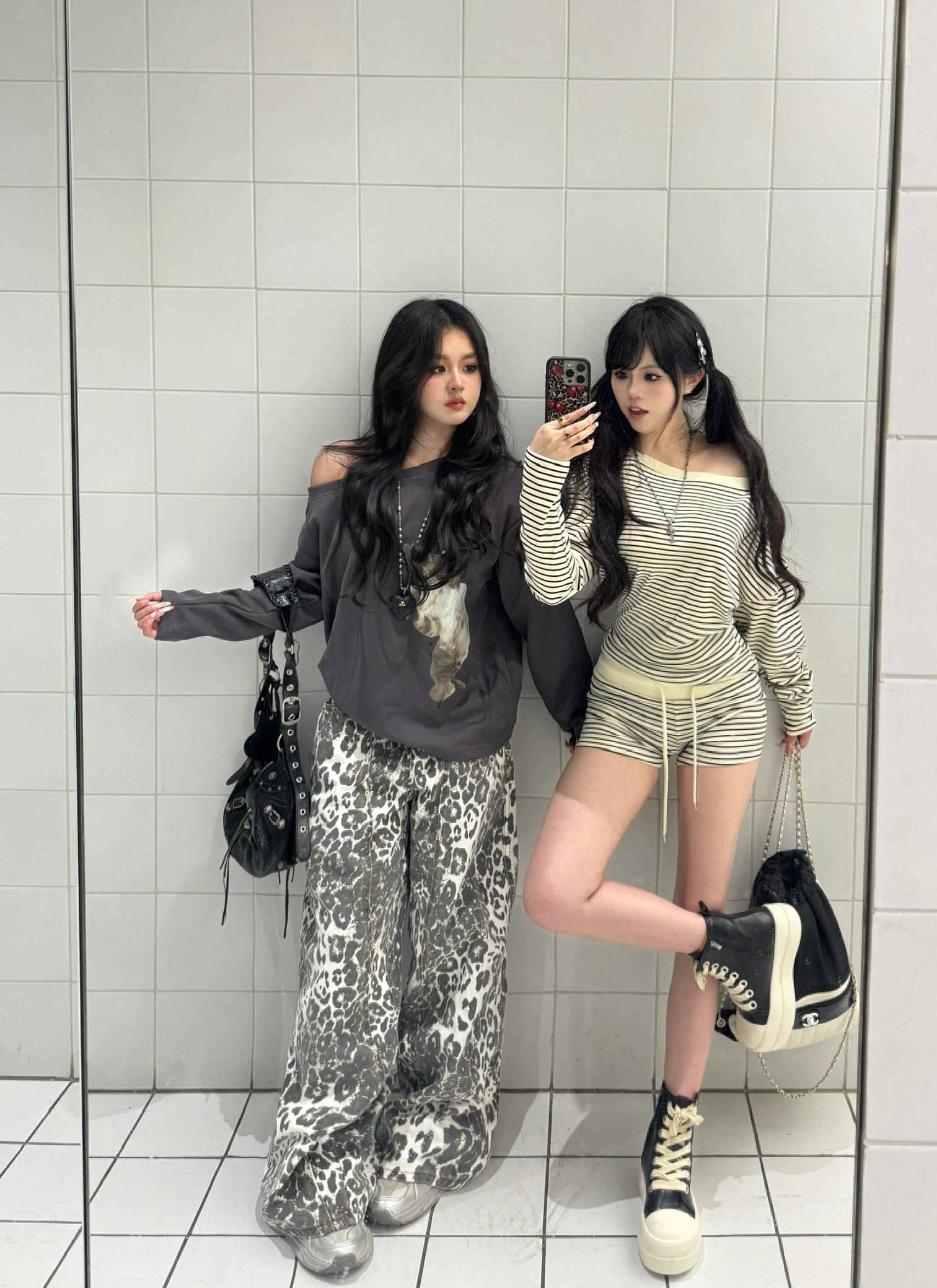 这两套穿搭的核心公式很简单,属于“舒适+小心机”的懒人模板: 公式1(左):松弛感混搭 大件+个性下装+亮点鞋 • 大件:宽松露肩卫衣(遮肉+露肤小性感) • 下装:豹纹阔腿裤(用个性图案中和上衣的素) • 鞋:金属感/亮色鞋(小面积亮点提升精致度) 公式2(右):懒人套装省心款 同元素套装+厚底鞋 • 套装:条纹露肩两件套(统一元素不用想搭配,露肩设计增加轻盈感) • 鞋:厚底...