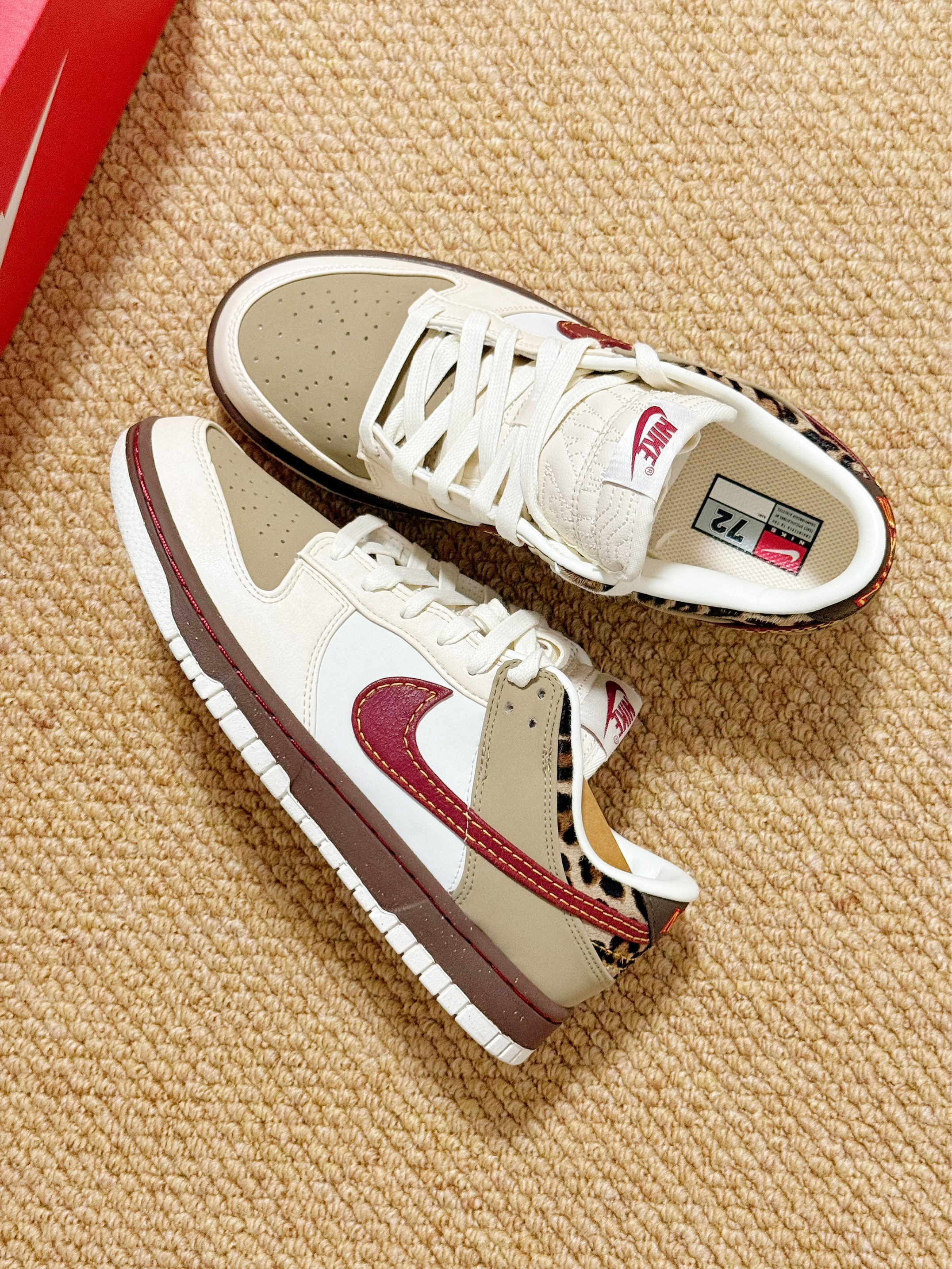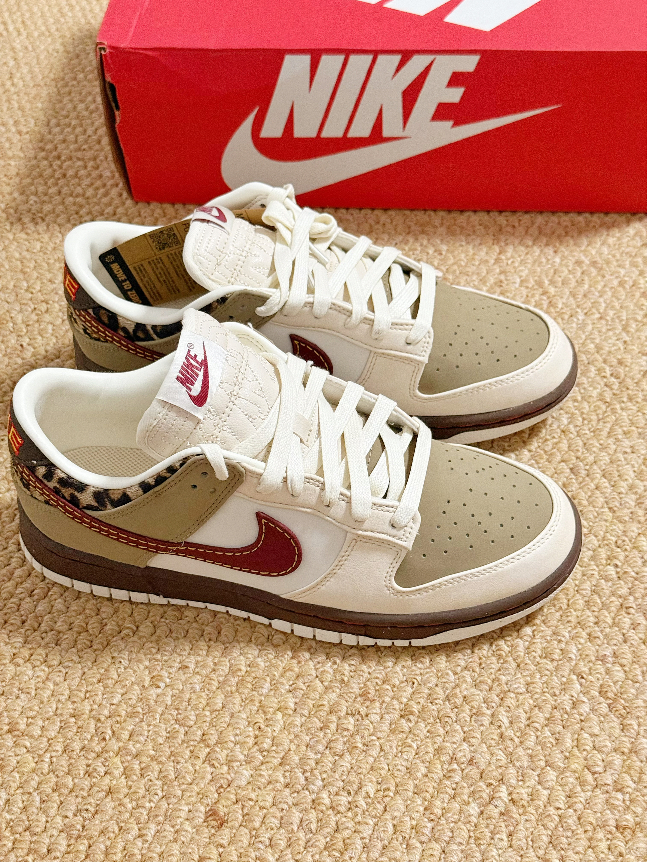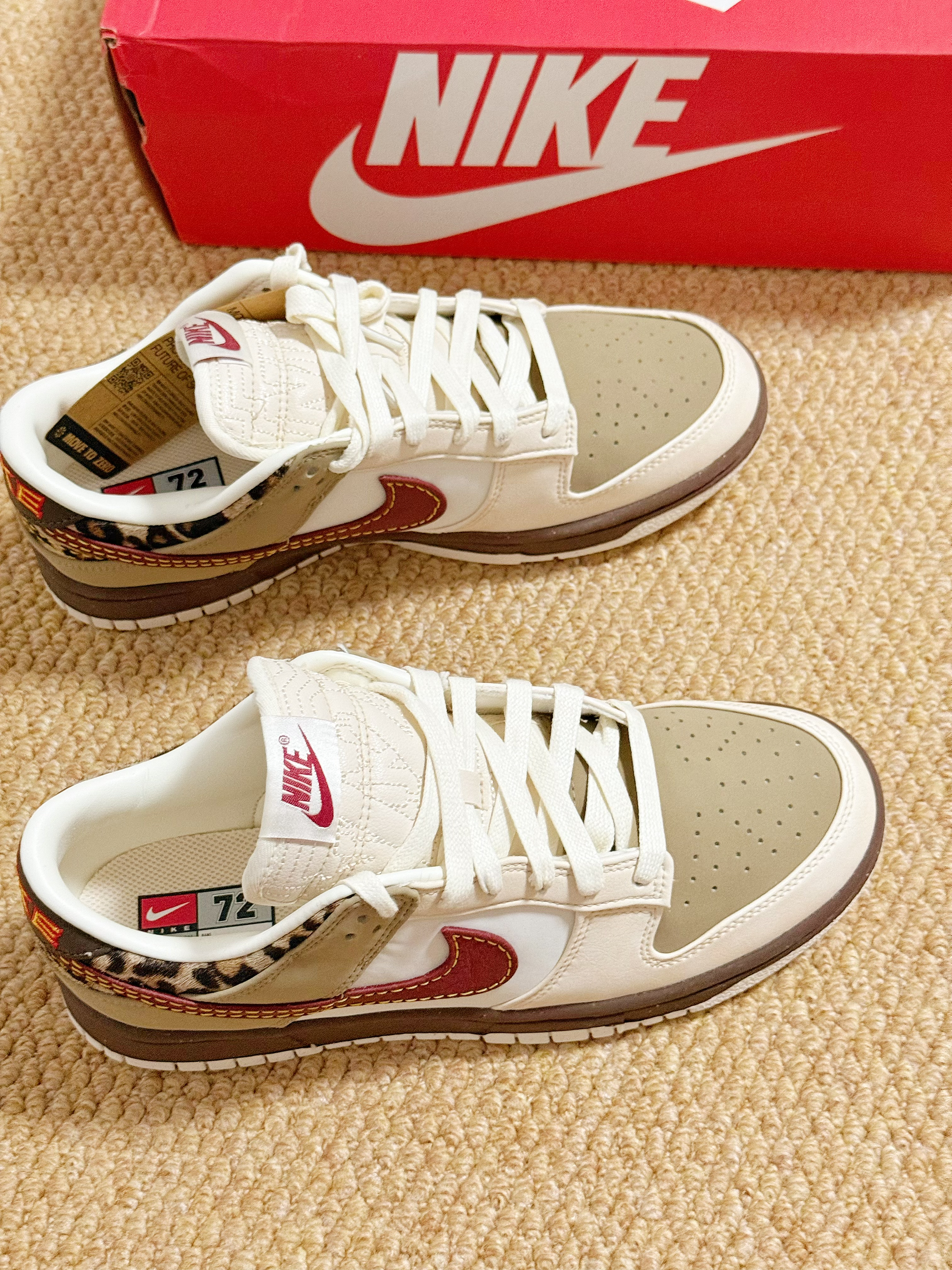 🍂 今年 终于迎来了自己的第一双Dunk 这双Dunk后跟的豹纹图案应该算是整双鞋子的亮点啦~ 棕红色的配色➕侧标的棕色Swoosh 色彩搭配还是挺和谐的 低帮的版型在秋冬季节穿着也是可以的~ 尺码方面呢是比较合适的 但是最大尺码只有42的 大尺码的人这次是选择不了啦💔 你们觉得这双豹纹Dunk更适合搭配牛仔裤还是运动裤?评论区聊聊你的穿搭灵感~