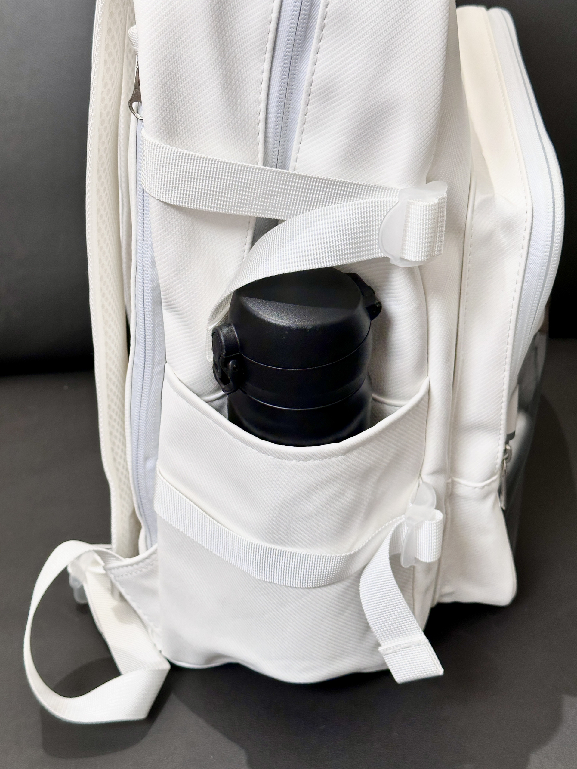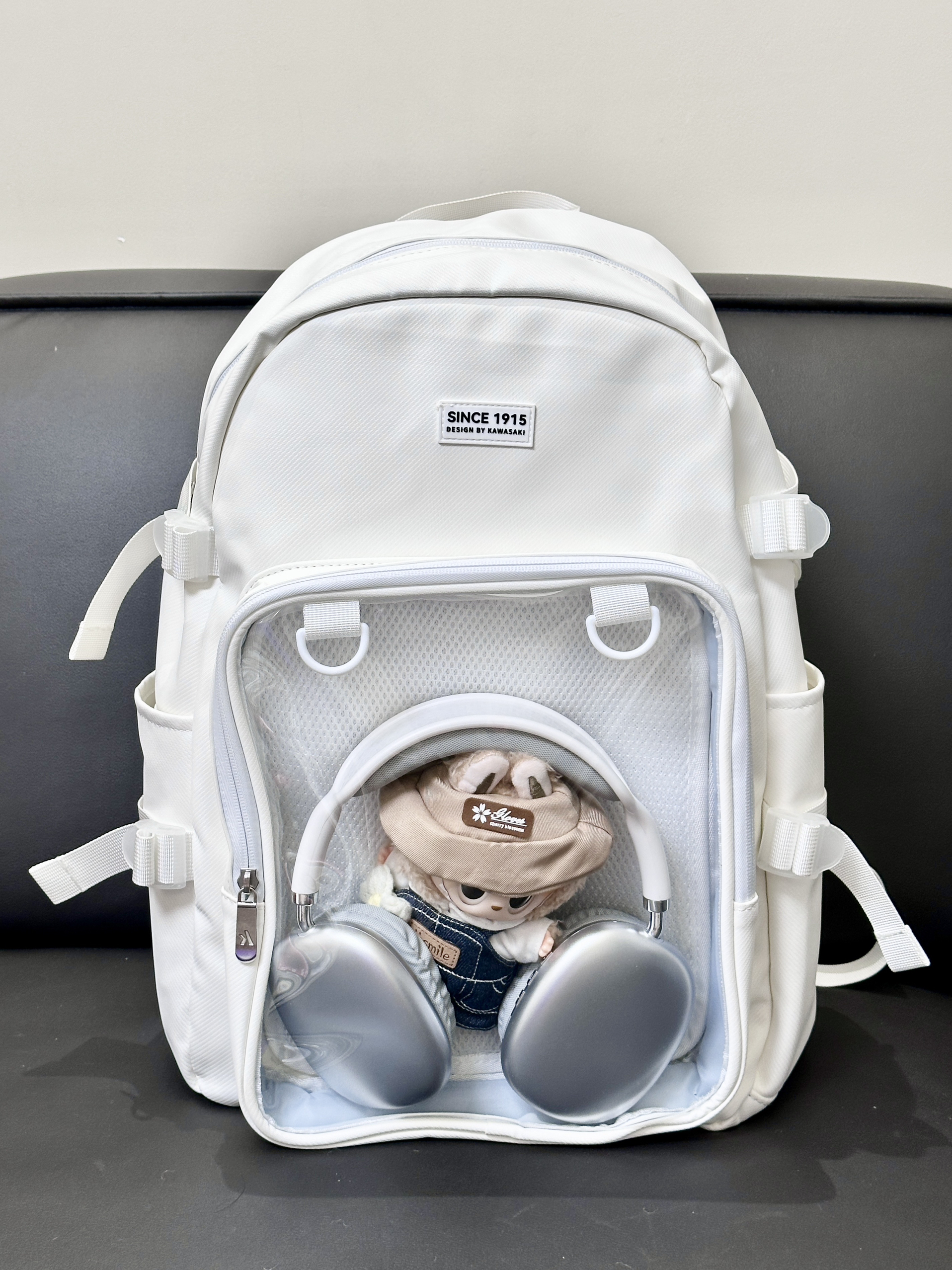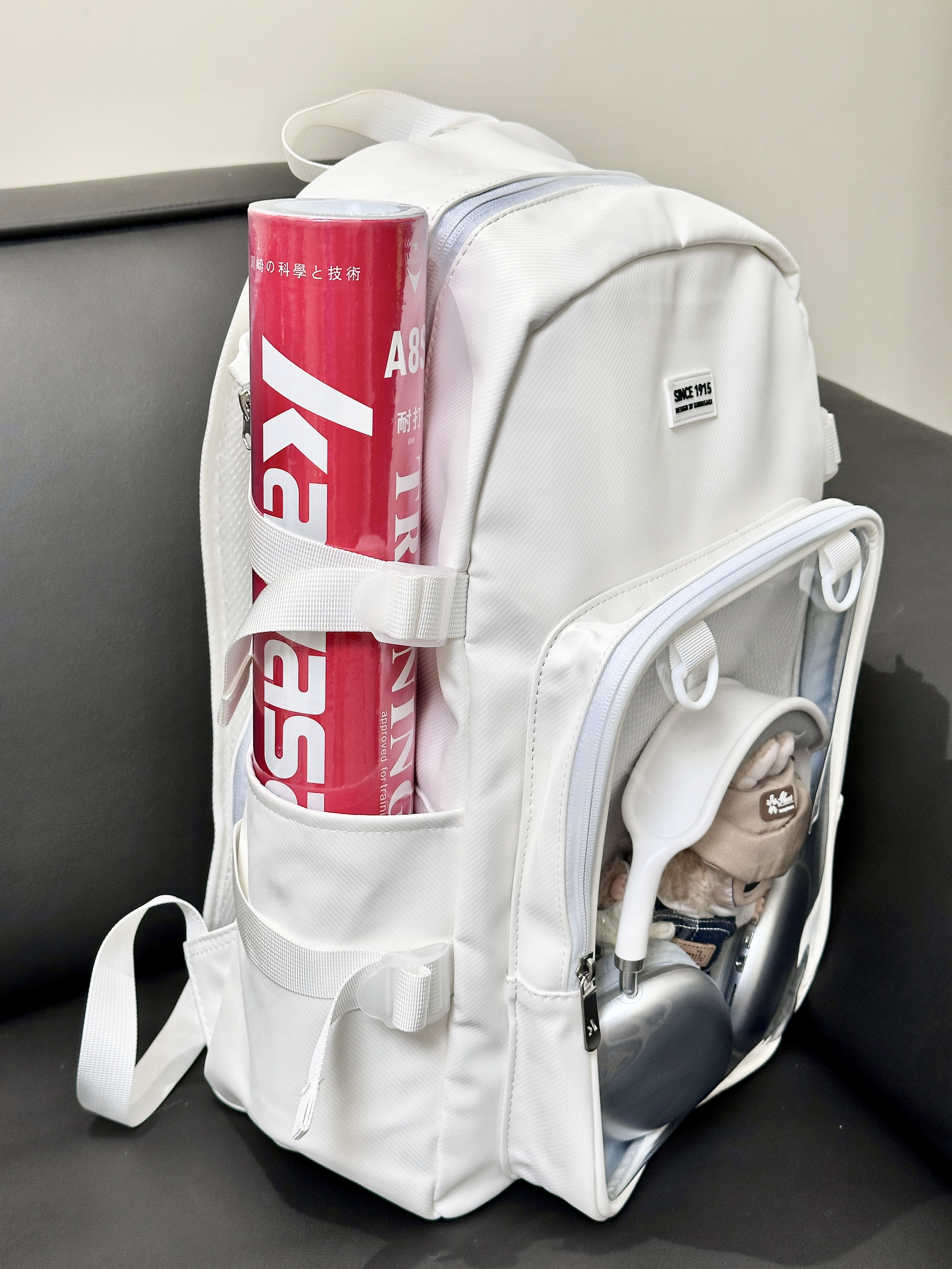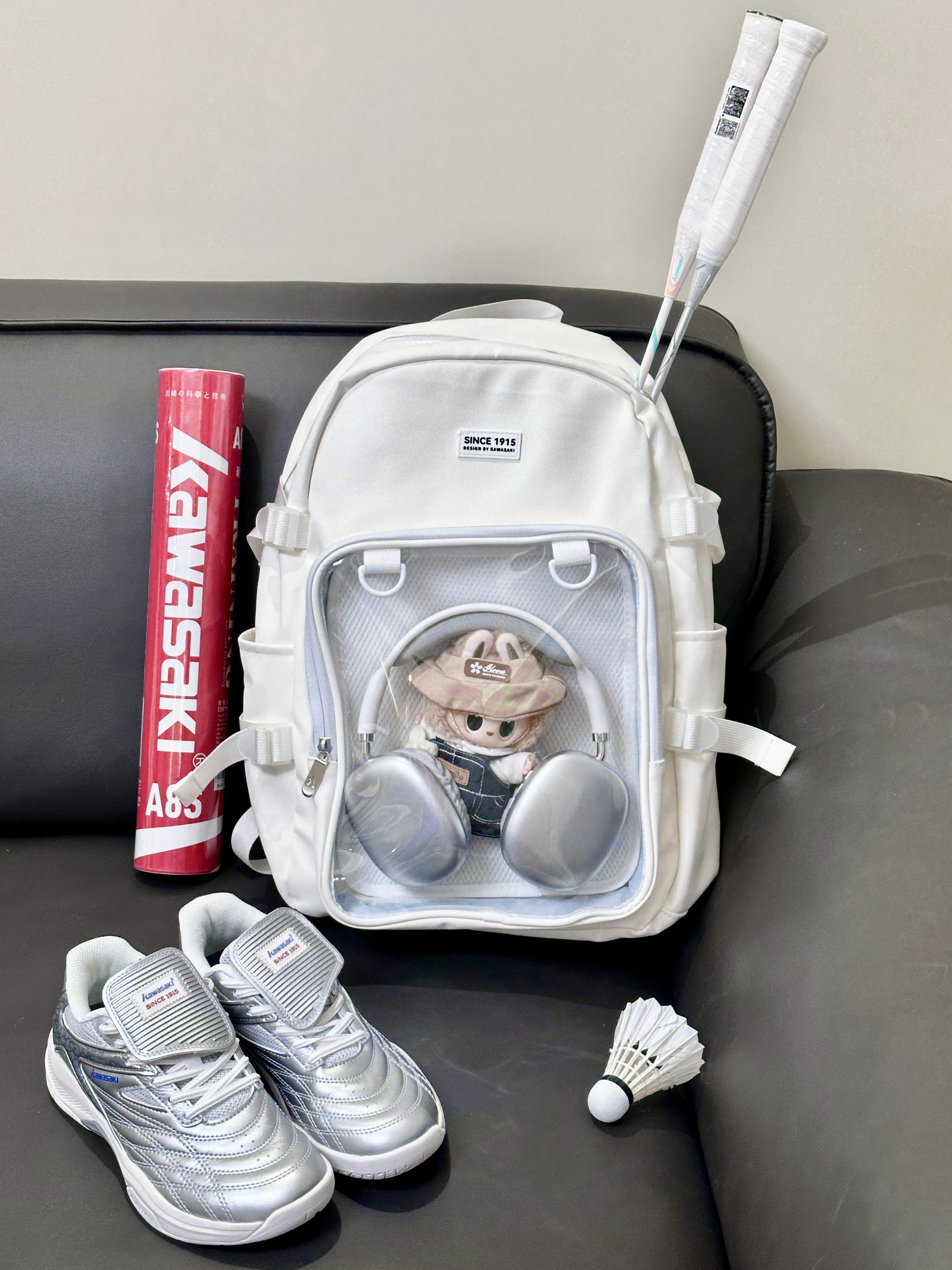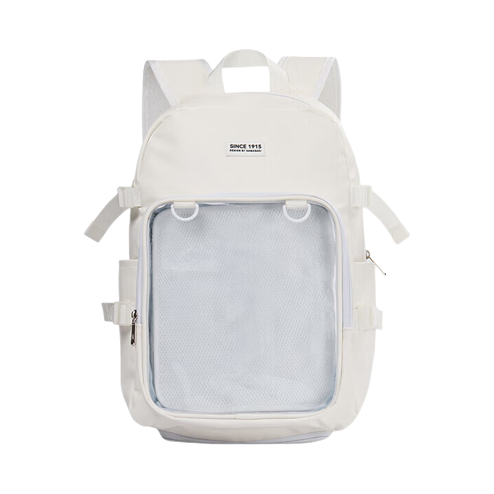 就素介个川崎家的奶白双肩包 背面有个大大的透明层 里边儿可以放谷子和喜欢的ip 玩偶 内里收纳空间挺大的 日常通勤放些书本水杯这些也完全没问题 自带一个羽毛球拍收纳层 有魔术贴固定🏸不怕摩擦羽毛球拍啦 还有独立鞋仓,在球场换鞋挺方便的 好看又实用的一只包