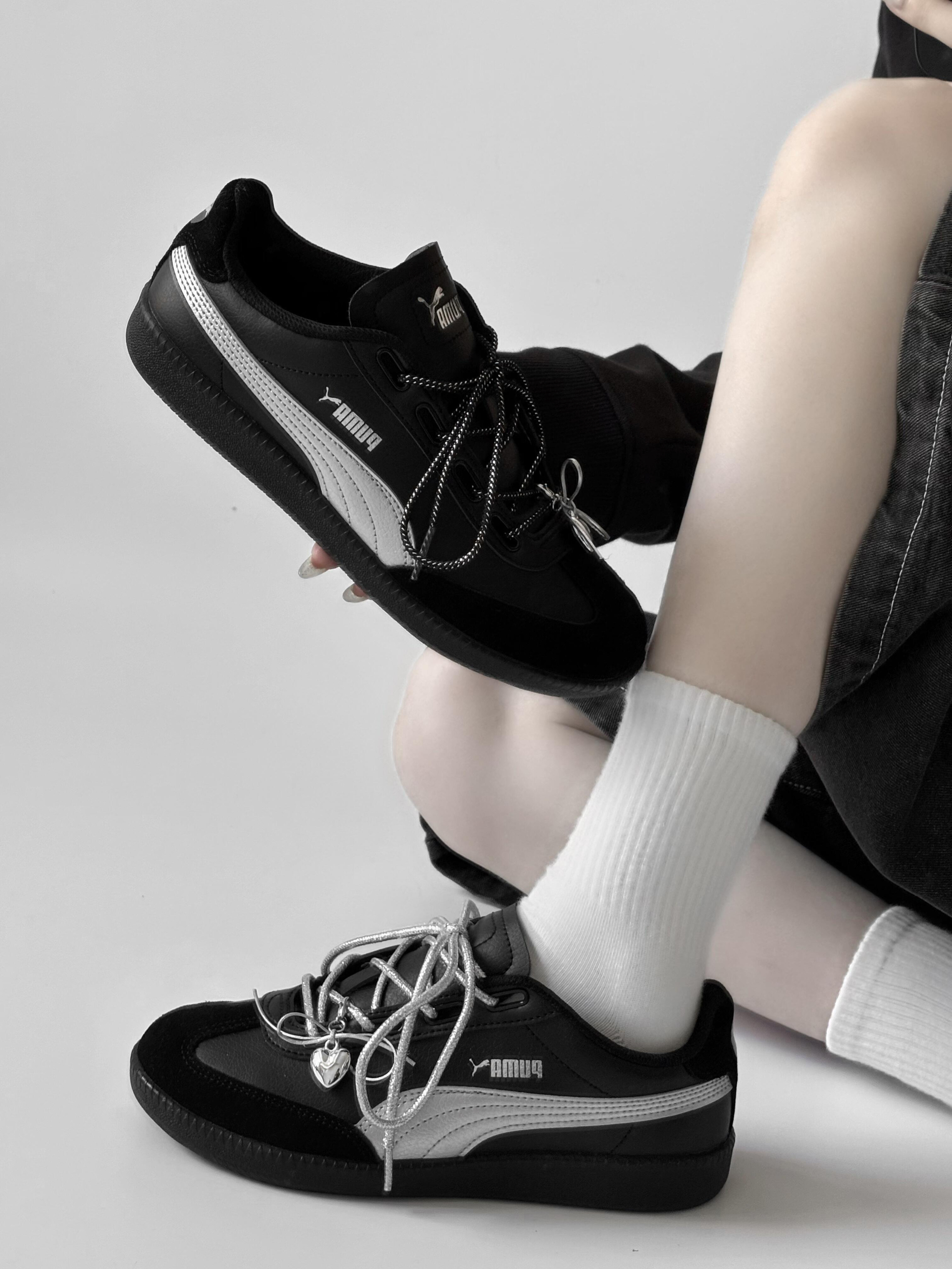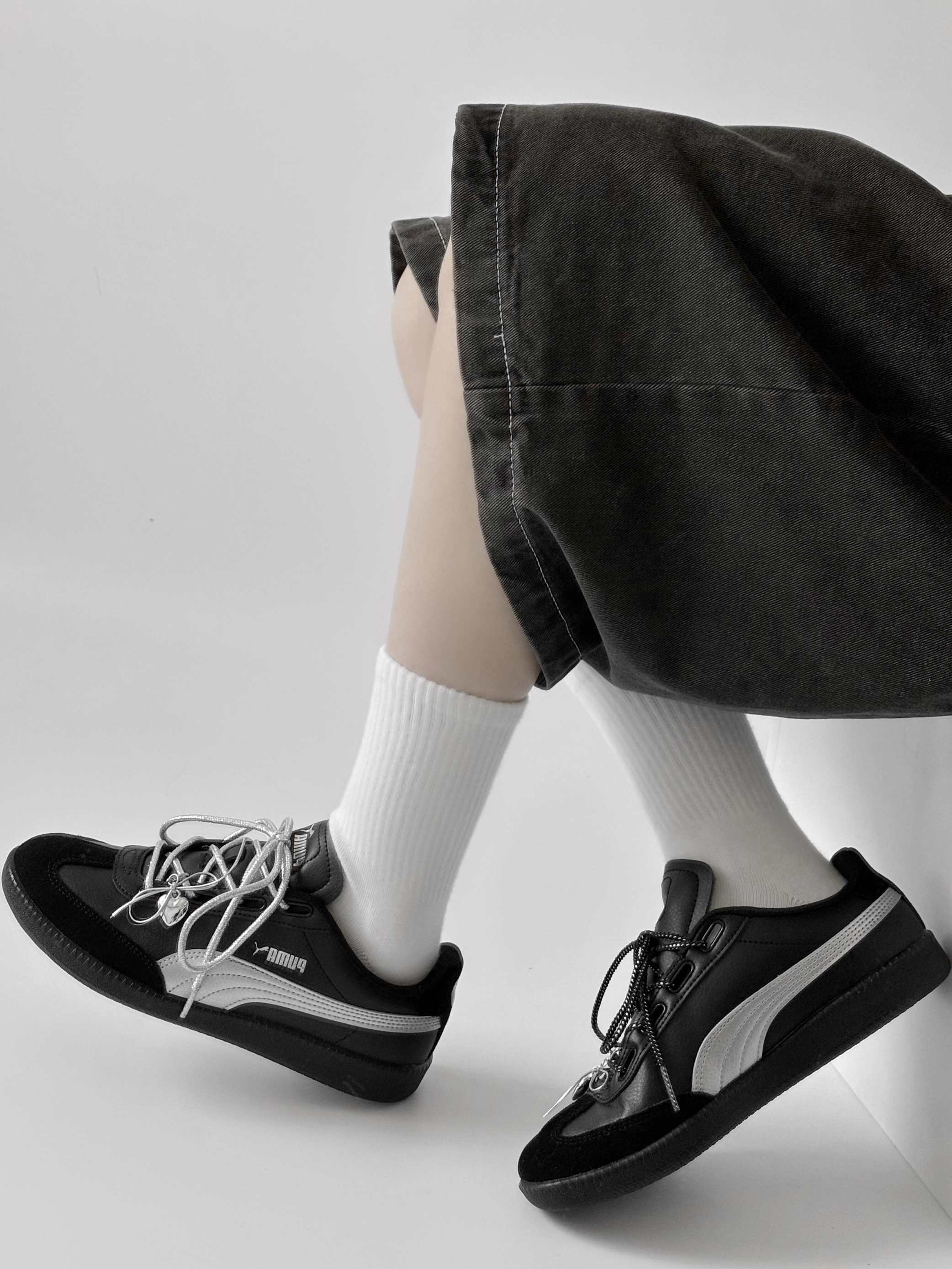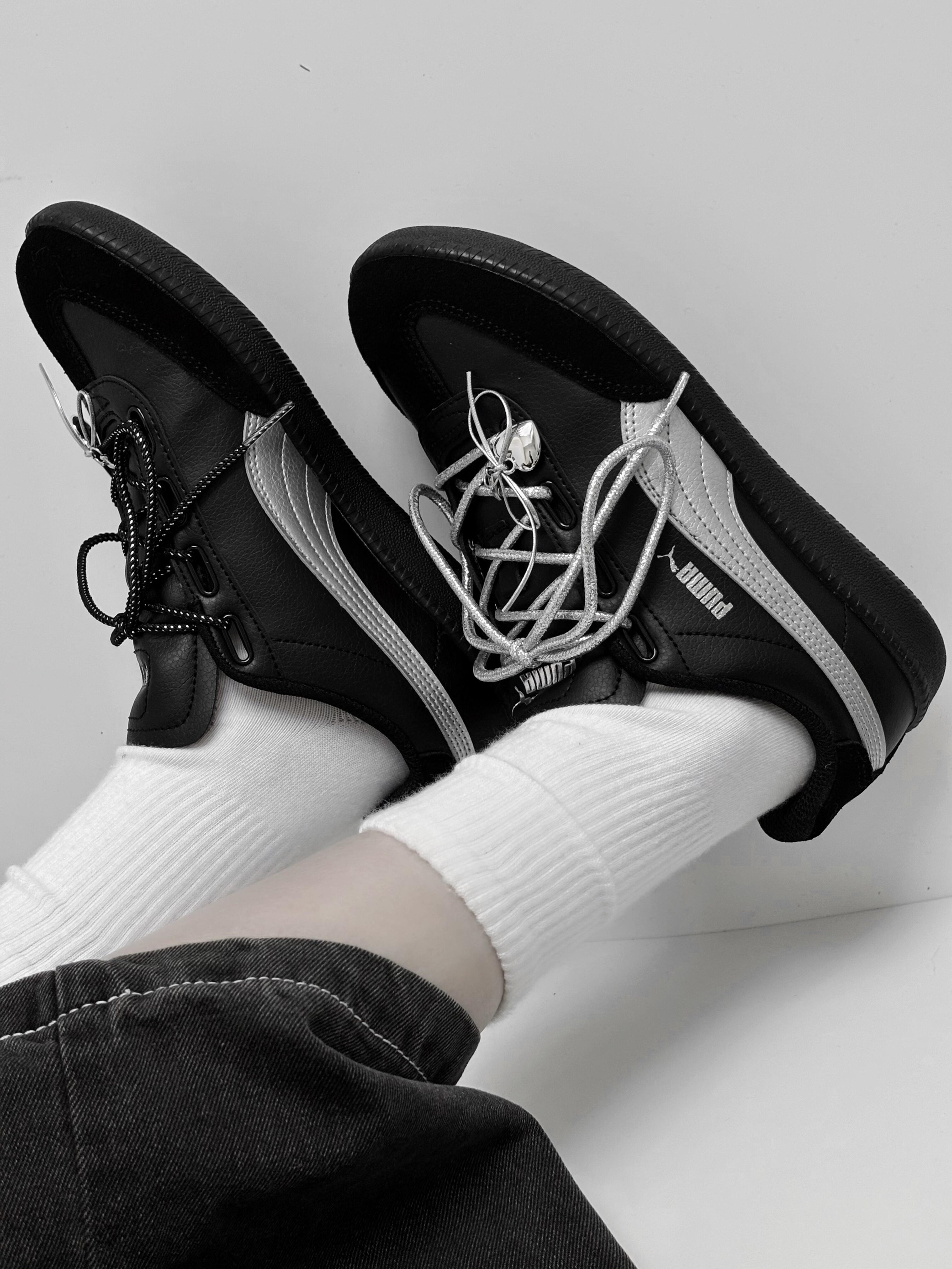 谁懂啊!拆这双鞋时我盯着这“带金属扣的鞋带”发呆——这到底是系还是不系?结果随便挽了两下出门,等咖啡的功夫被邻座的酷姐拍腿问:“你这鞋的‘叛逆鞋带’哪搞的?” 这双PUMA的黑银配色真的是把“低调拽感”焊在脚上:麂皮+亮面革的拼接像把“暗夜反光条”缝在了鞋身,走夜路时银标还会隐隐发亮,社恐星人想低调但脚先火了。最绝的是那个“反人类鞋带”——本来想换根普通鞋带,结果搭工装裙时,金属扣卡在裤缝边居然...