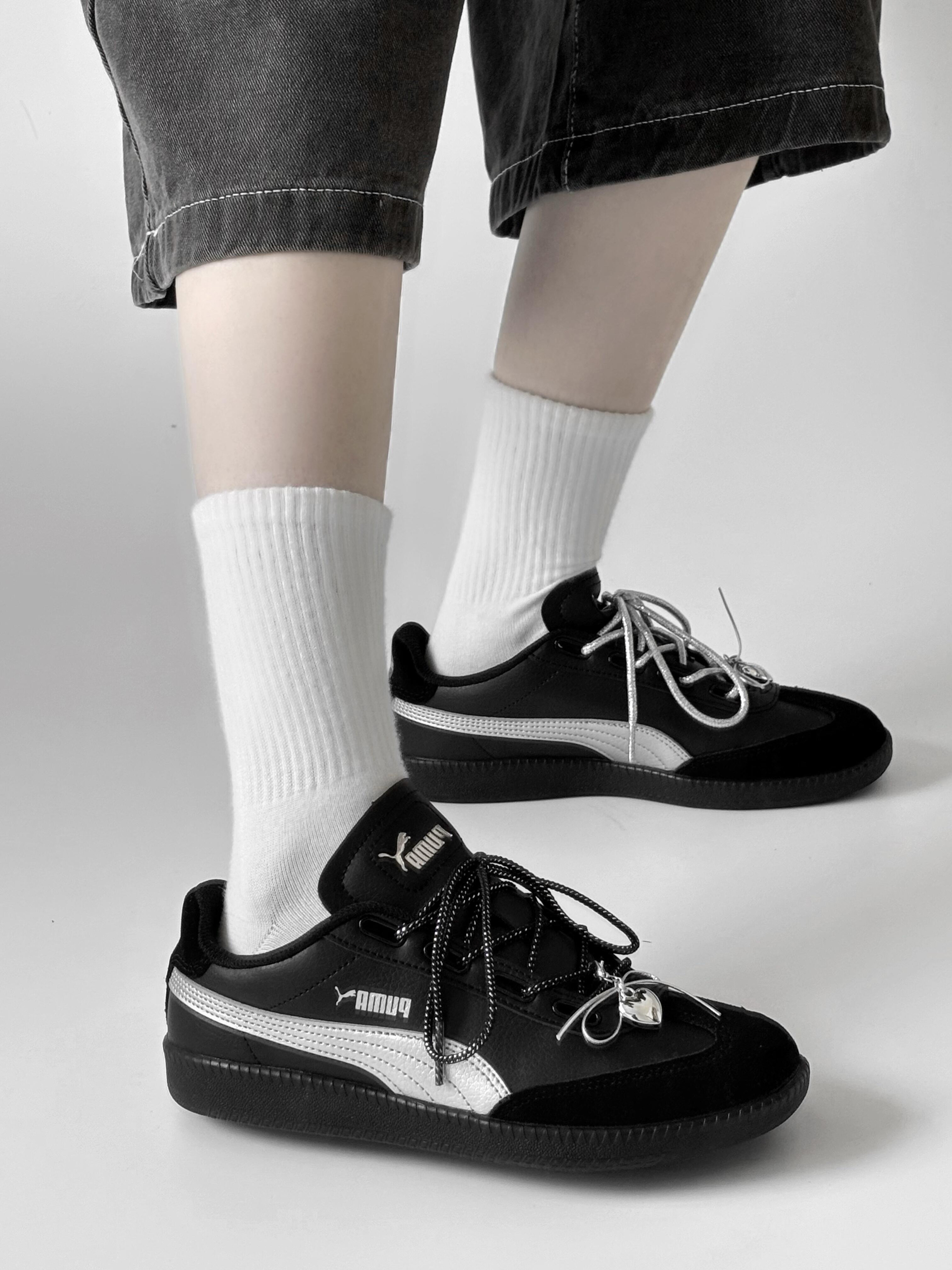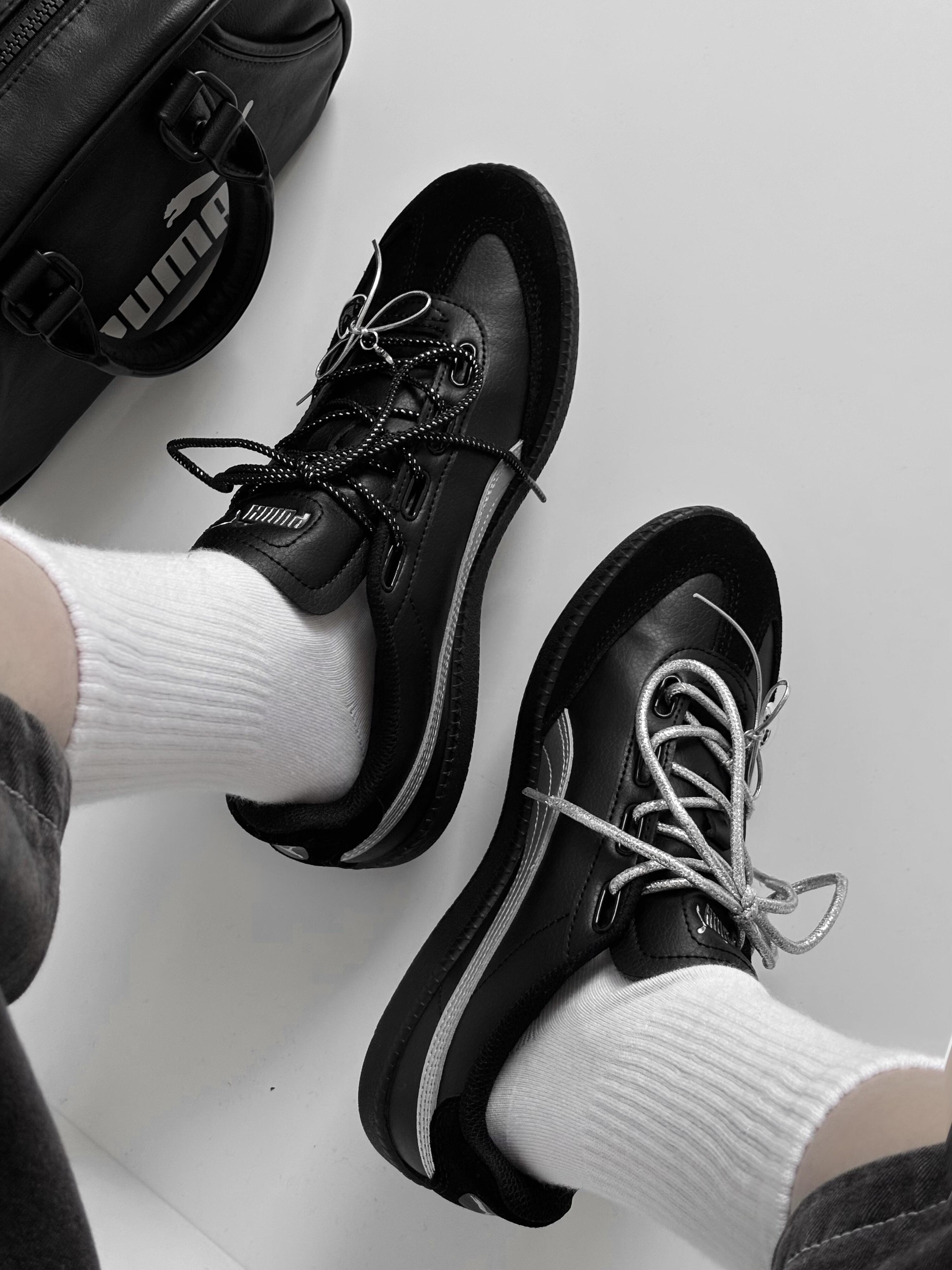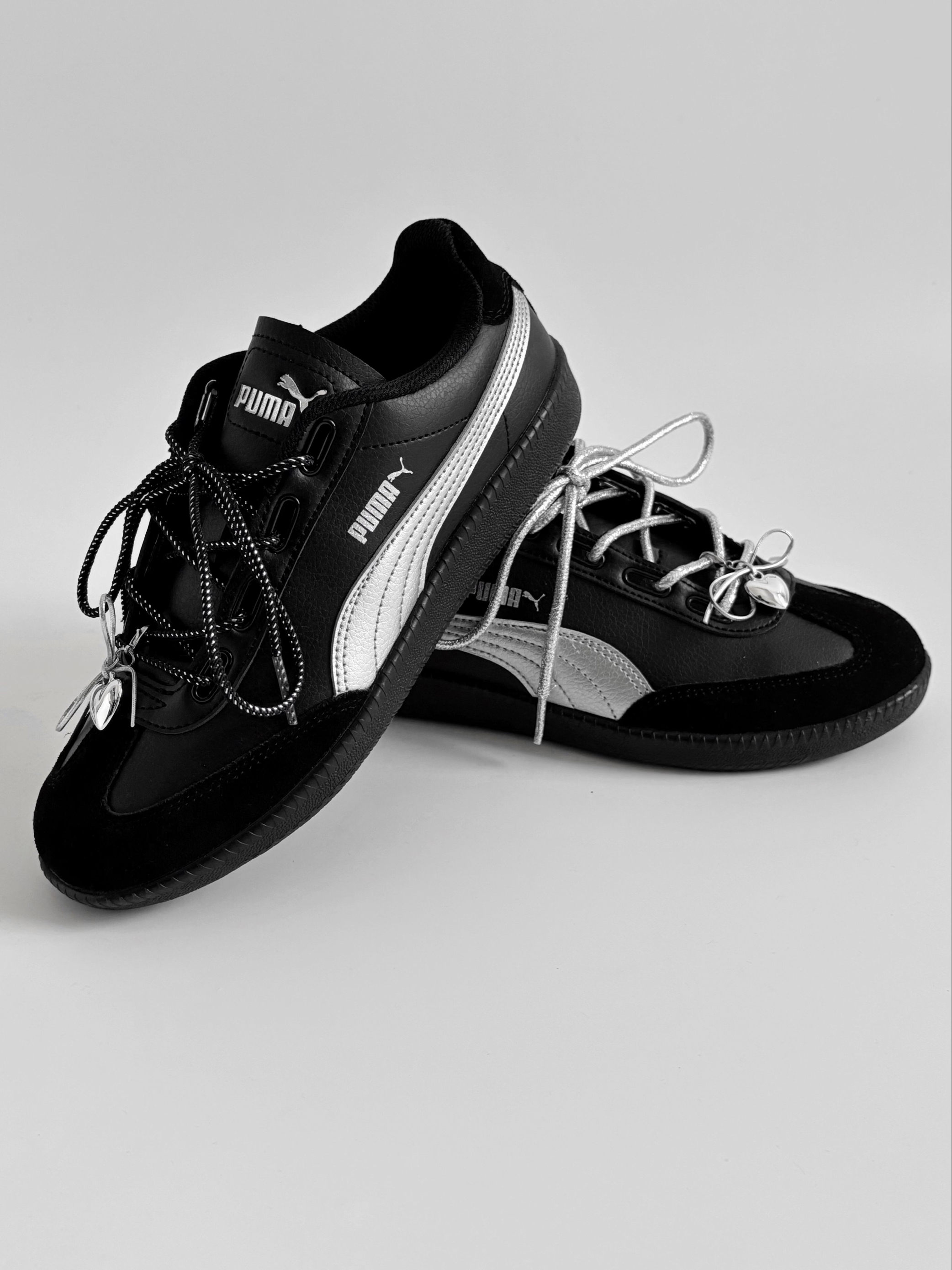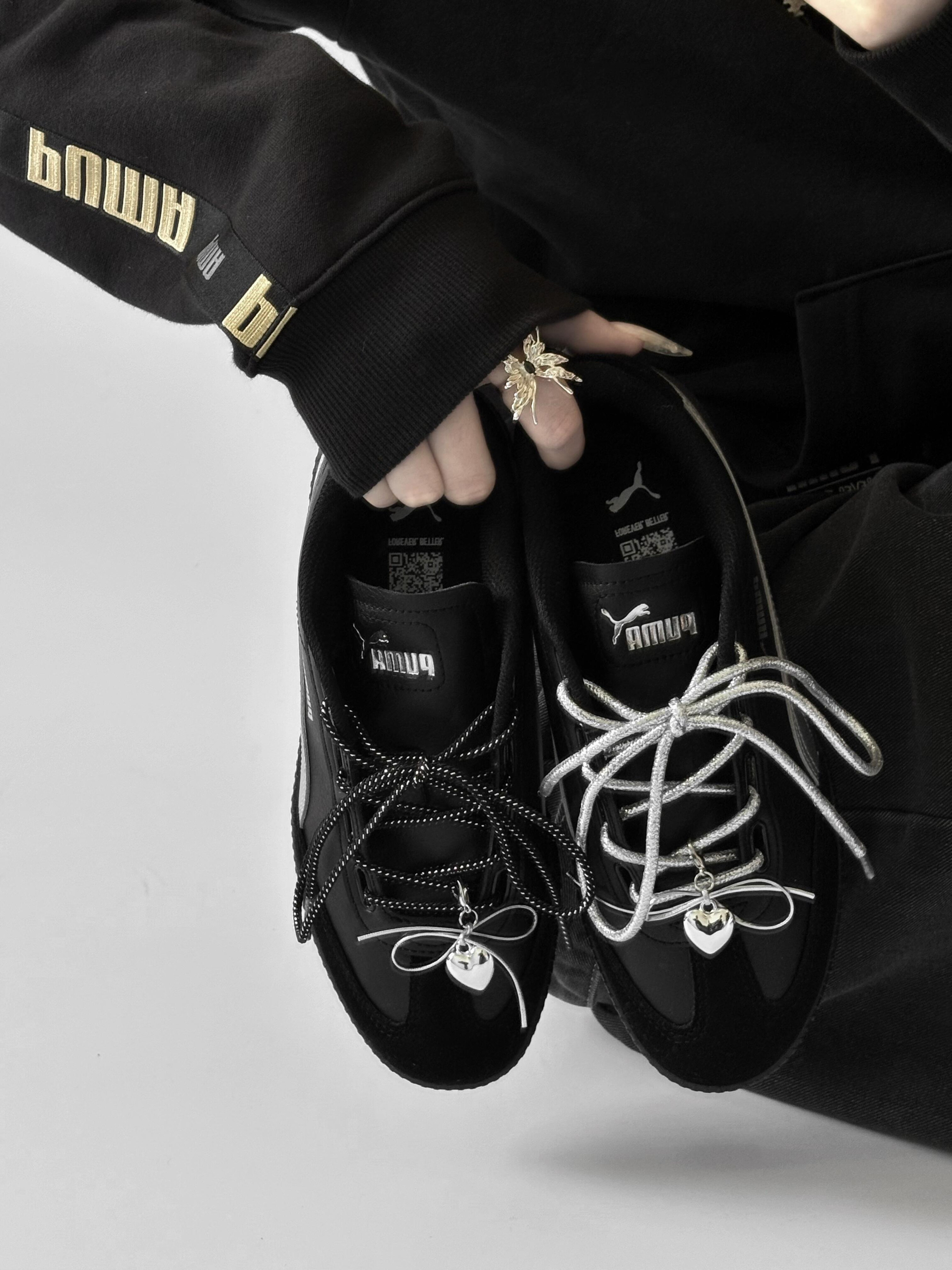 谁懂啊!拆这双鞋时我盯着这“带金属扣的鞋带”发呆——这到底是系还是不系?结果随便挽了两下出门,等咖啡的功夫被邻座的酷姐拍腿问:“你这鞋的‘叛逆鞋带’哪搞的?” 这双PUMA的黑银配色真的是把“低调拽感”焊在脚上:麂皮+亮面革的拼接像把“暗夜反光条”缝在了鞋身,走夜路时银标还会隐隐发亮,社恐星人想低调但脚先火了。最绝的是那个“反人类鞋带”——本来想换根普通鞋带,结果搭工装裙时,金属扣卡在裤缝边居然...