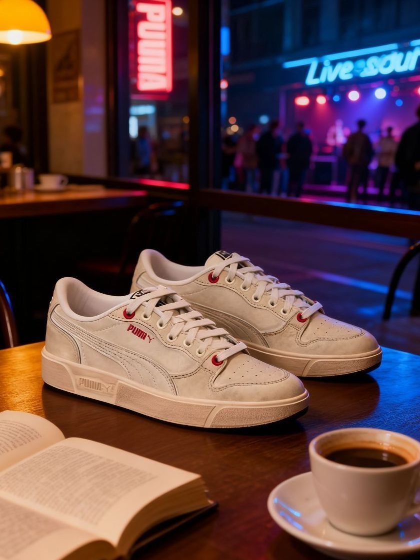 * **「复古做旧徽标」:** 经典的PUMA Formstrip跑道标与跃豹Logo,采用**褪色、毛边处理**,仿佛历经岁月洗礼,故事感拉满。
