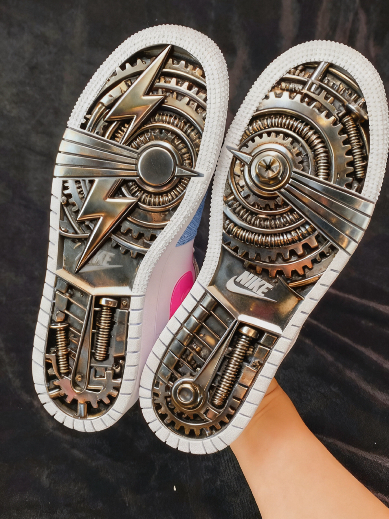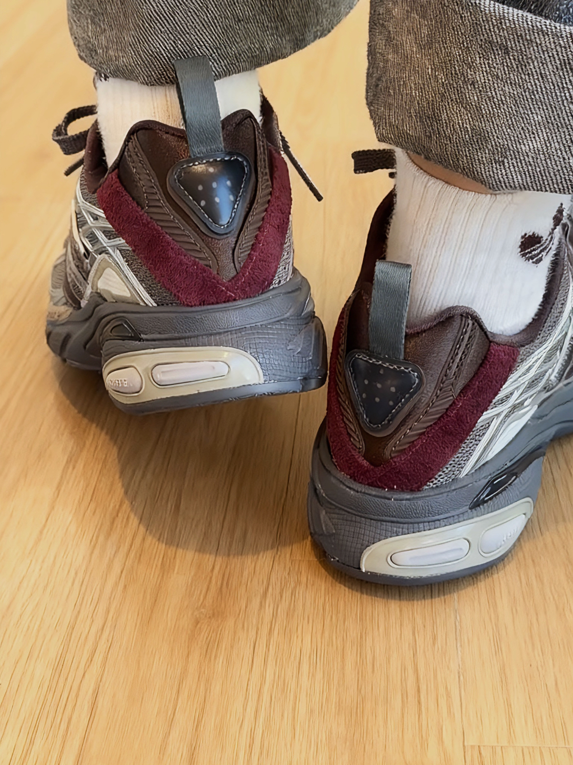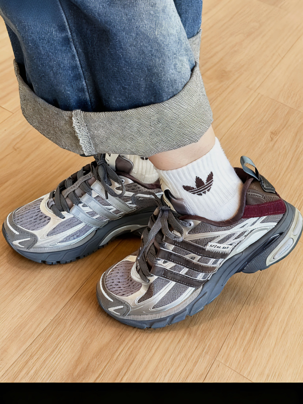 鞋子是金属银搭配红色~ 材质丰富既有绒面、麂皮、银色亮面… 既很复古又有未来感 脚感和 001 类似,是老爹鞋型 搭配牛仔裤和阔腿裤都没问题 通勤好物又多一双✌️