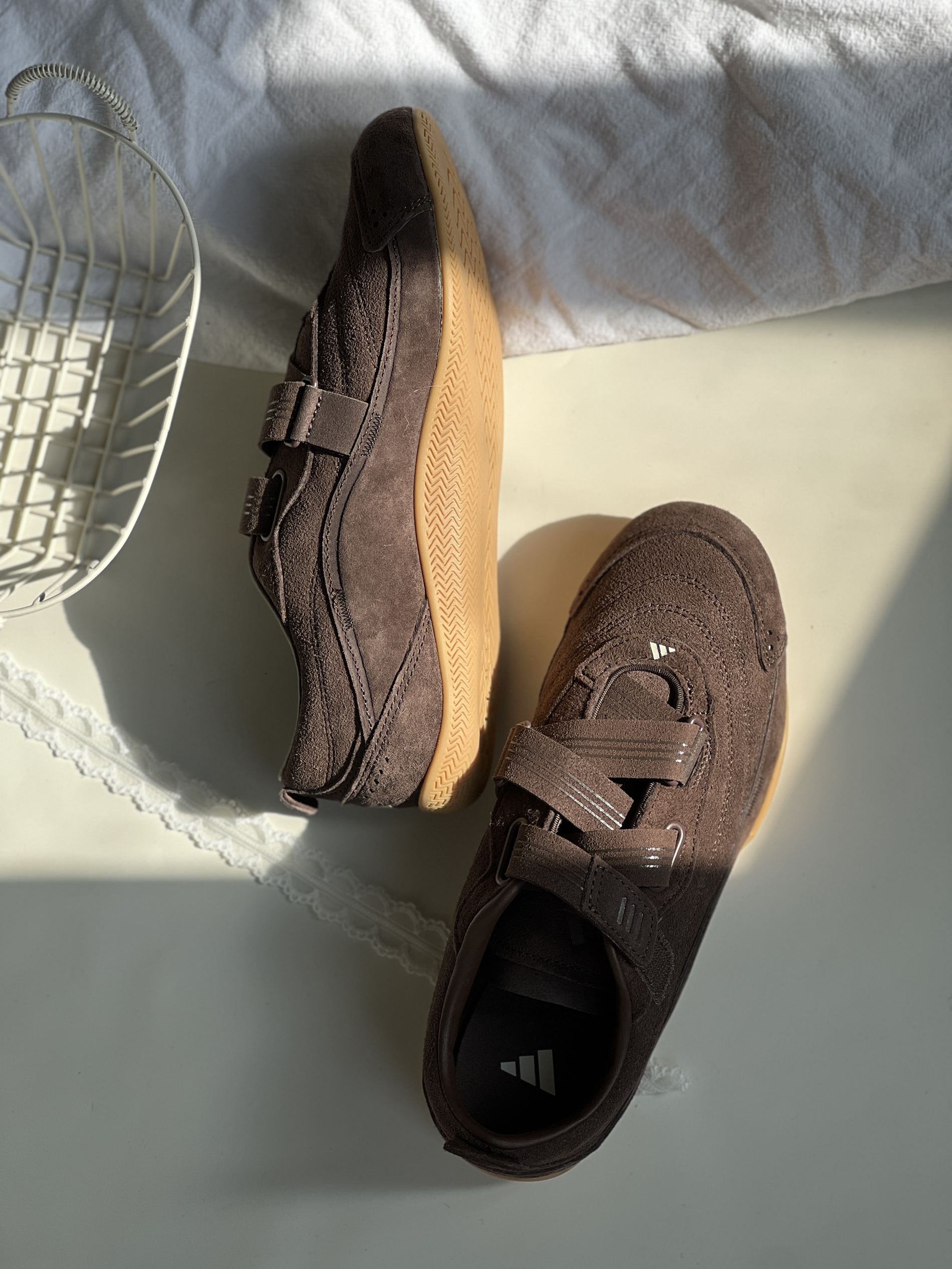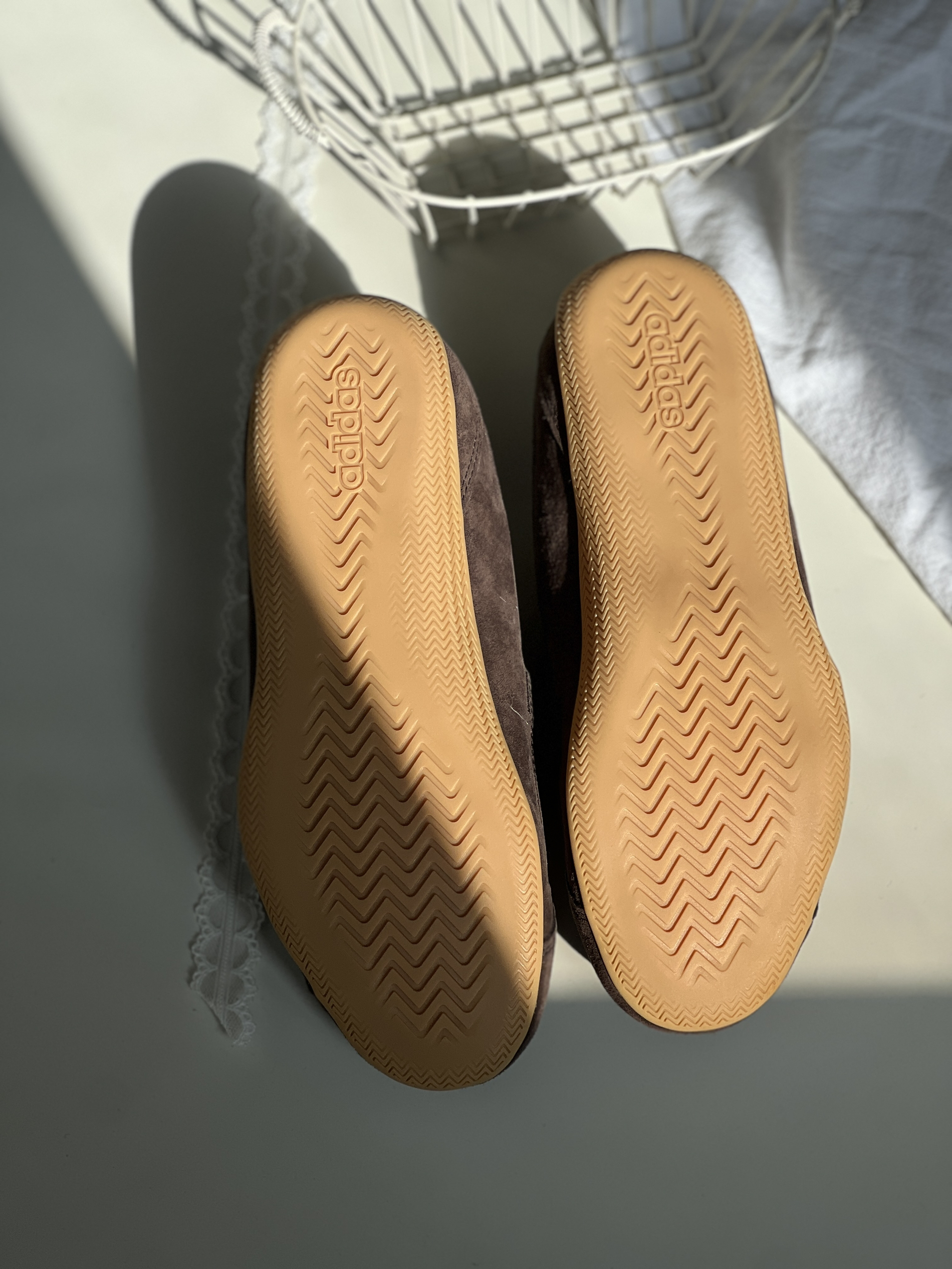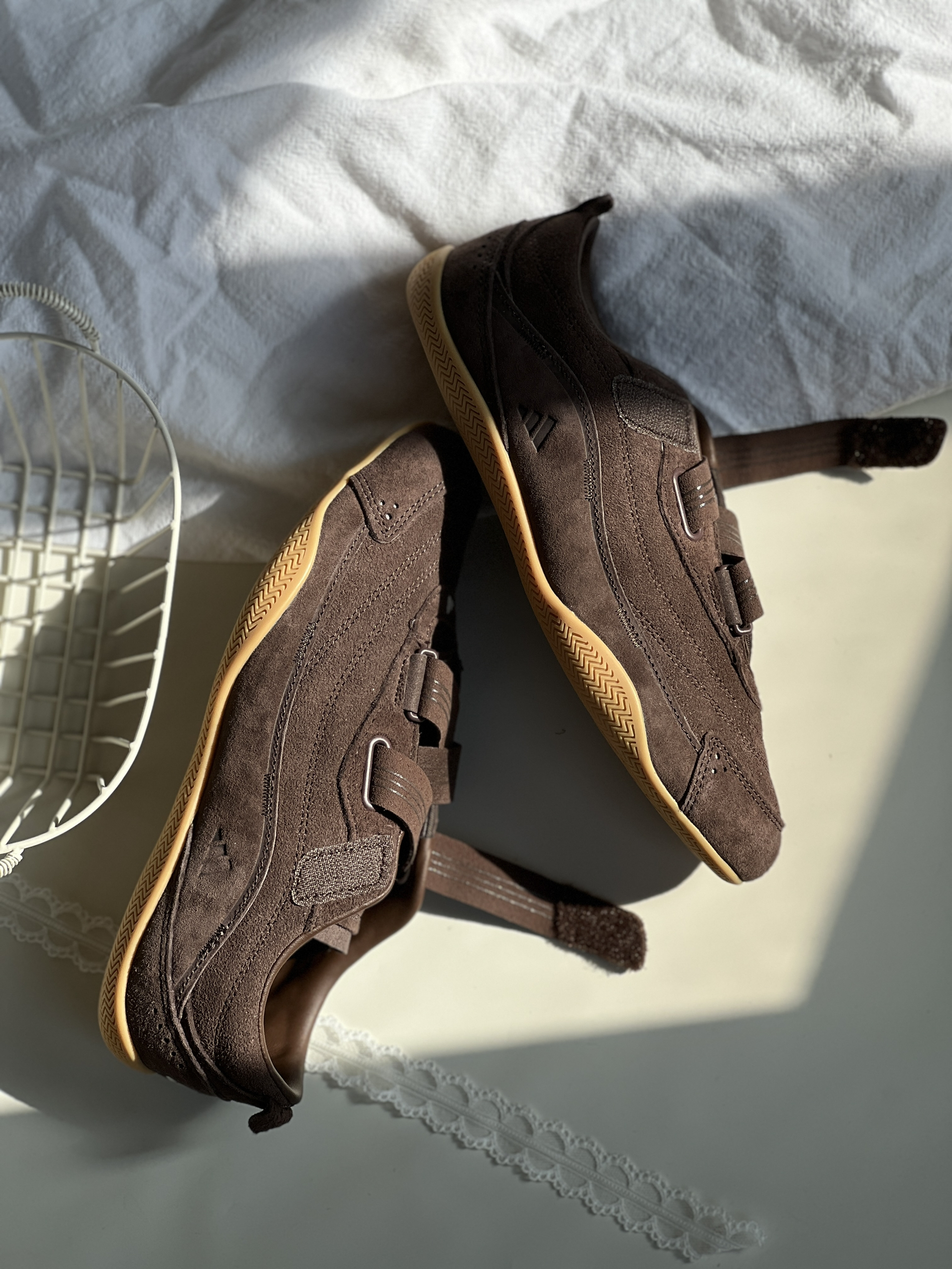 红棕色麂皮材质复古又高级, 绒面棕在阳光下泛着柔和的光, 鞋面细腻,质感高级, 穿上真的很提升整体穿着的品质感! 日常我爱搭配毛衣或风衣,再加上一条深蓝牛仔裤, 像把秋日的温柔踩在脚下。 🏷️舒适度有限:薄底设计在长时间行走或站立时,对脚部的缓冲不足,可能会产生疲劳感。