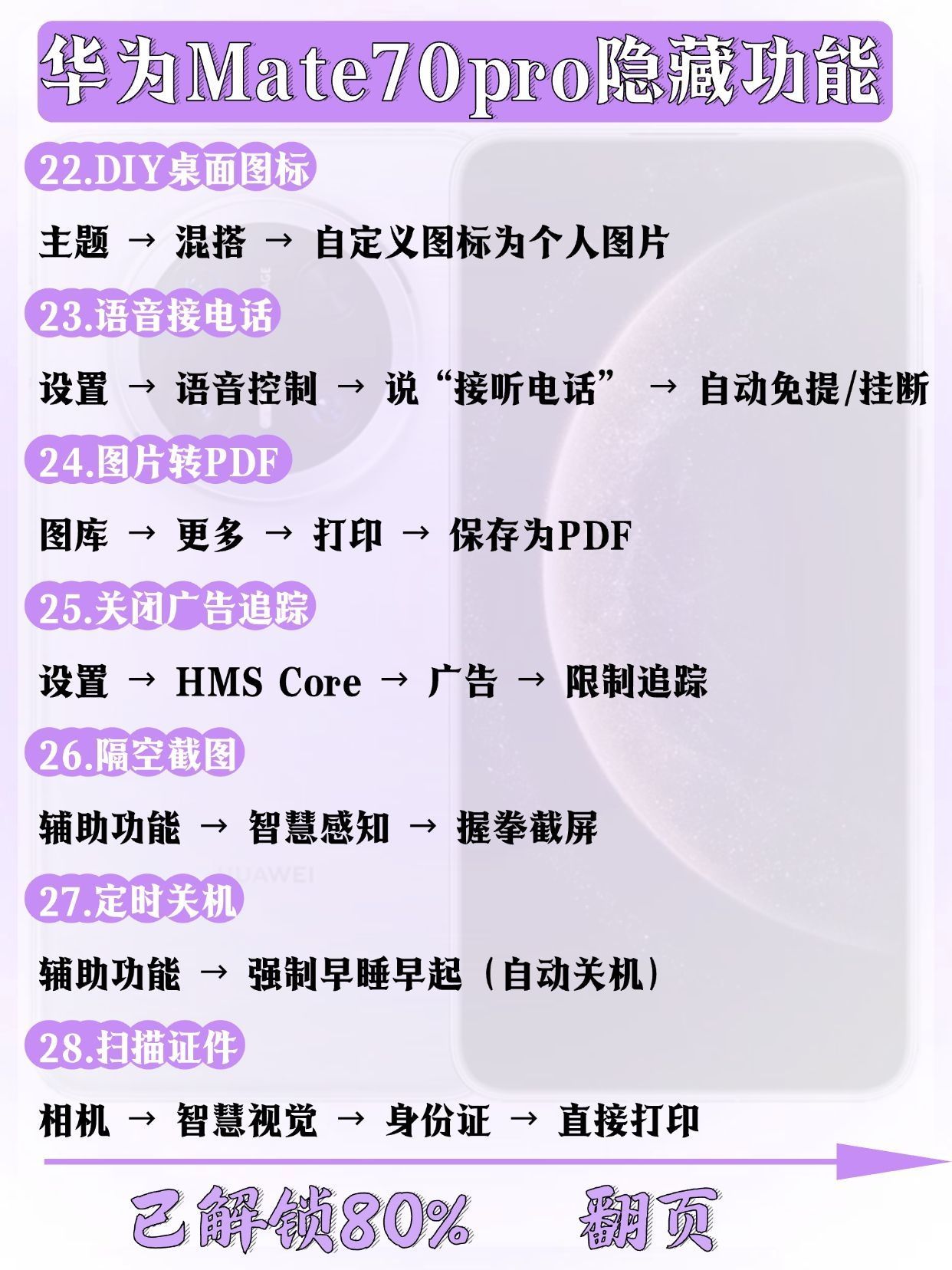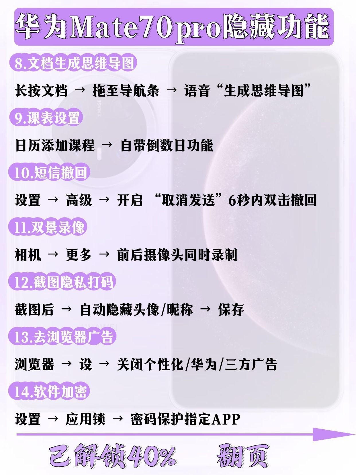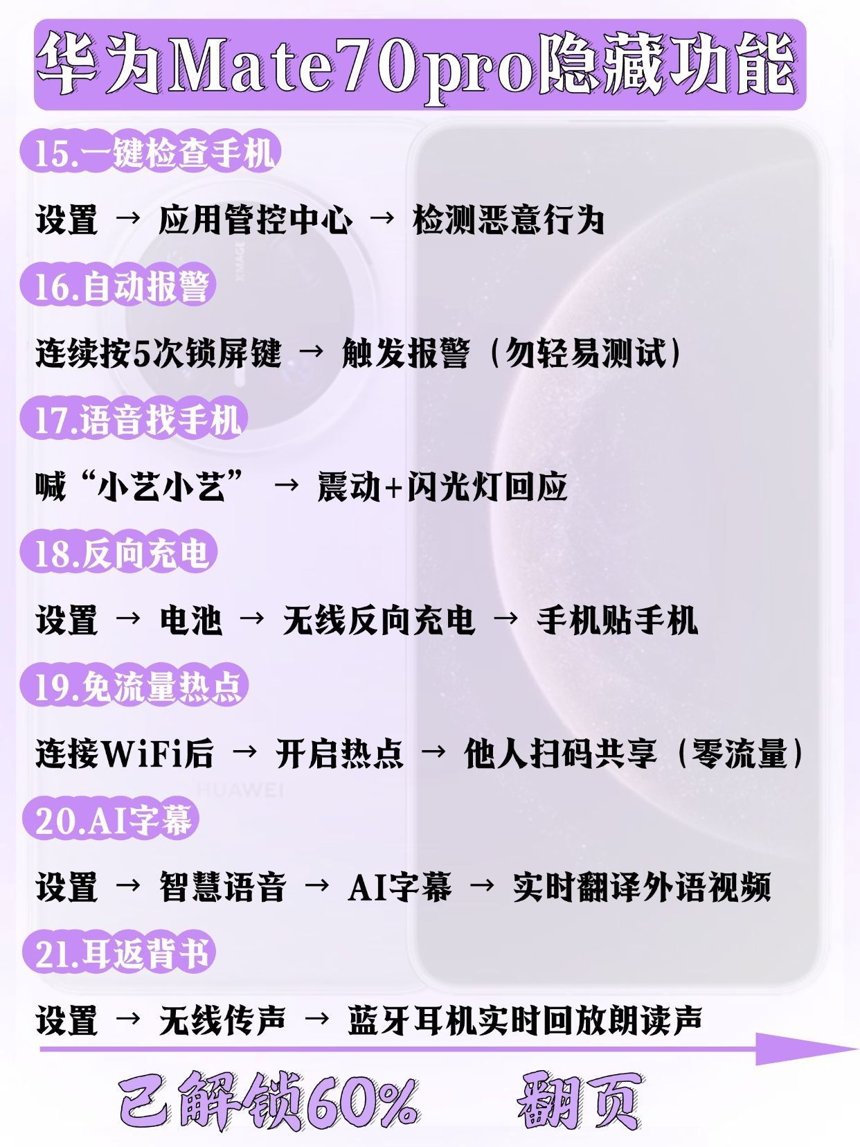 华为Mate70pro隐藏功能,你用多久才知道? 华为Mate70pro隐藏功能,你用多久才知道? 99%的人都不知道,华为 Mate 70 Pro 暗藏着35个超绝隐藏功能! 还有哪些功能是你用了很久才知道的? 快来一起探索,解锁手机新玩法~