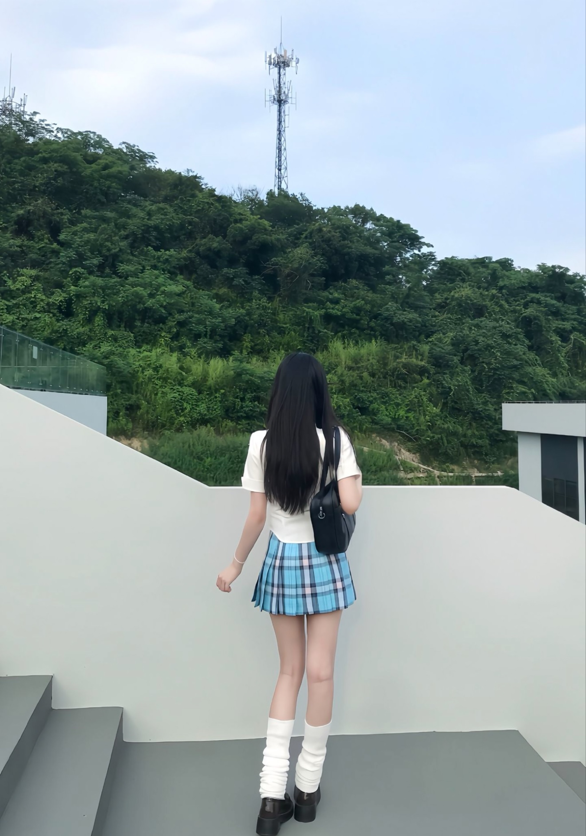 白色短袖衬衫搭配深蓝色领结 再加上粉蓝色百褶裙 满满的日系学院风 整体造型清新可爱 恨适合展现青春活力 再配一个包包 整体就很有范啦 ##分享你的日系穿搭#纯欲风#静默复古#潮流club