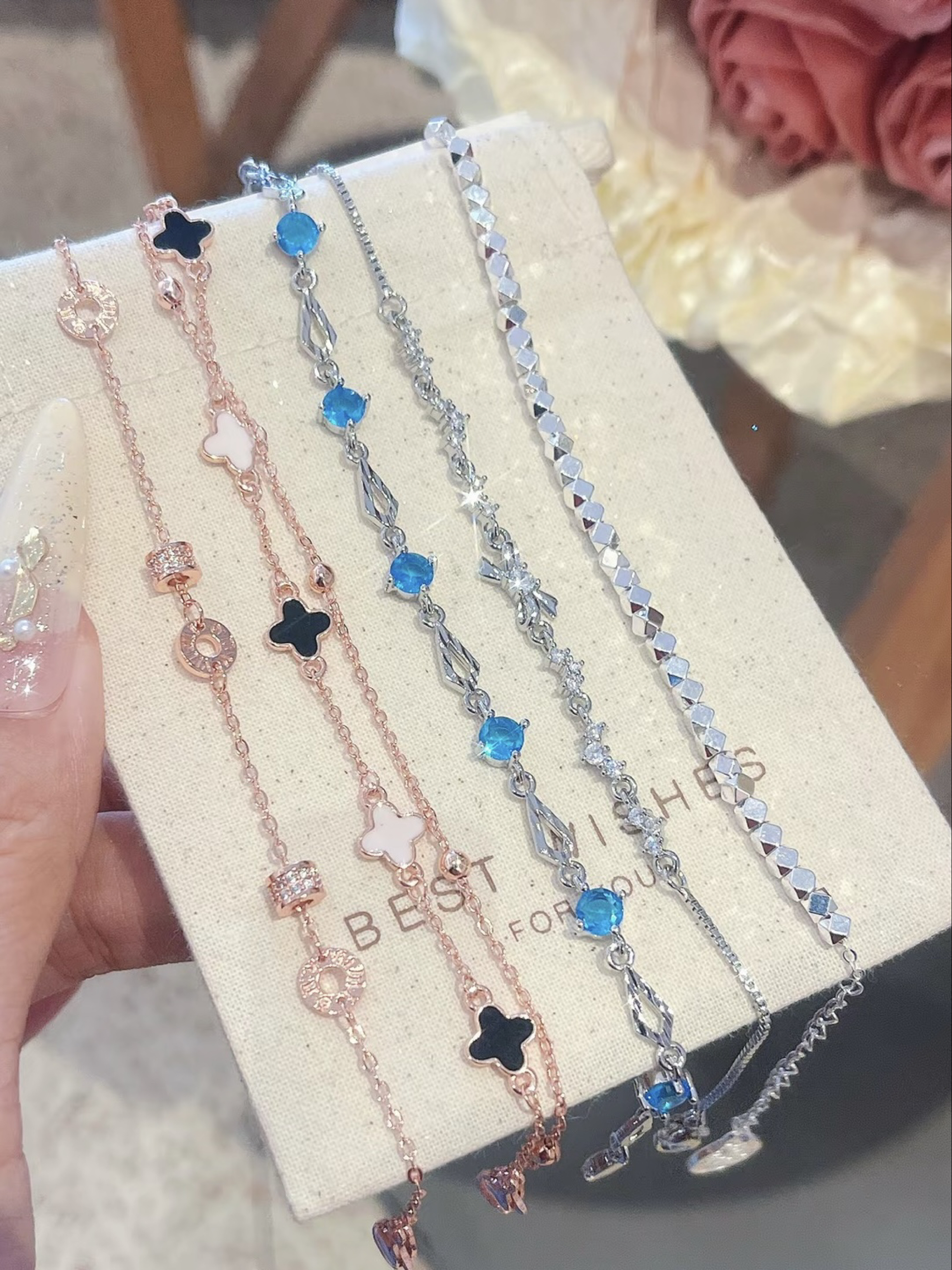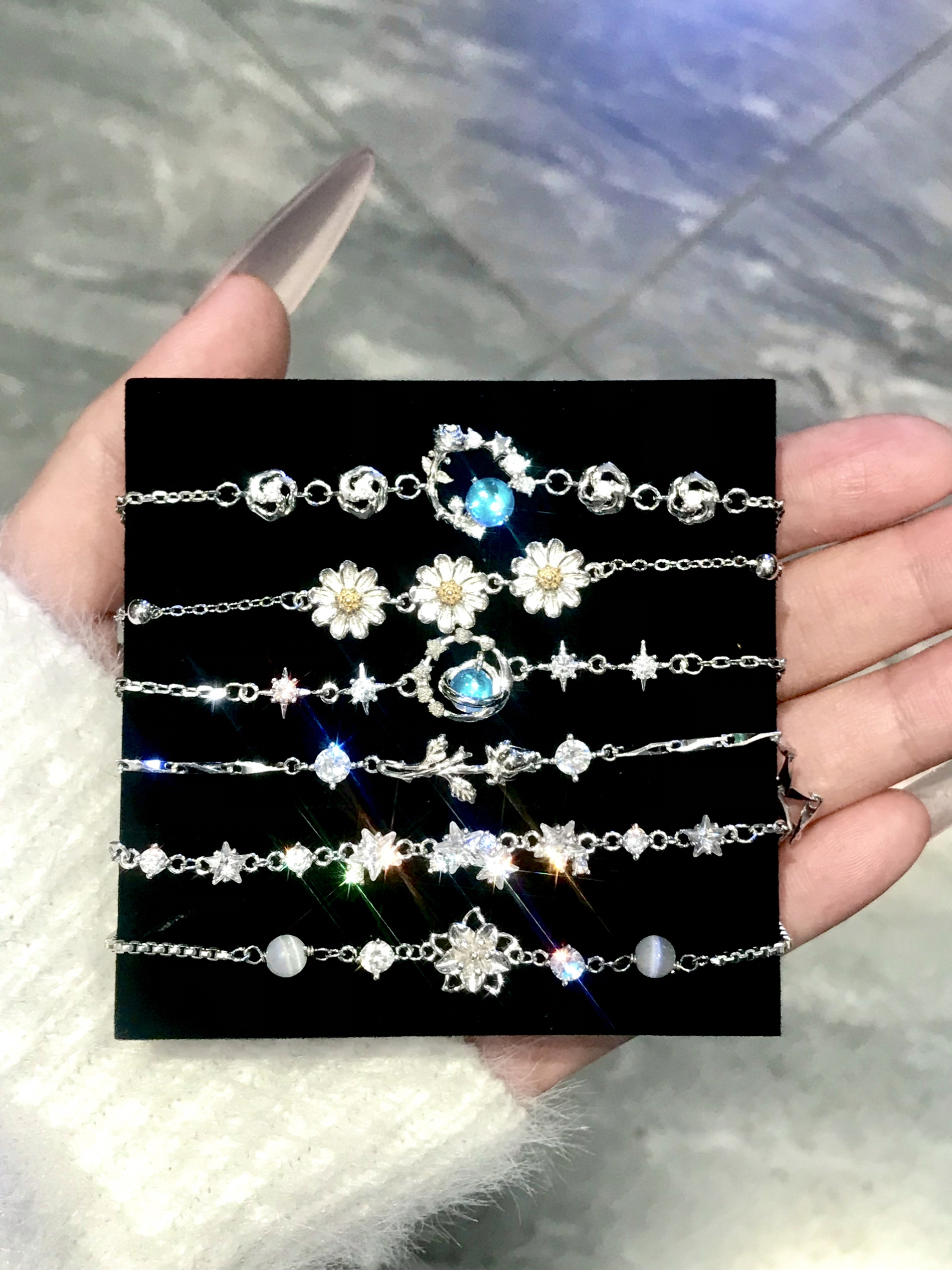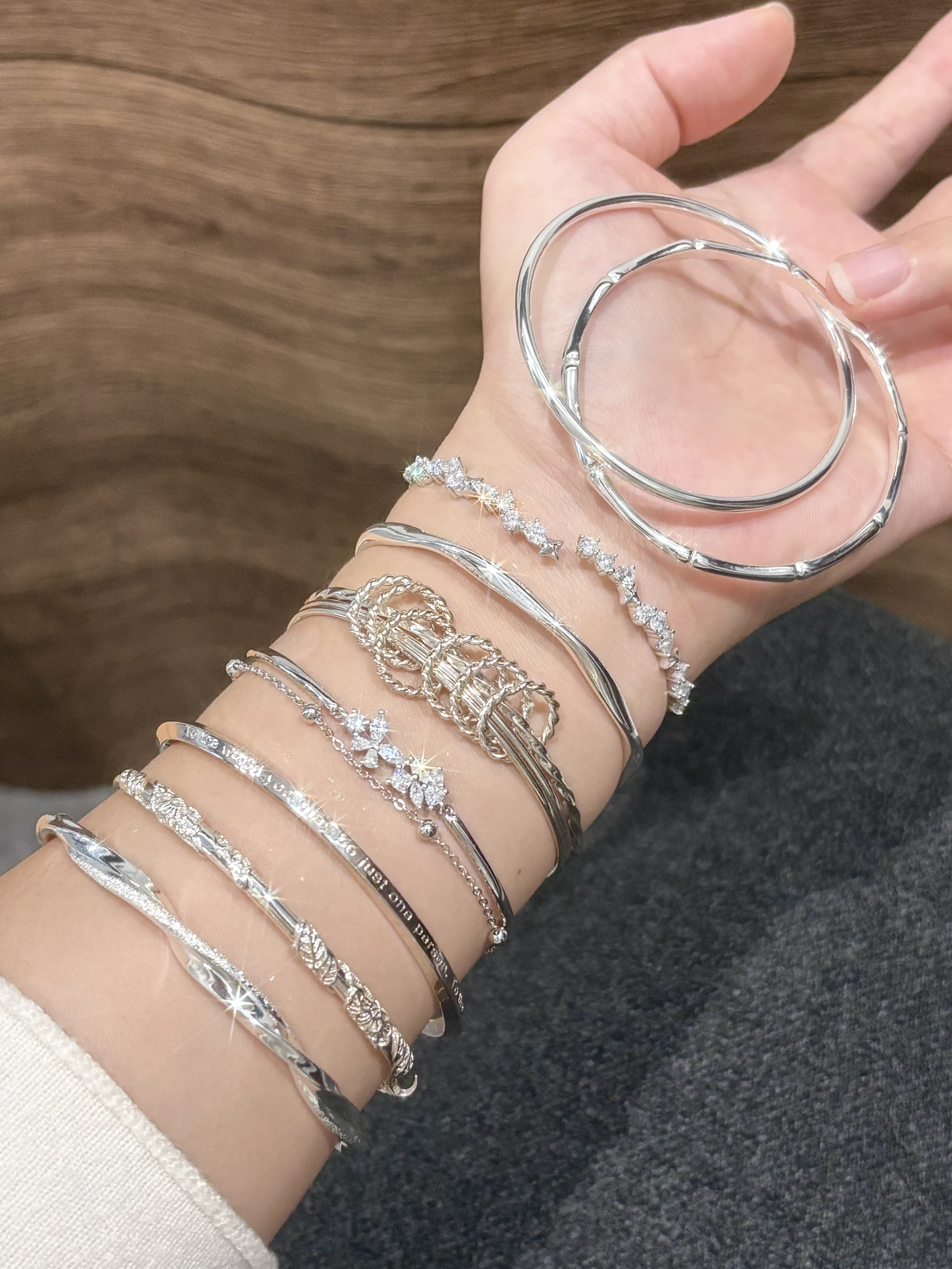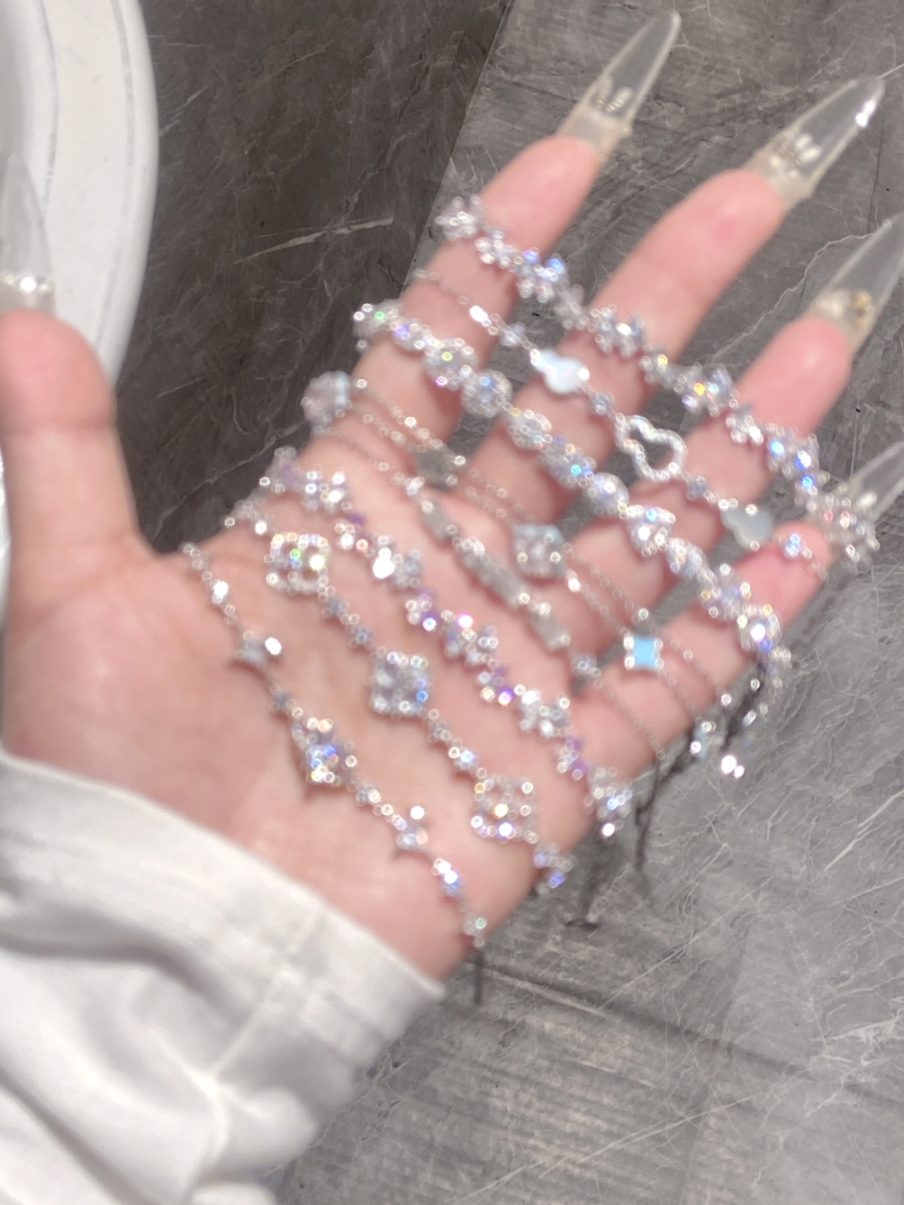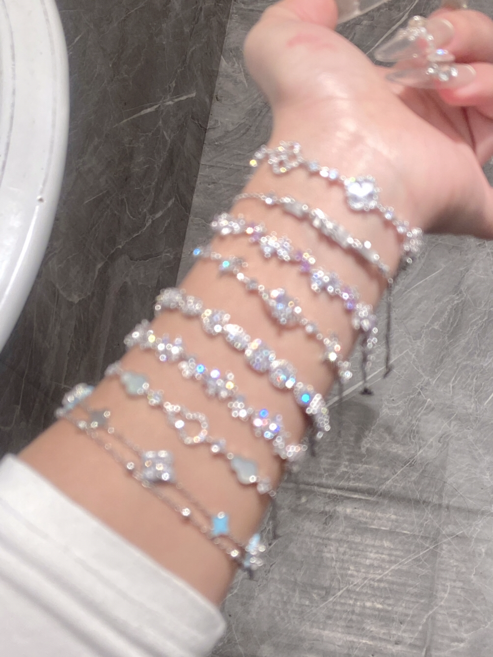家人们,快看看我这满手的亮晶晶✨手链 Blingbling的尊嘟泰戳我了 每一条都越看越好看,感觉想都收入囊中 我尊嘟好喜欢这些漂亮的手链 可以叠戴也可以单戴,日常随意搭配上一条都好有氛围感 约会戴上搭配我的小裙子好看又精致