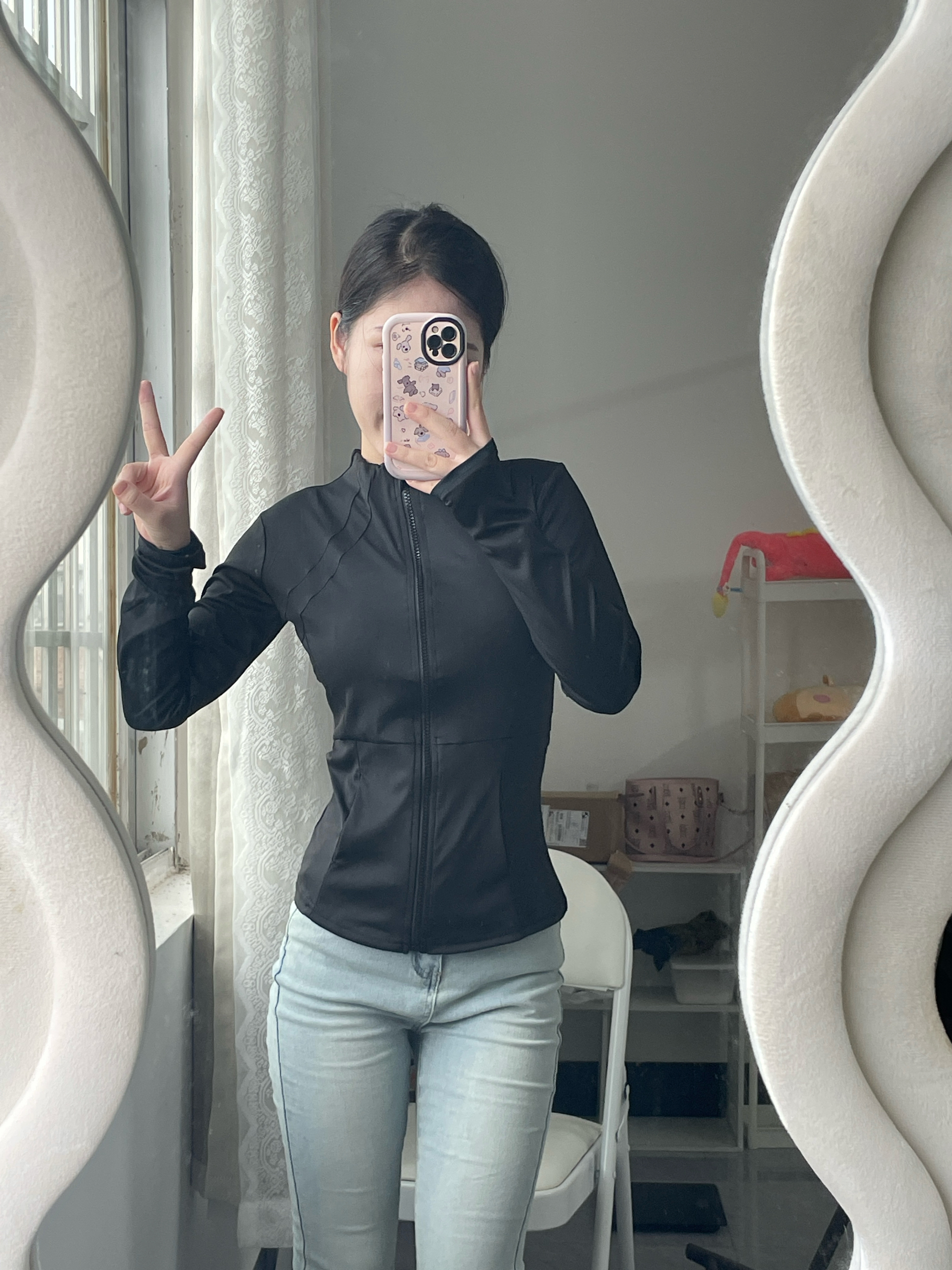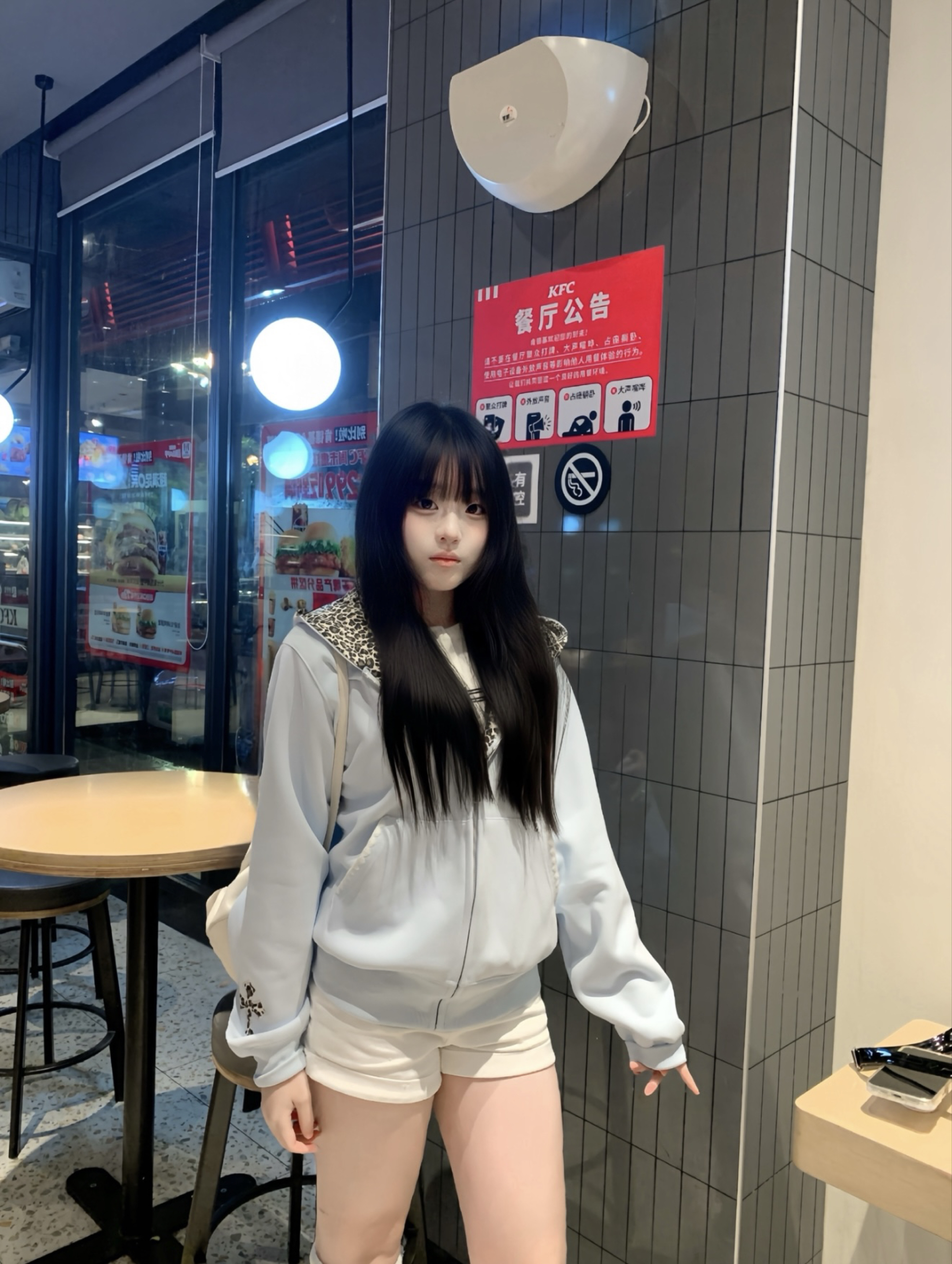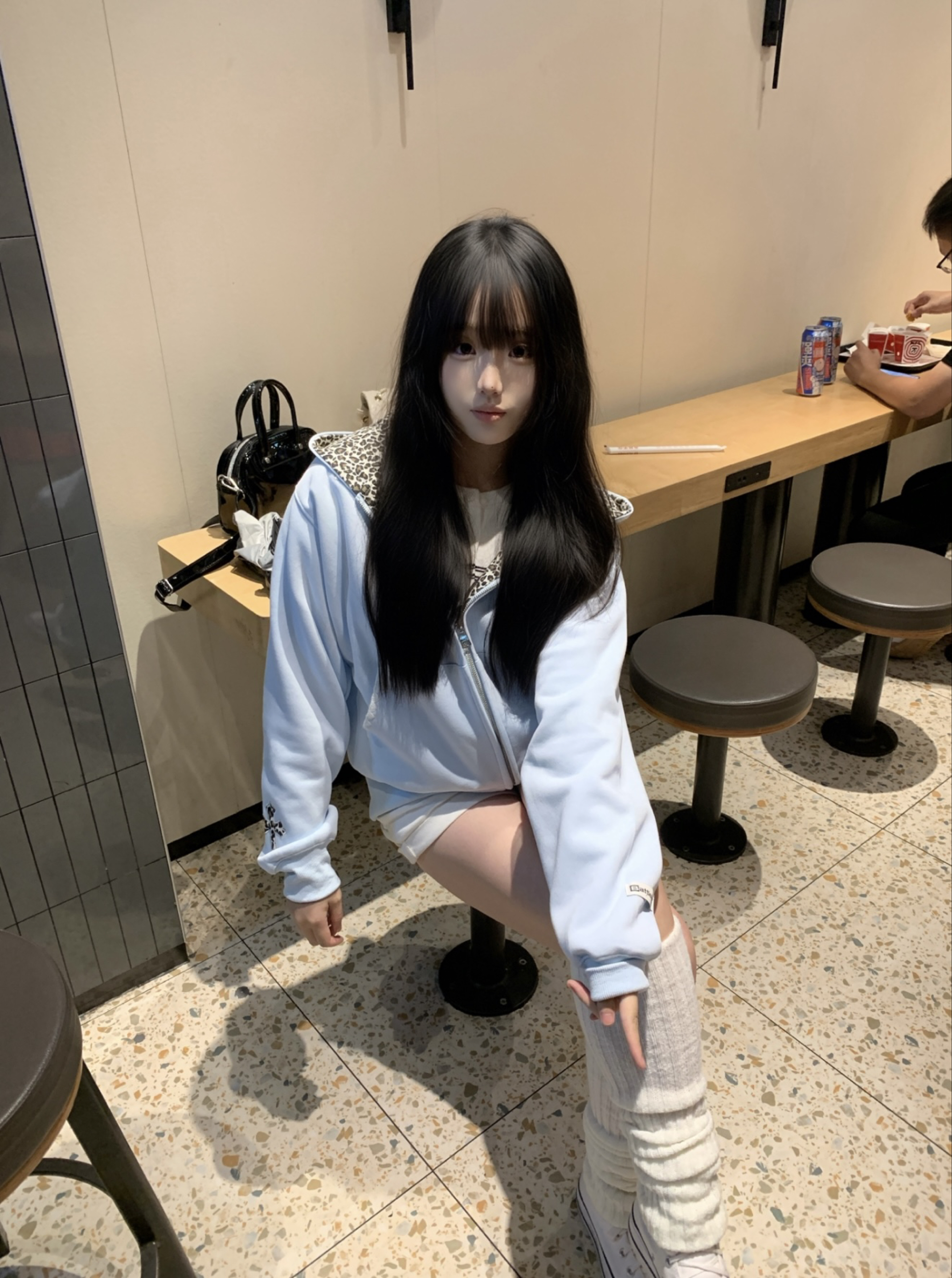 蓝色猫耳豹纹设计外套 搭配一条白色短裤 蓝白配色 韩系小清新感拿捏 小tips:腿袜很好的修饰了腿不直的状况 对小腿粗的姐妹敲友好~