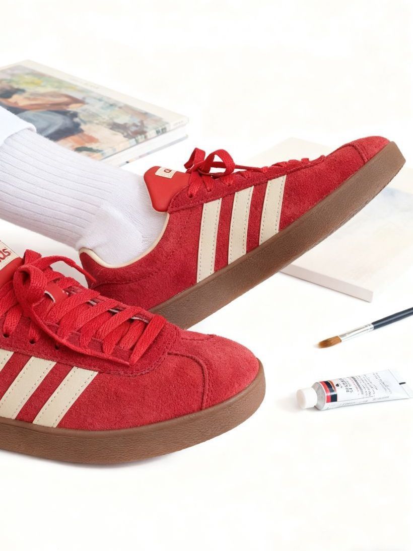 看腻了单调的灰白?这双VL COURT用 **「暖香草色」作底,「浅猩红」勾勒经典T头,亮「黄」点缀细节**,像一块行走的复古画布,轻松拿捏「不费力的高级感」。37码女生黄金尺码,手慢无!
