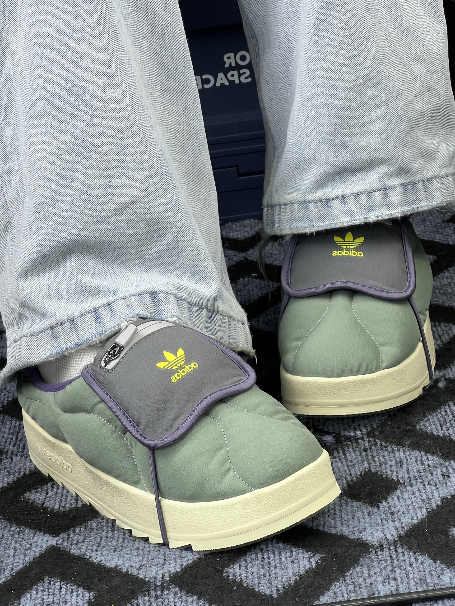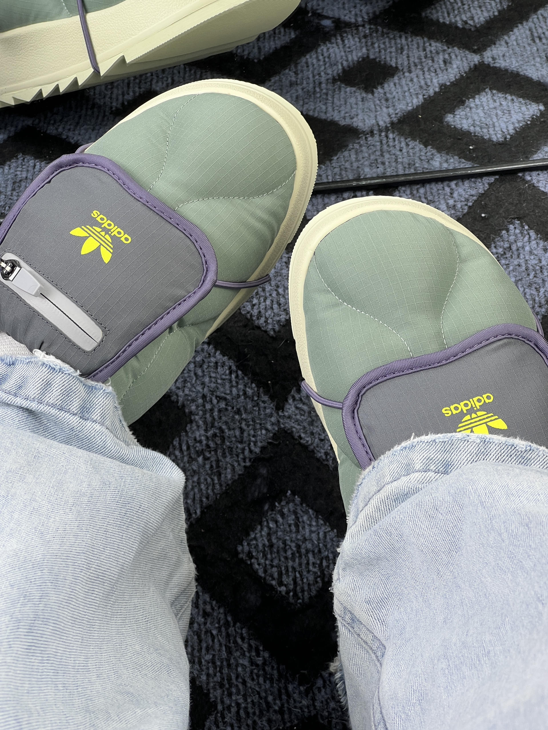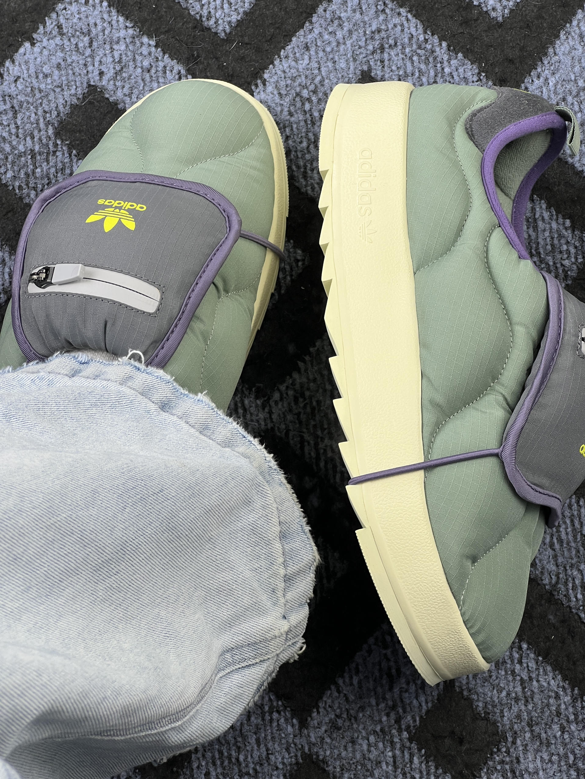 拿到这双Adidas Originals Puffylette 1E 低帮鞋,第一感觉是“轻”—比想象中软乎乎的面包鞋要轻便不少,日常出门装包里也没负担。 鞋面是那种带点纹理的轻薄面料,不像厚棉鞋闷脚,春秋穿刚好,冬天在室内也不凉。鞋口的紫色包边是软绒的,踩进去不磨脚踝,懒人拉链设计不用弯腰系鞋带,赶时间出门很顺手。厚底但不沉,走路时脚掌能感觉到点回弹,不会像硬底鞋走久了累。颜色是低饱和的灰绿调...